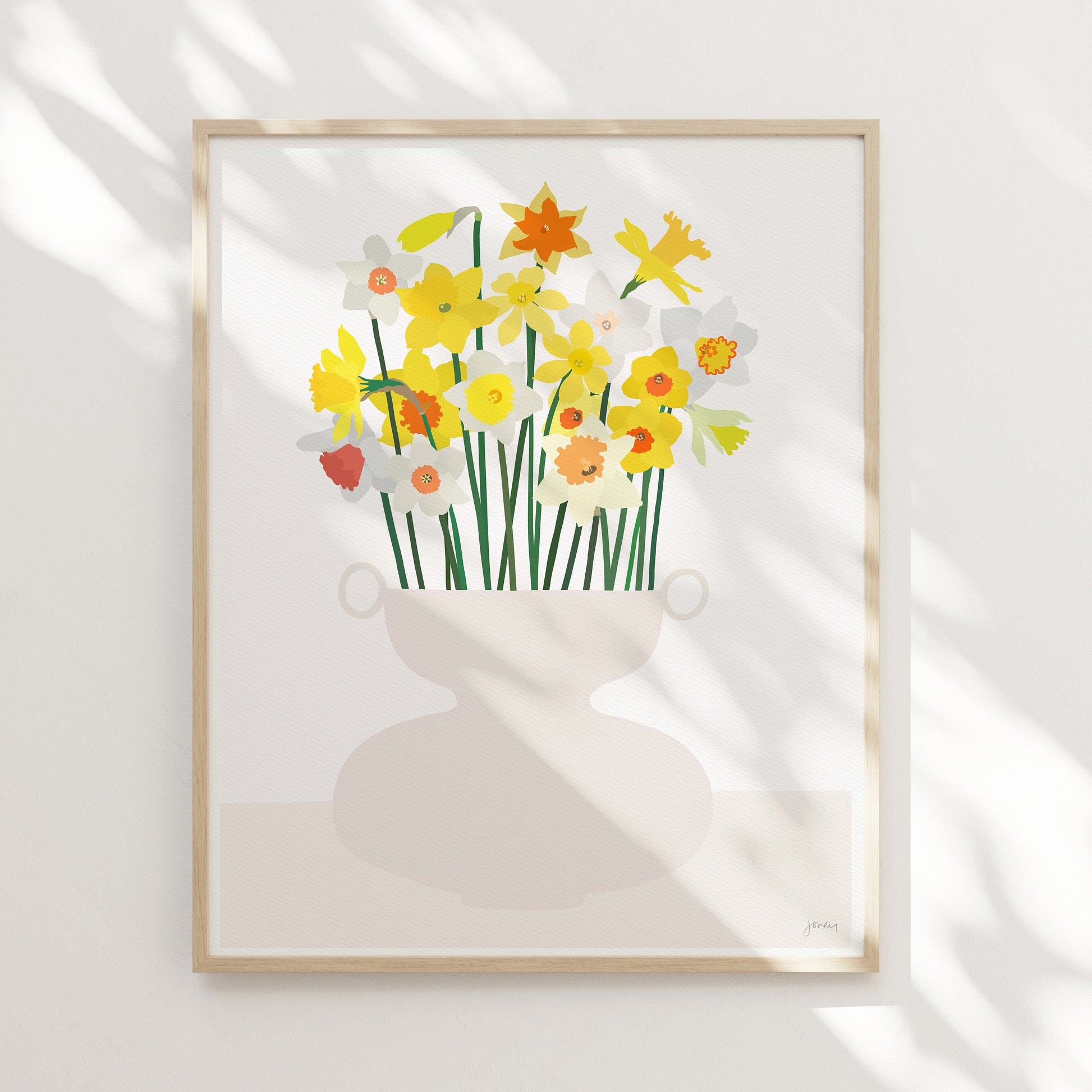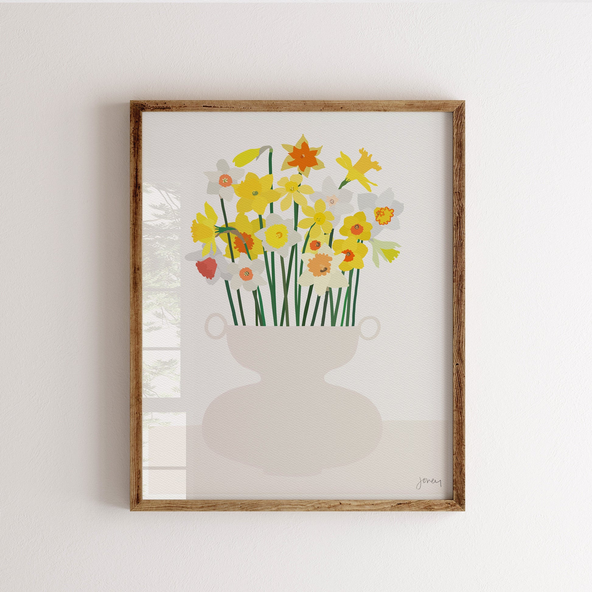 Immerse yourself in the charm of blooming daffodils through this "Vase of Daffodils Art Print." Ideal for flower enthusiasts, nature lovers, and those seeking to bring the pop of color to their space.