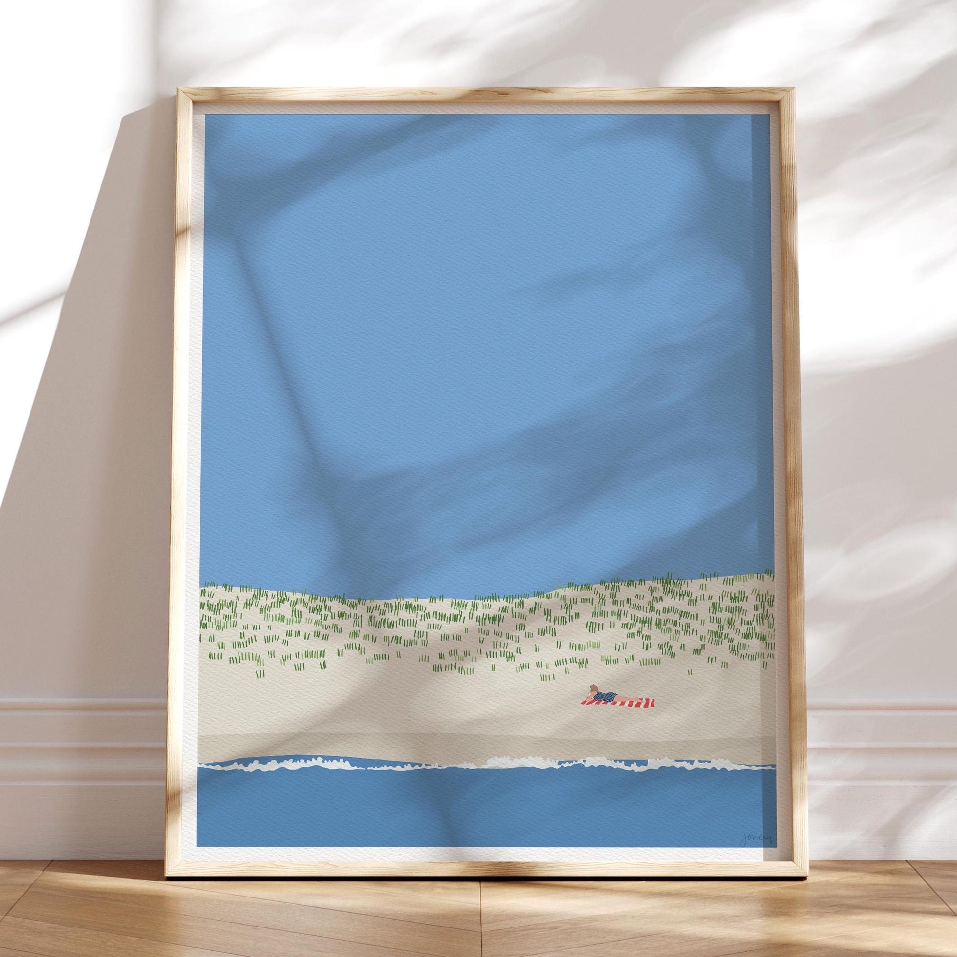 Capture the tranquility of a sunny afternoon with my "Beach Reading" art print. Inspired by watching my daughter engrossed in a book on a striped blanket at our favorite beach, this artwork captures the warmth and serenity of a quiet summer moment.