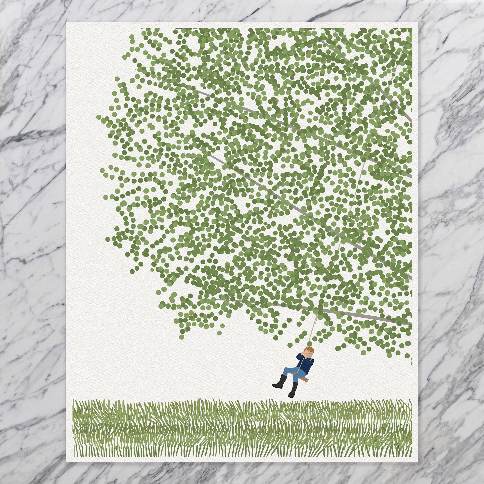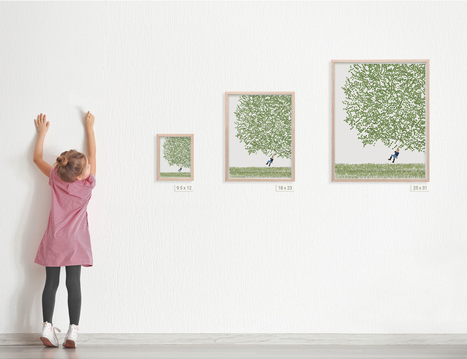 Invite the calming beauty of a quiet hillside into your home with my "Birch Tree with Boy Swinging" art print, a timeless addition to any boy-themed decor.