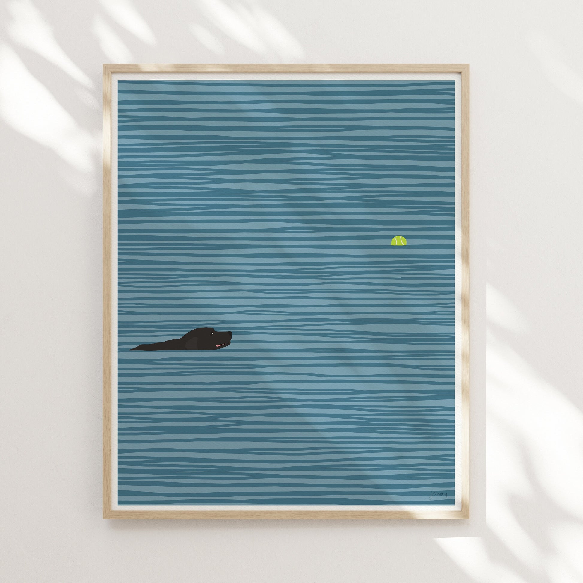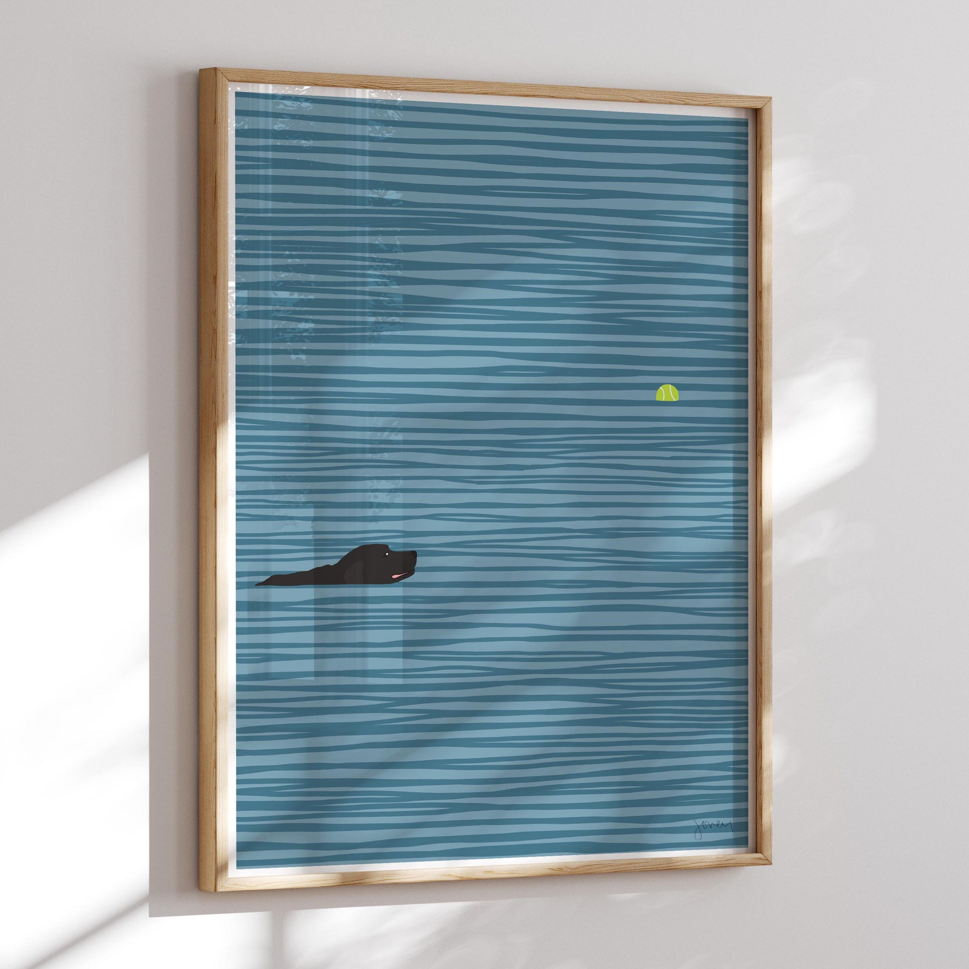 Celebrate the love for Labradors with our "Black Labrador Swimming after a Tennis Ball" art print, a heartwarming addition to any wall.