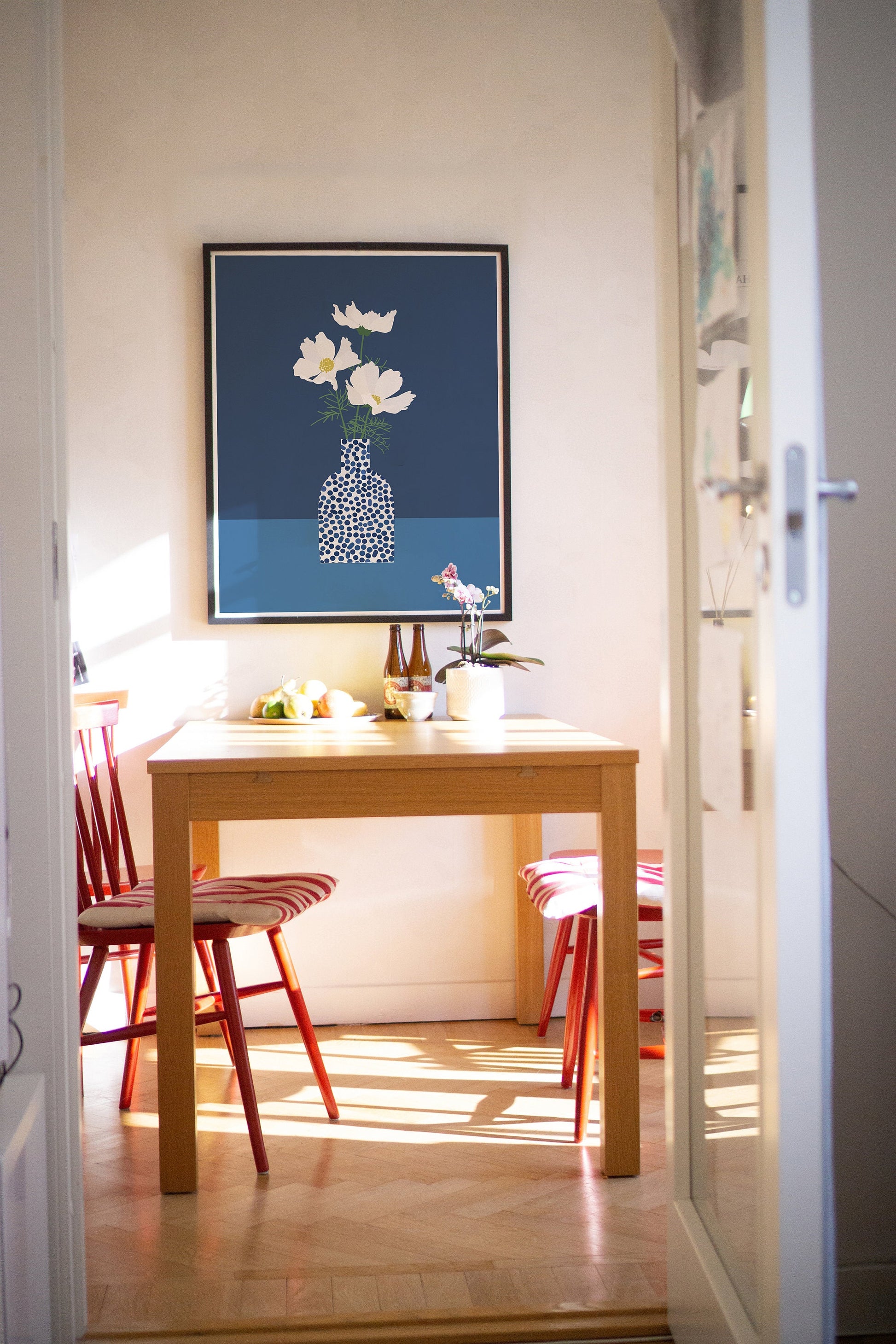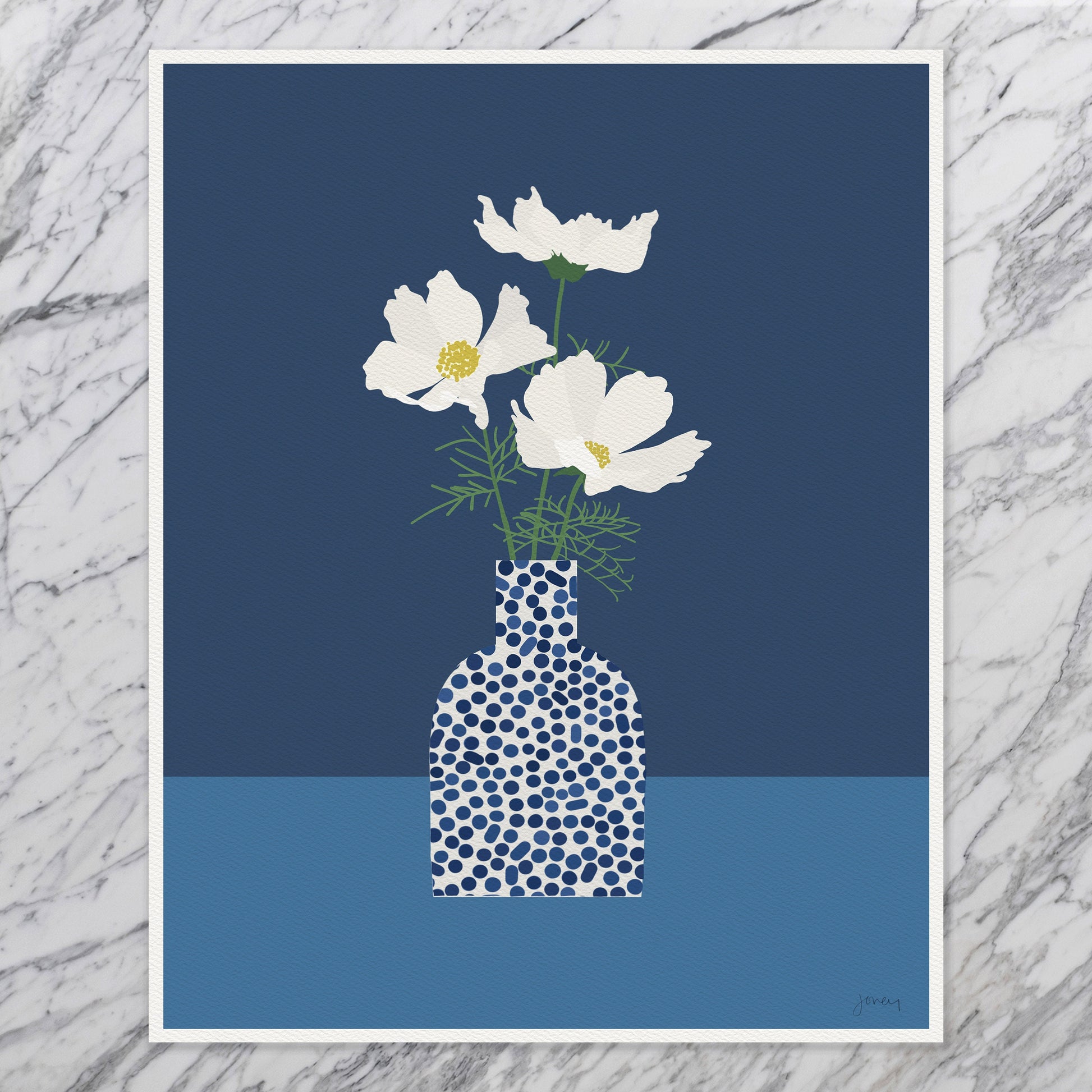 Bring joy and calm to your home with my Cosmos Flowers Art Print. Inspired by the delicate and tissue-paper like quality of summertime Cosmos flowers, I created this piece to capture the crisp blue and white color palette of the vase in contrast with the soft, billowy petals.