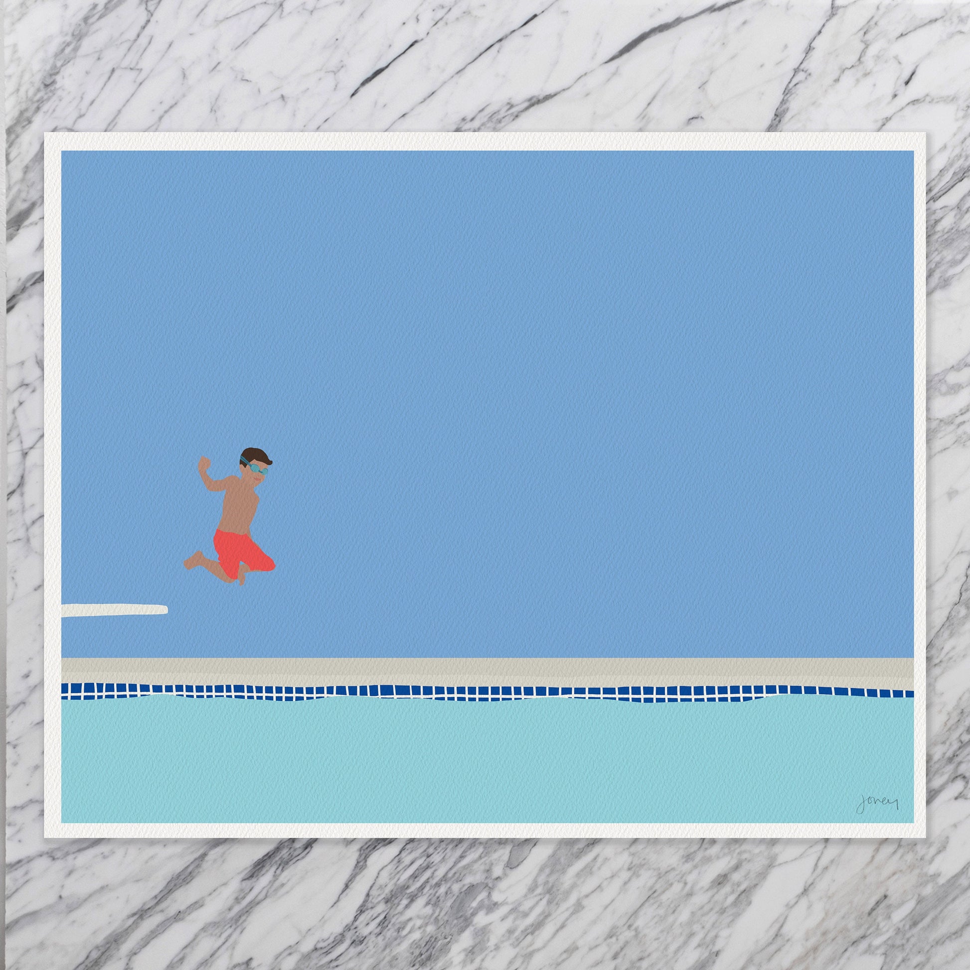 Dive into the joy of childhood with our 'Boy Jumping into Pool' art print. This lively piece captures the exhilarating moment of a child's leap into the pool, radiating with the spirit of fun and adventure.