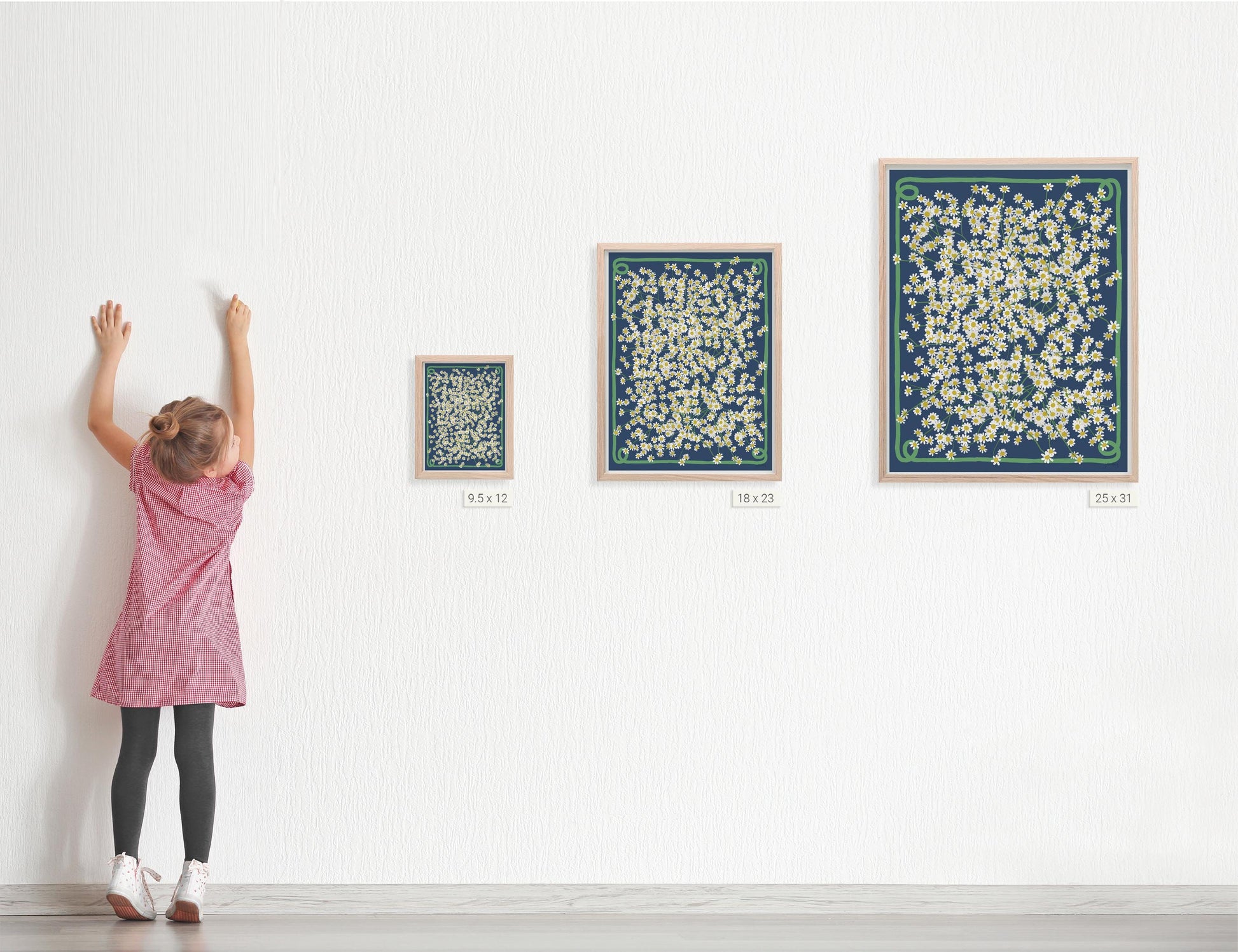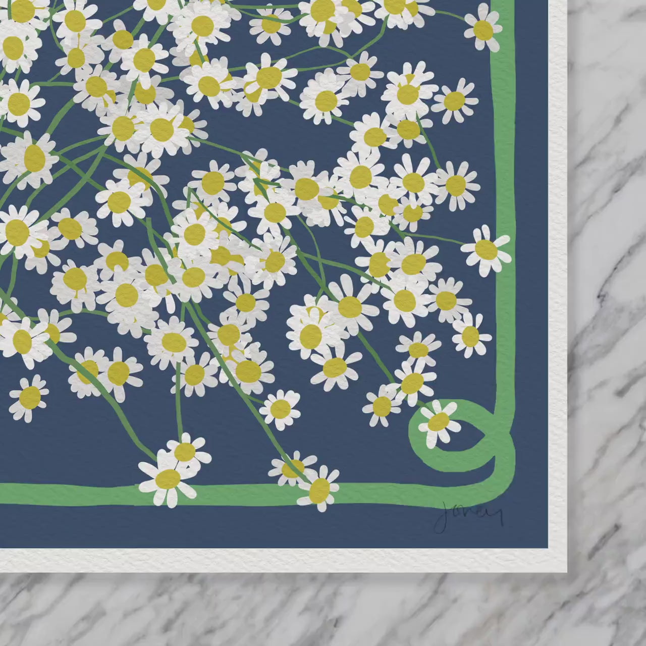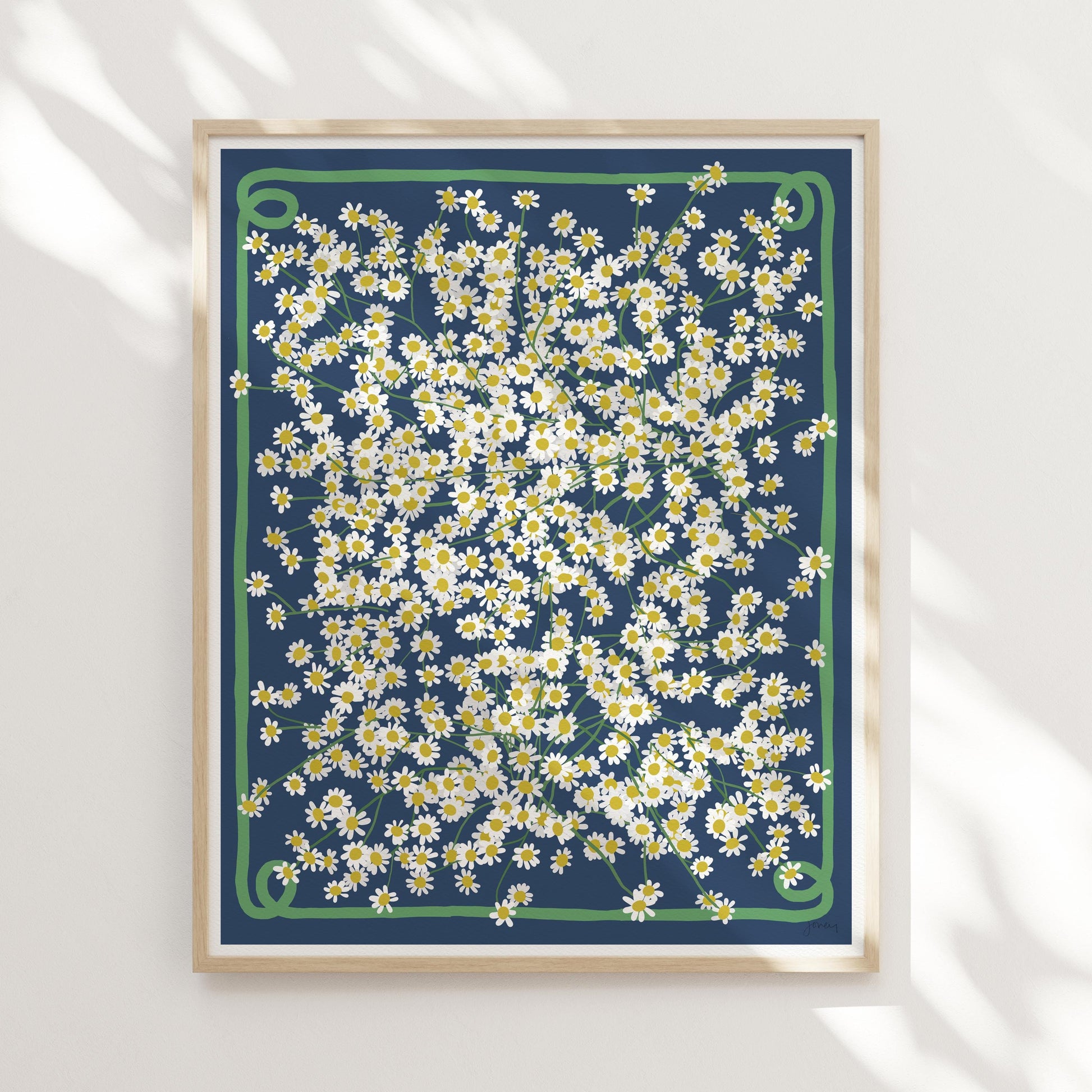 This Chamomile Field Art Print is cheerful and soothing, just like the flowers themselves and nice cup of chamomile tea. I will make your print to order in my studio. I print on heavyweight cold press paper using archival inks and sign the bottom corner of every print. The 8x10 and 16x20 inch unframed prints are sized to fit the openings of standard ready-made frames. For framed pieces, I use frames made from sustainably-farmed solid maple and cover the art with framing-grade acrylic.