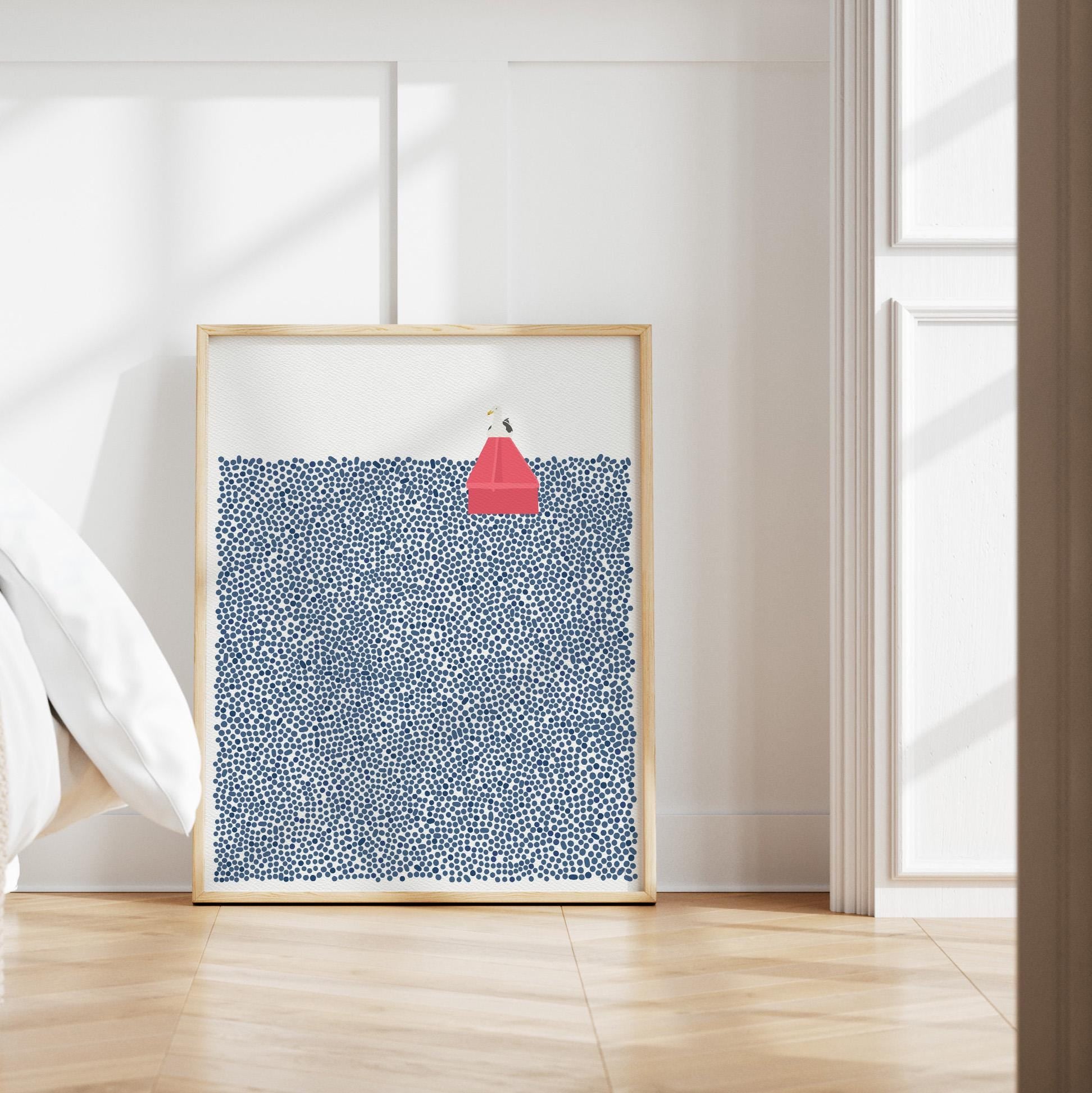 Add a touch of modern coastal charm to your home with the “Channel Marker with Seagull” art print.
