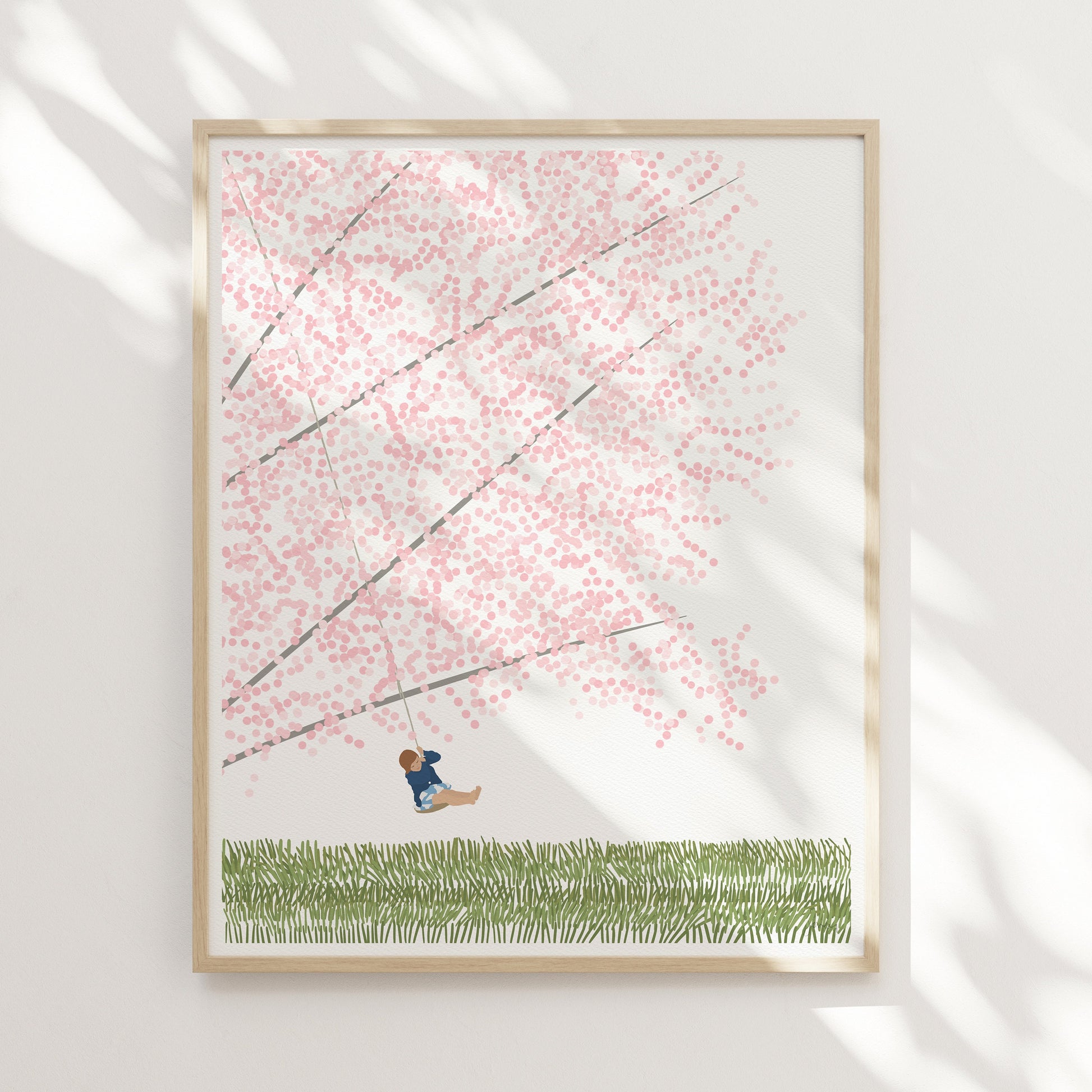 Bring the joy of childhood into your space with my Cherry Blossom Tree with Girl Swinging art print.