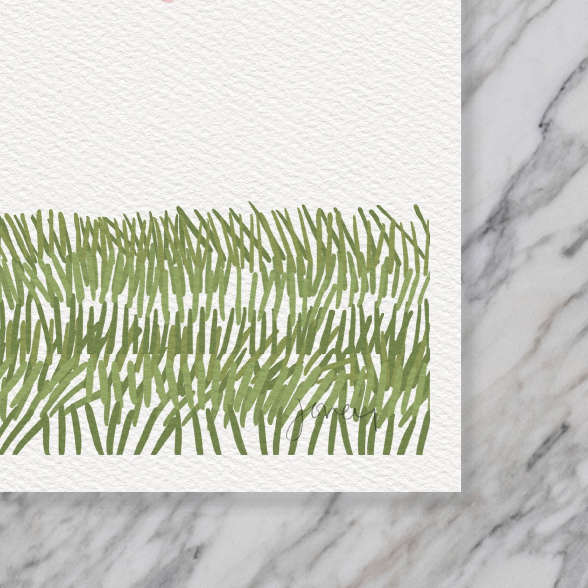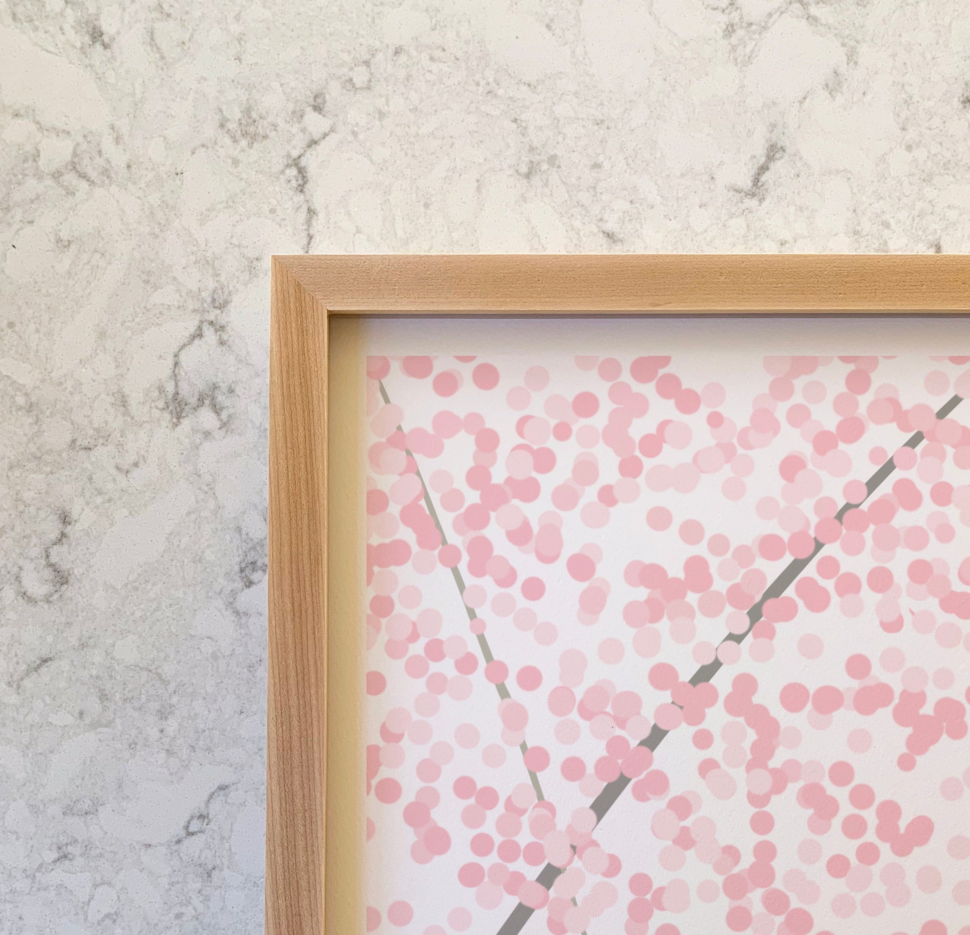 I print on heavyweight cold press paper using archival inks and sign the bottom corner of every print. For framed pieces, I use frames made from sustainably-farmed solid maple and cover the art with framing-grade acrylic.