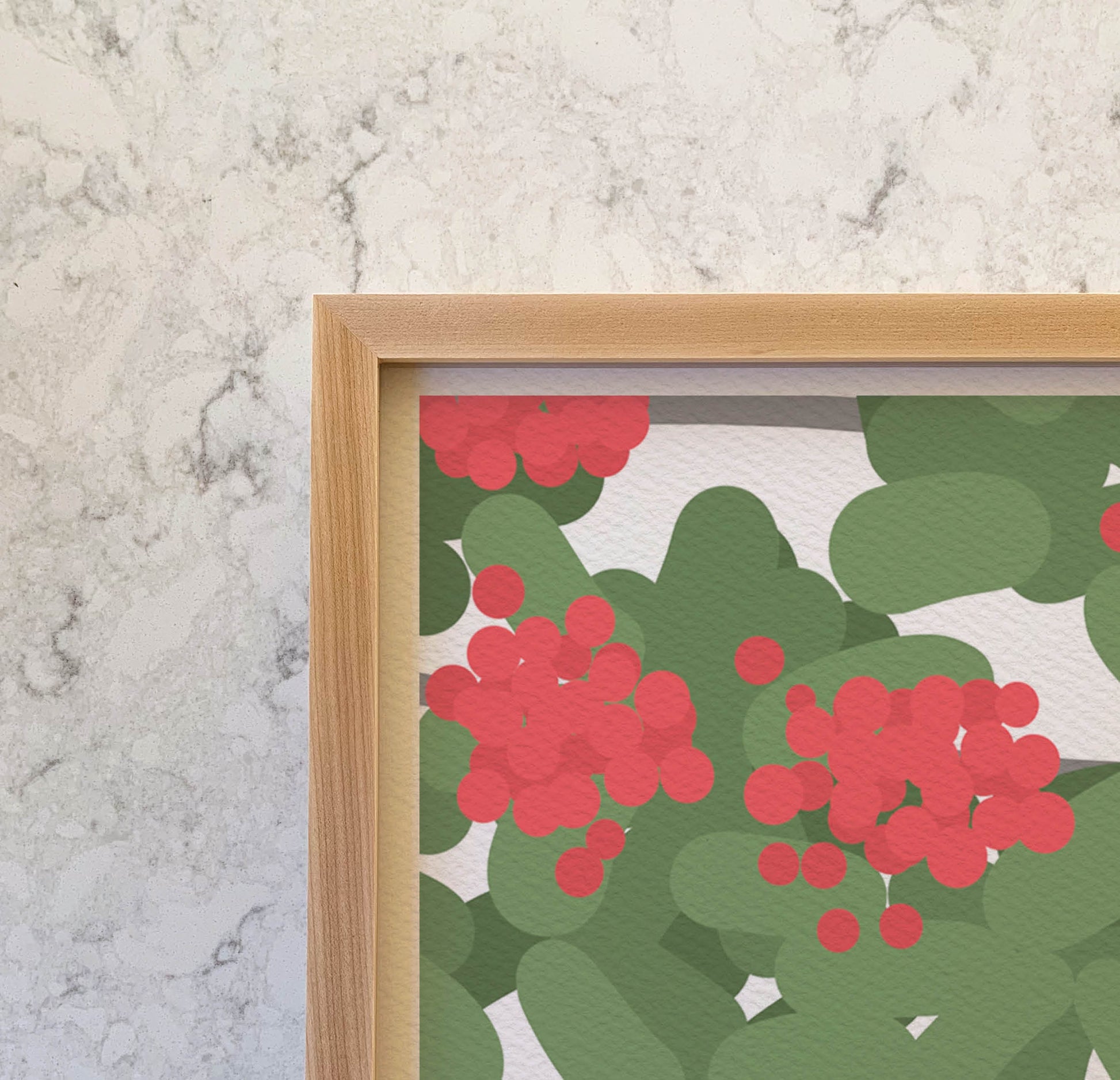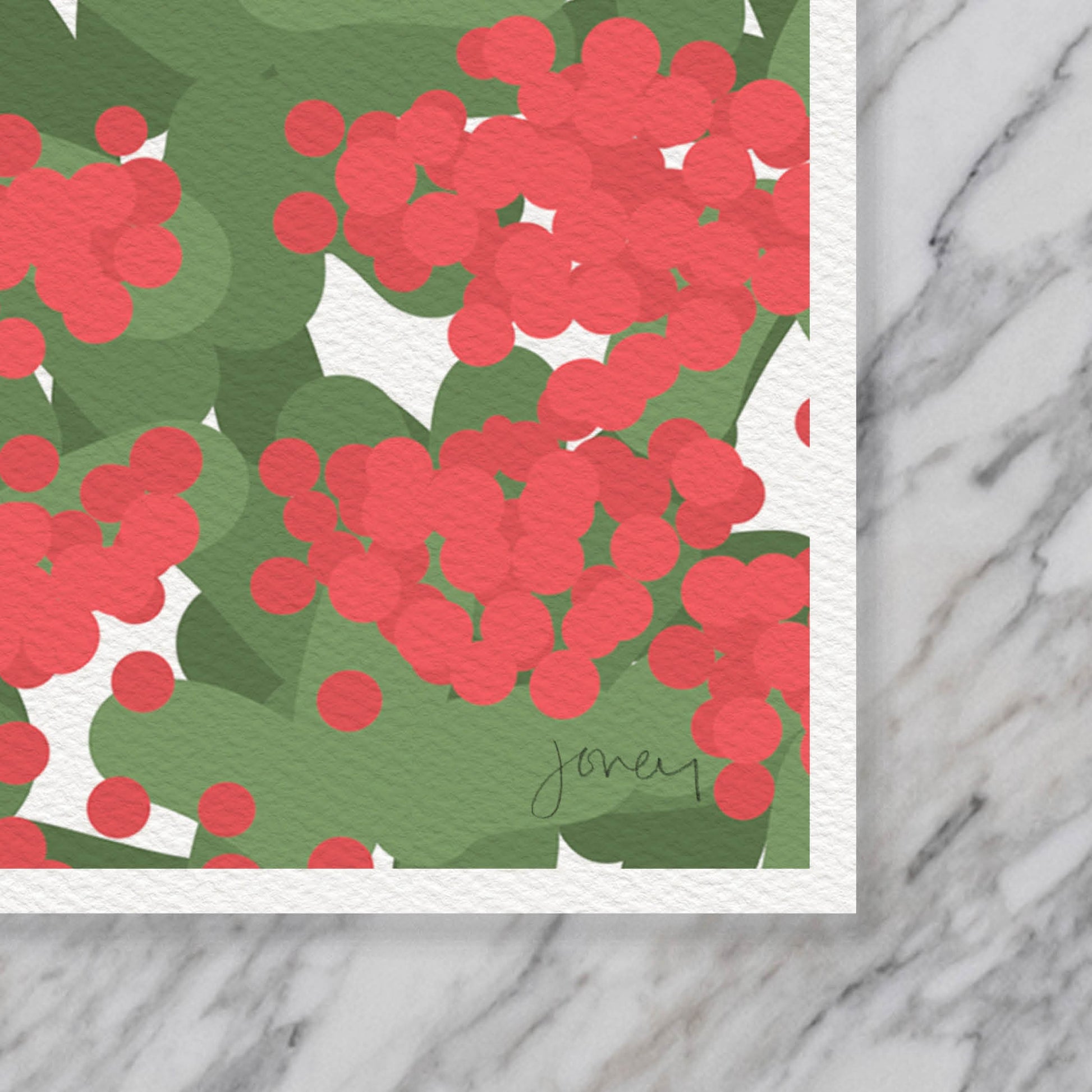 Visit close up with two charming birds with this Toyon Berries and Chickadees Art Print. Inspired by a Toyon bush near our previous home in the Presidio of San Francisco, this artwork brings to life the birds feasting on the berries.