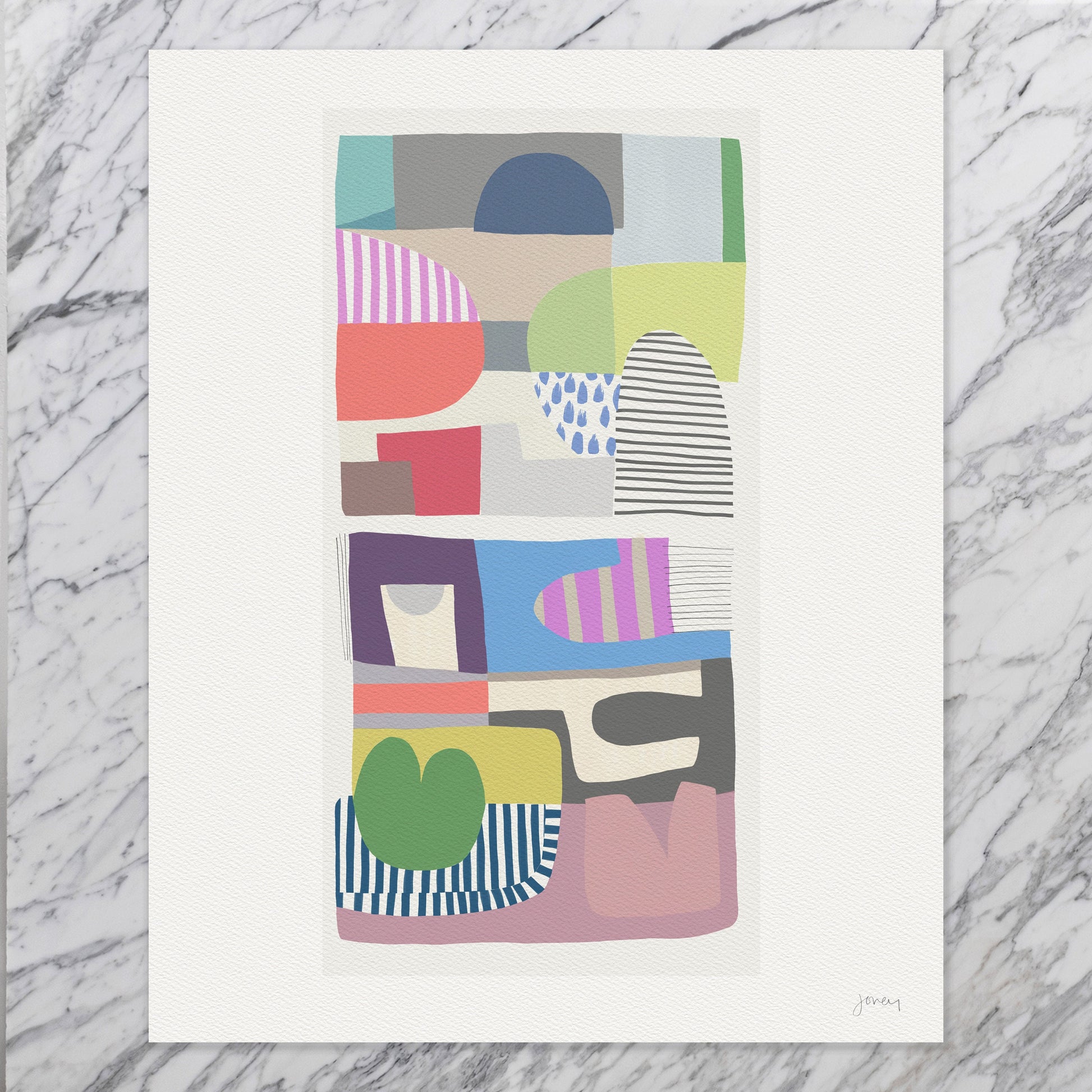 Immerse yourself in a vibrant world of colors and shapes with my Colorful Shapes Abstract Art Print. Inspired by fun memories of creating paper cutouts with my family, this artwork captures the essence of those creative moments and brings them to life.