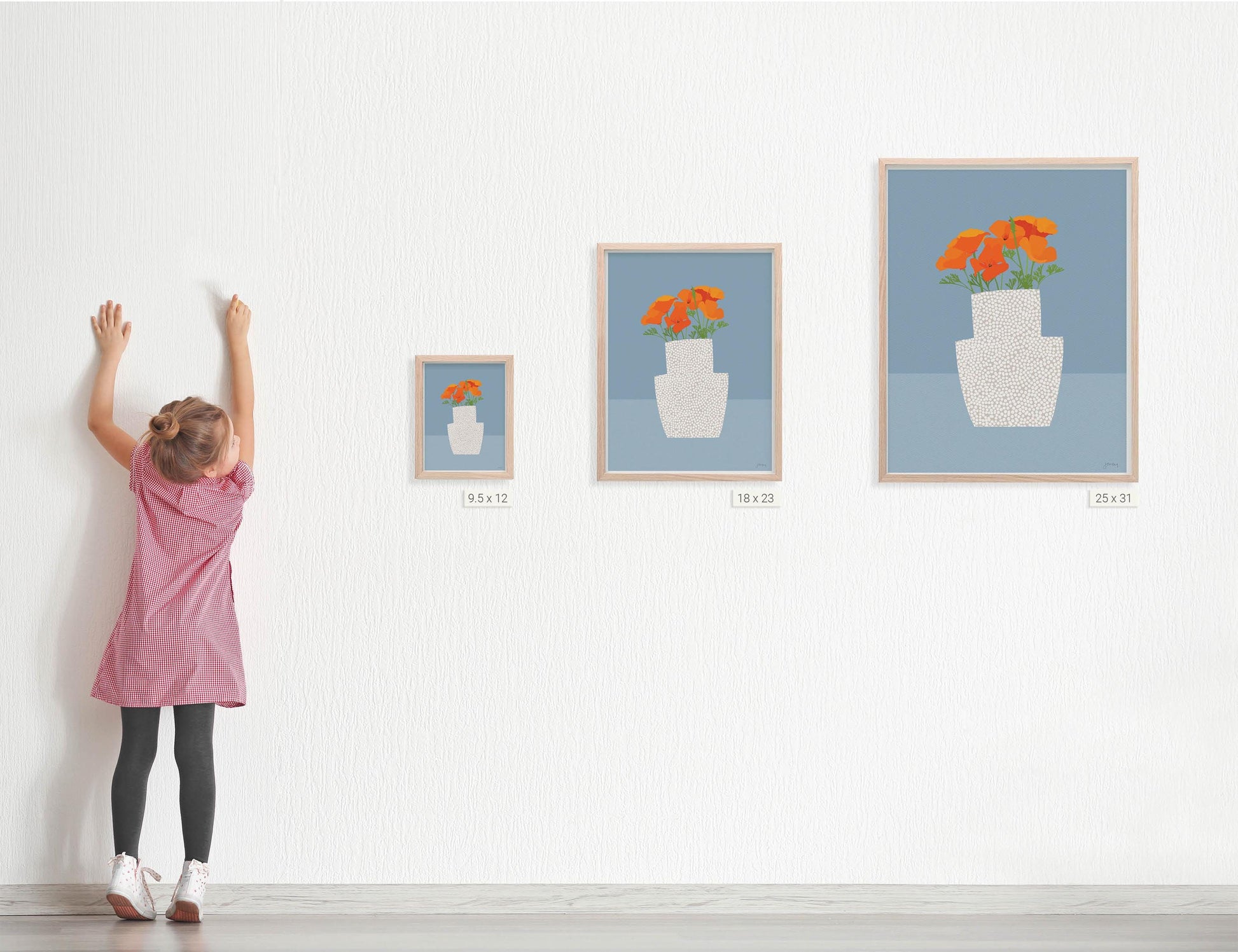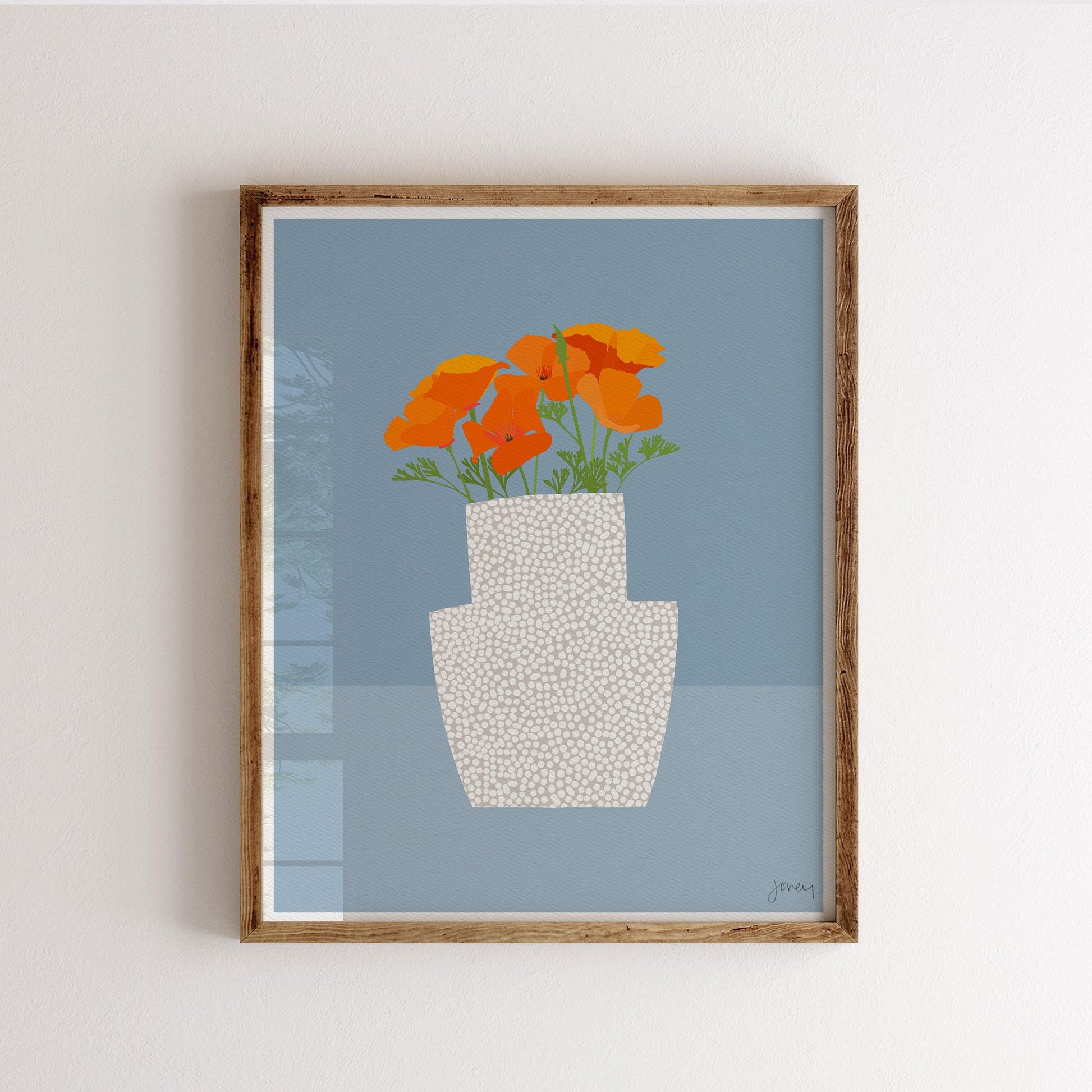Bring the Golden State to your space with my 'Dotted Vase with California Poppy' art print. Inspired by California's blue skies and wildflowers.