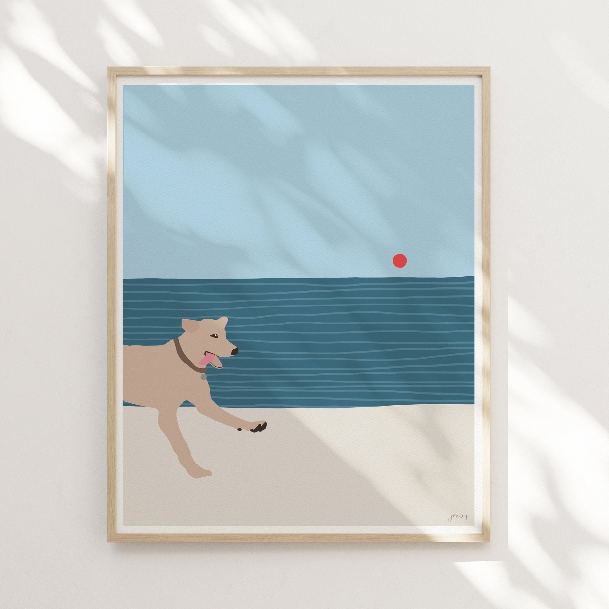 Enjoy the playful spirit of this happy yellow lab running after its ball on the beach. Derived from my second children's book, "Fetch," published by Simon & Schuster in 2015, this artwork captures a timeless moment of bliss.