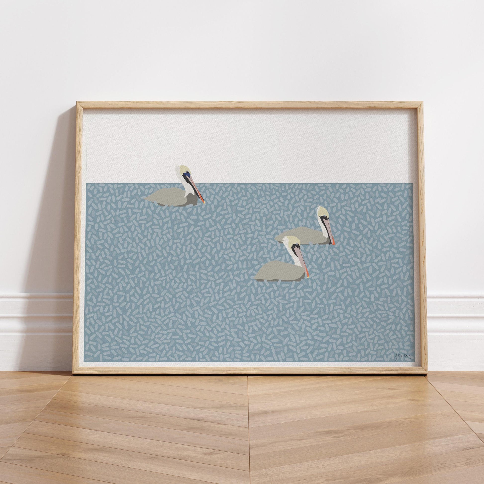 Bring the calming beauty of the sea into your home with the “Floating Pelicans” art print—a timeless reflection of nature's tranquility.