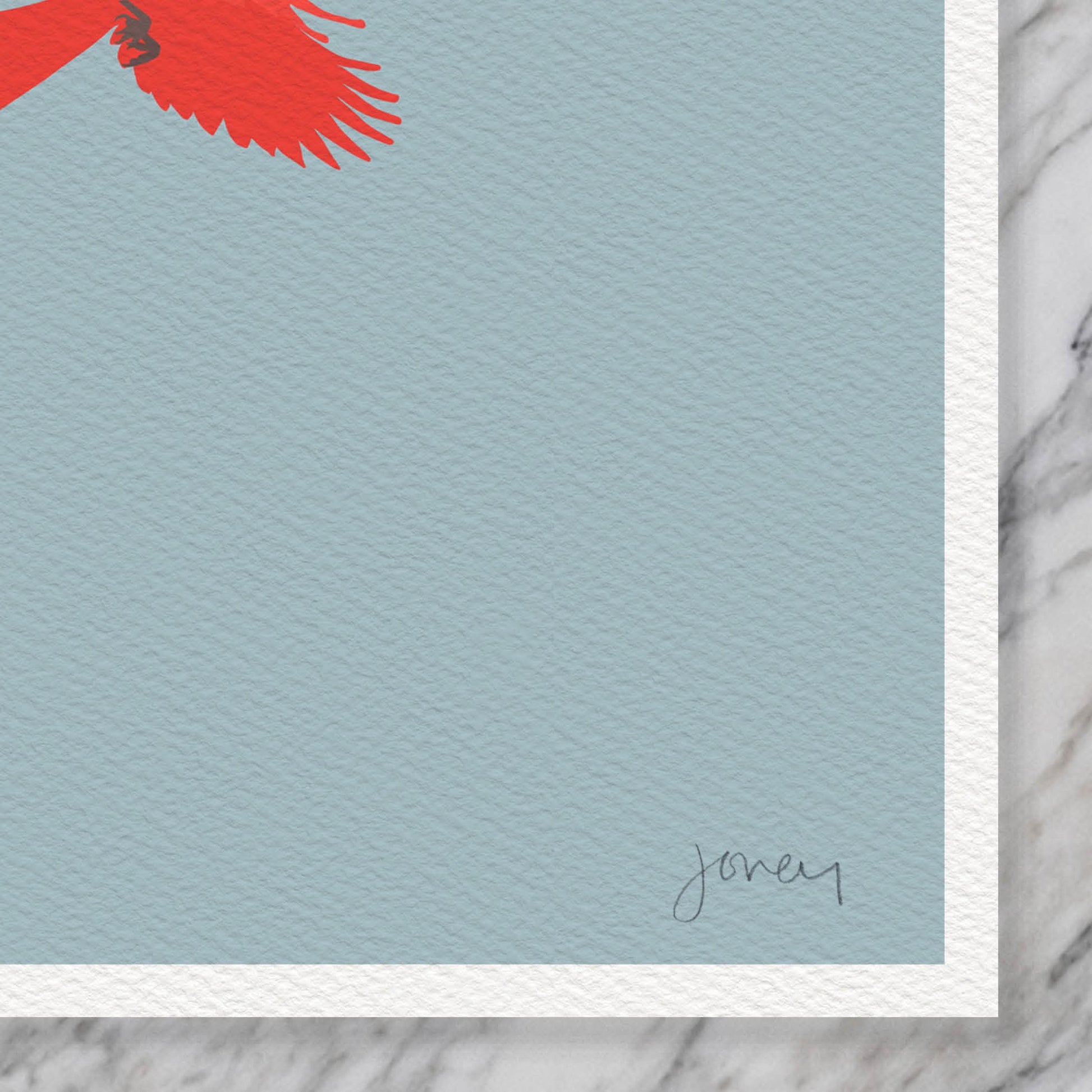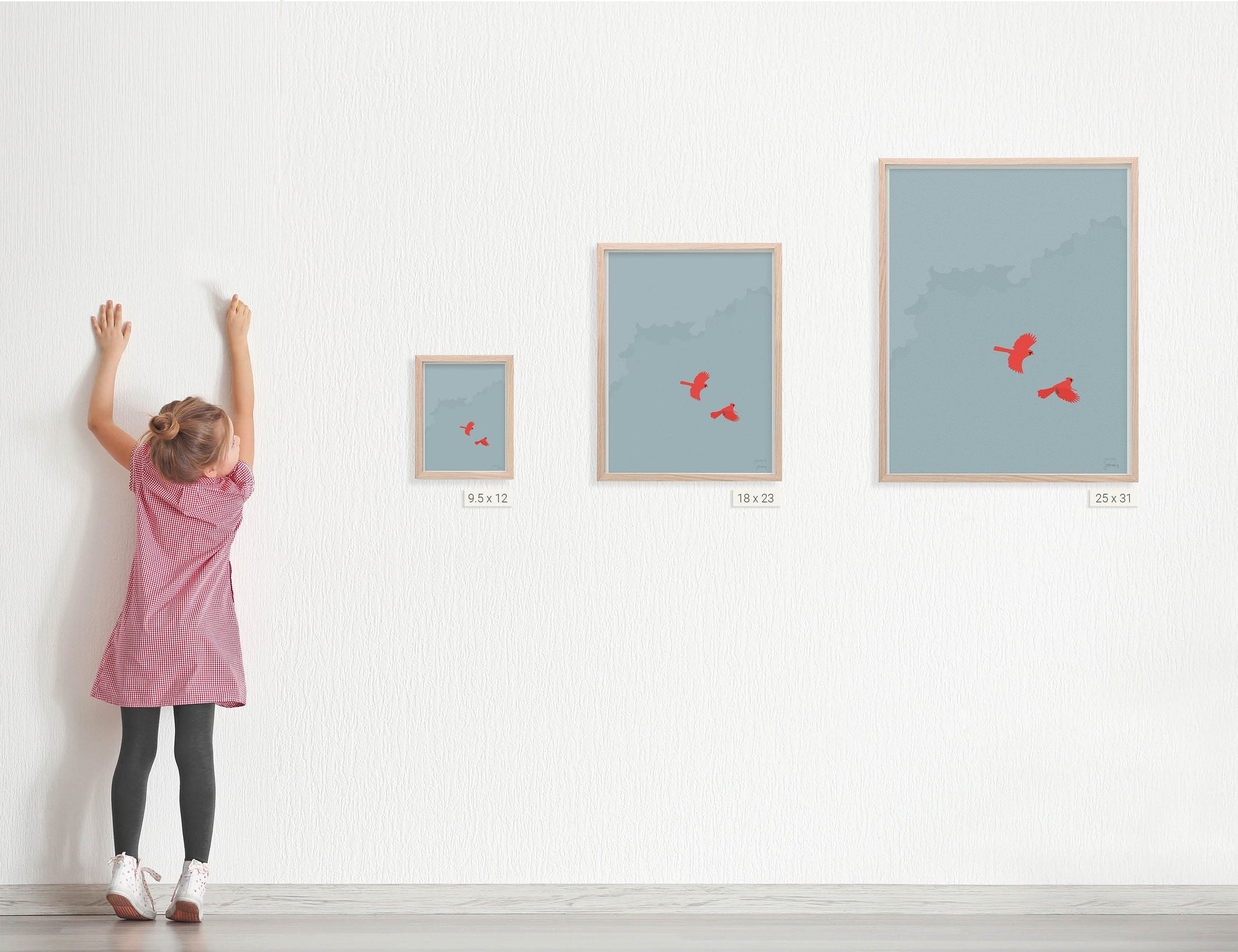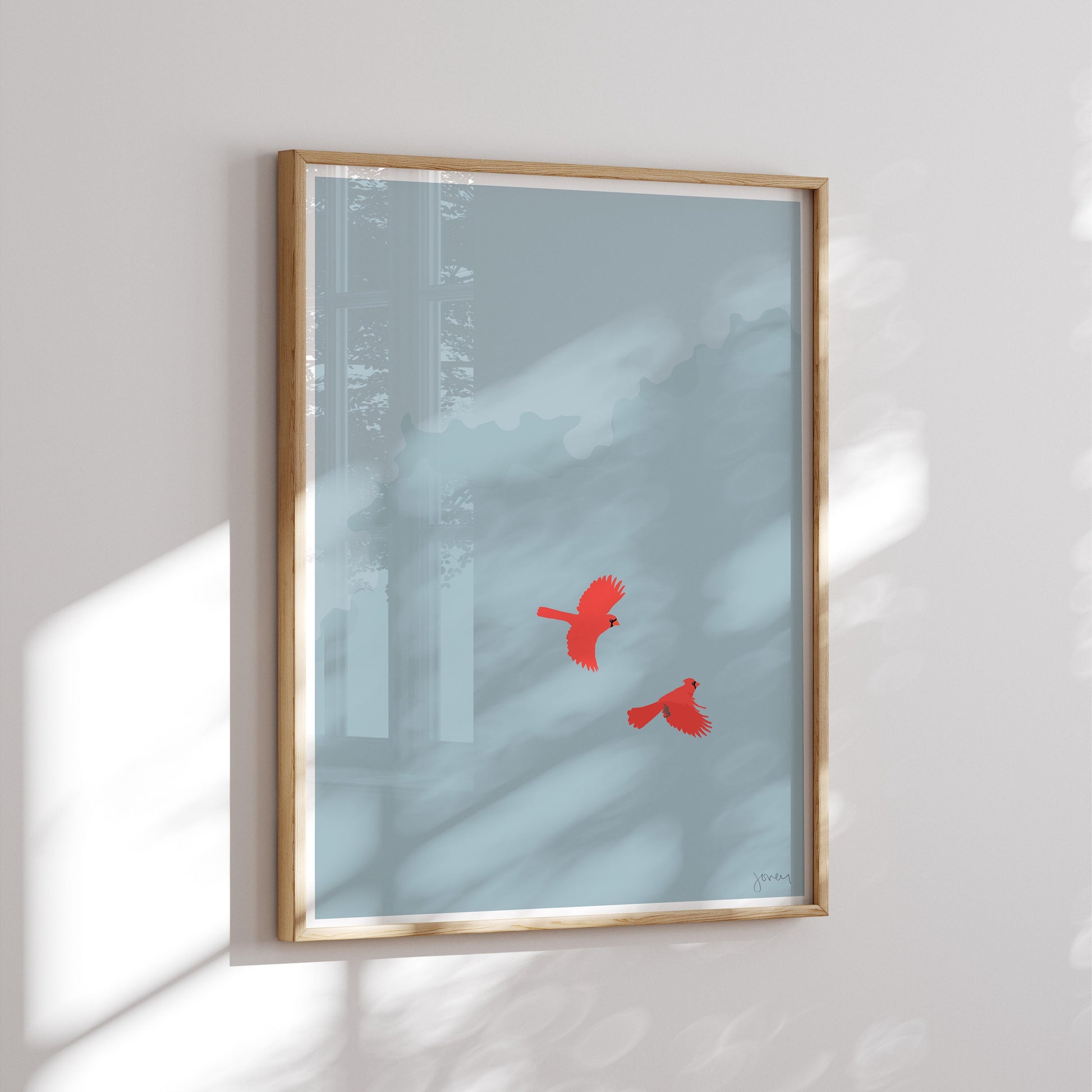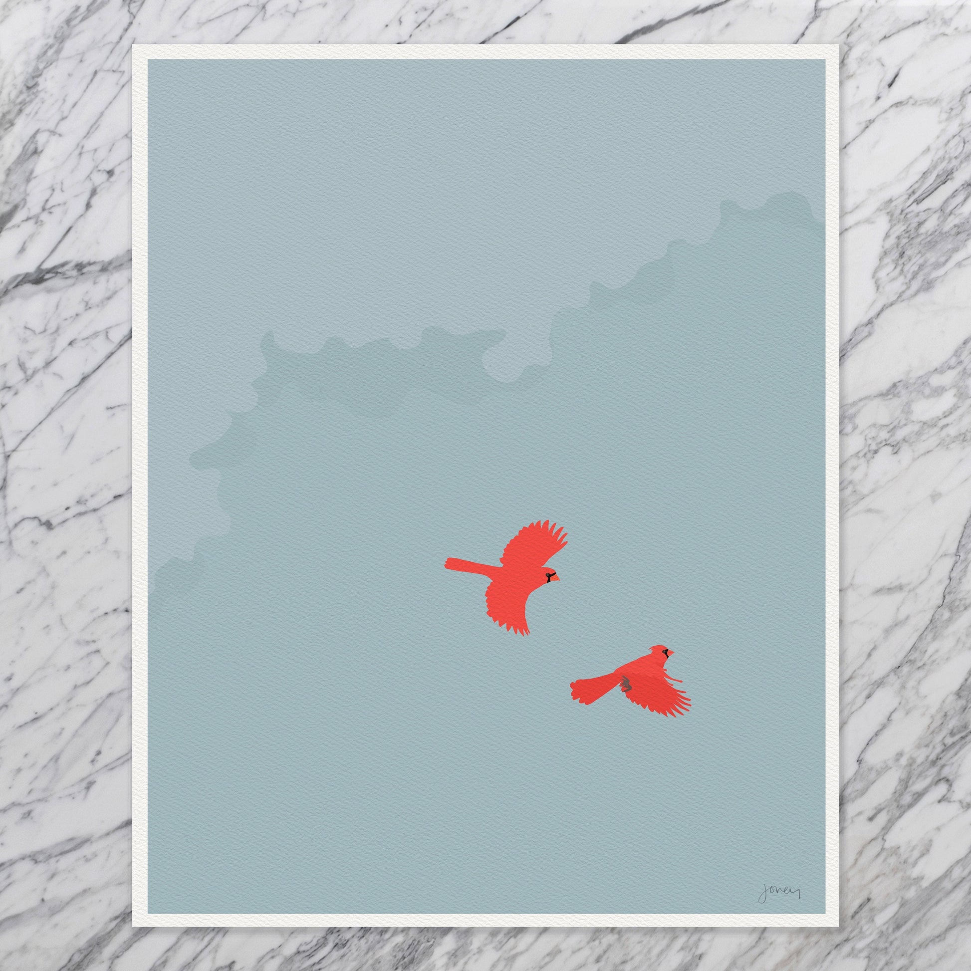 Bring joy to your space with these two red cardinals soaring into the clouds in my "Flying Cardinals" art print. Inspired by the graceful presence of a cardinal perched in the branches of our birch tree.
