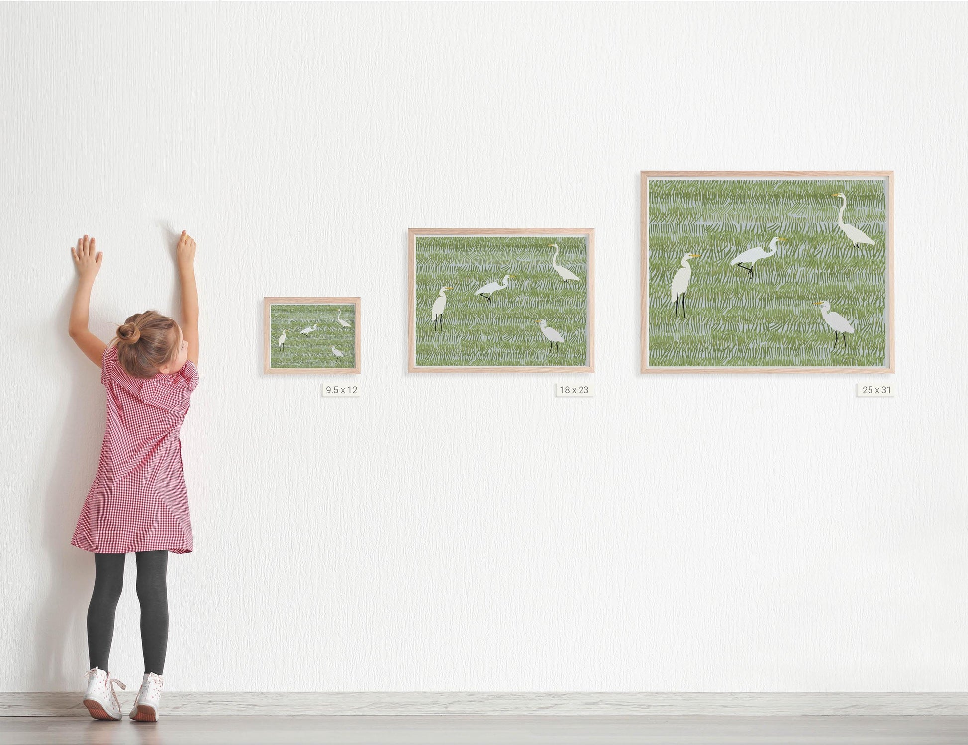 Invite the serene beauty of coastal wetlands into your home with my "Four Egrets" art print, a timeless addition to any art collection.