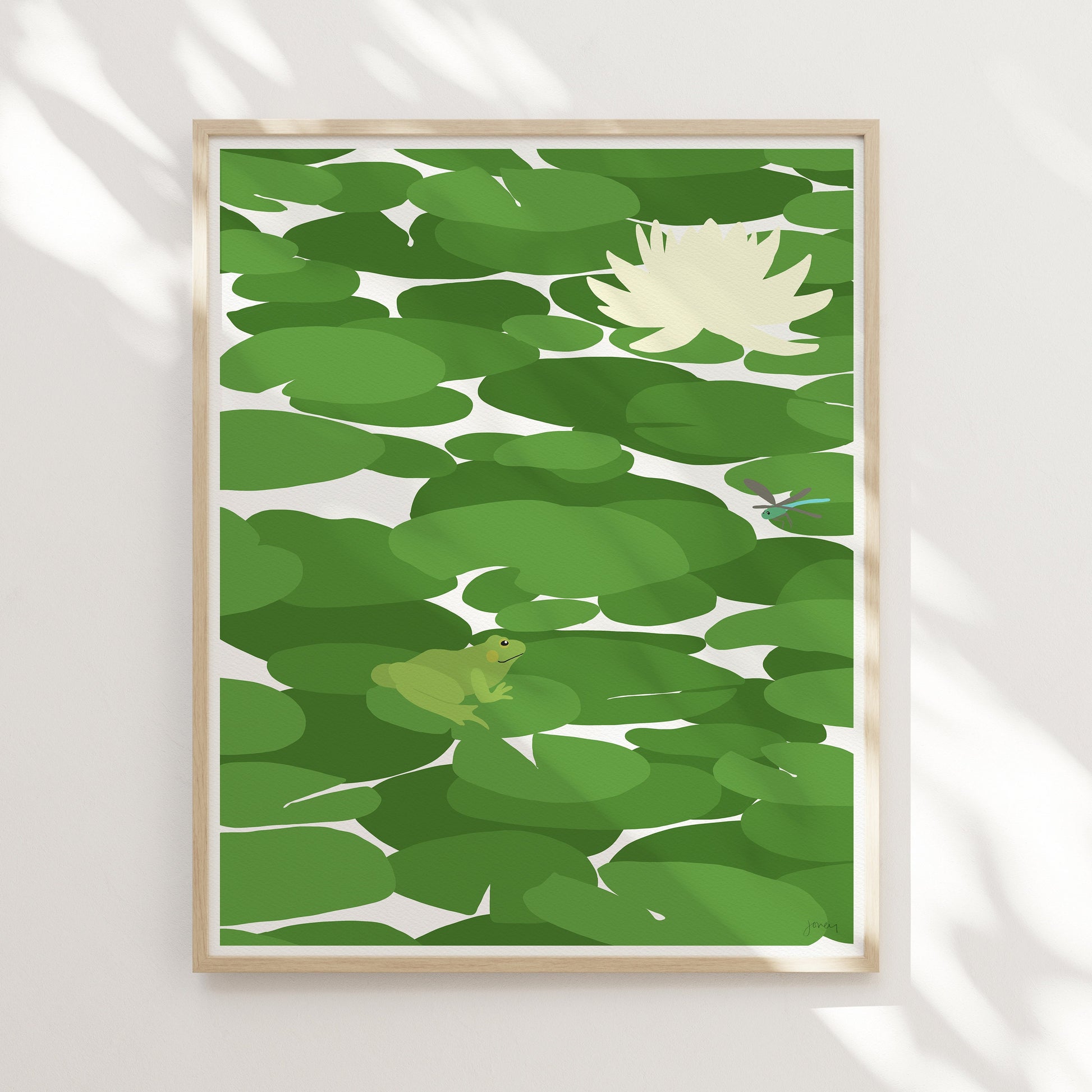 Printed on high-quality archival paper, this art print captures the calming shapes and colors of the lily pads and the playful frog perched upon them. Each print is meticulously crafted, signed, and printed by me, ensuring its authenticity and adding a personal touch to your collection.