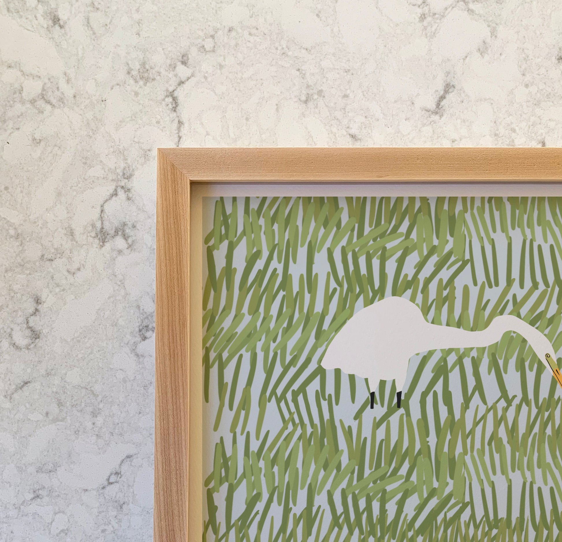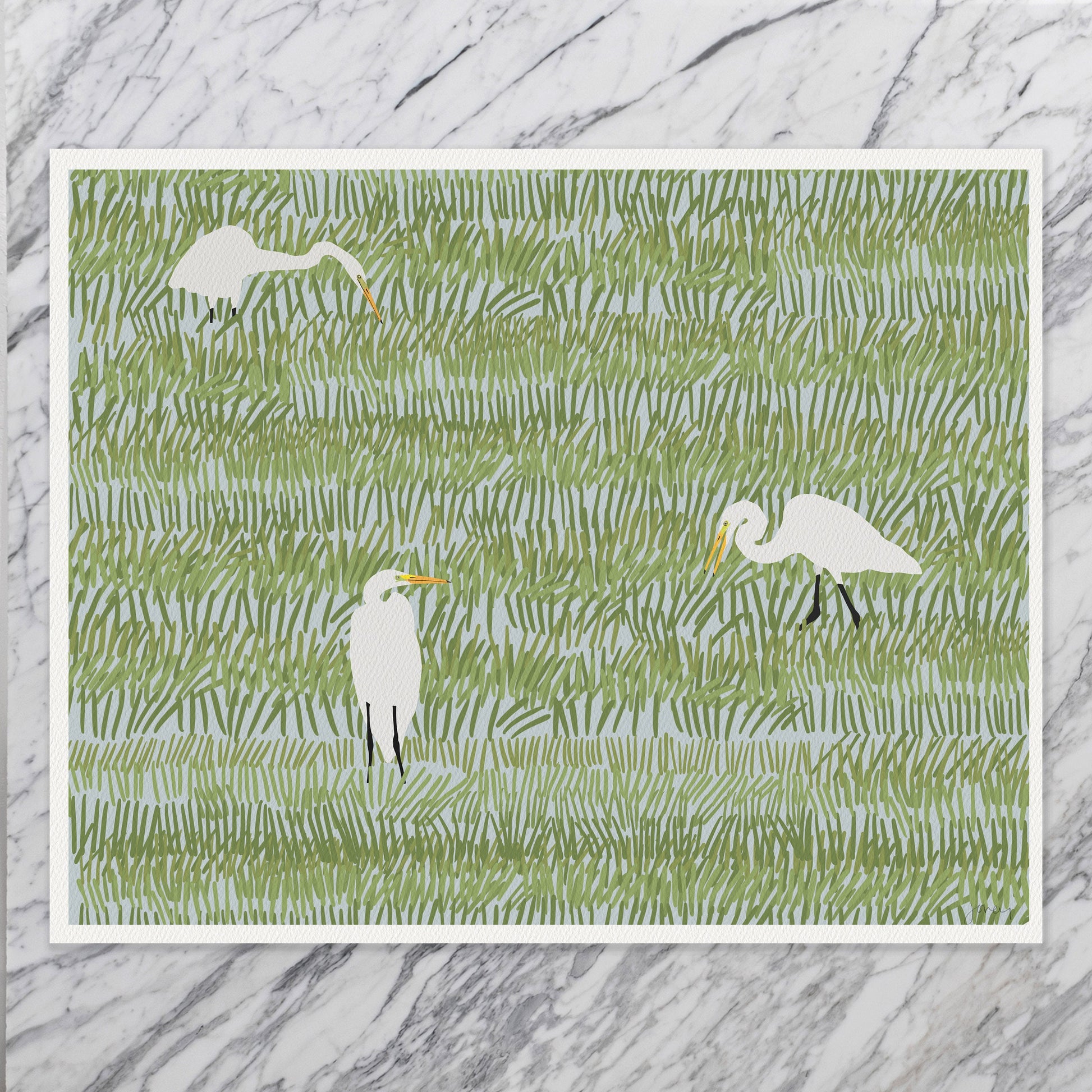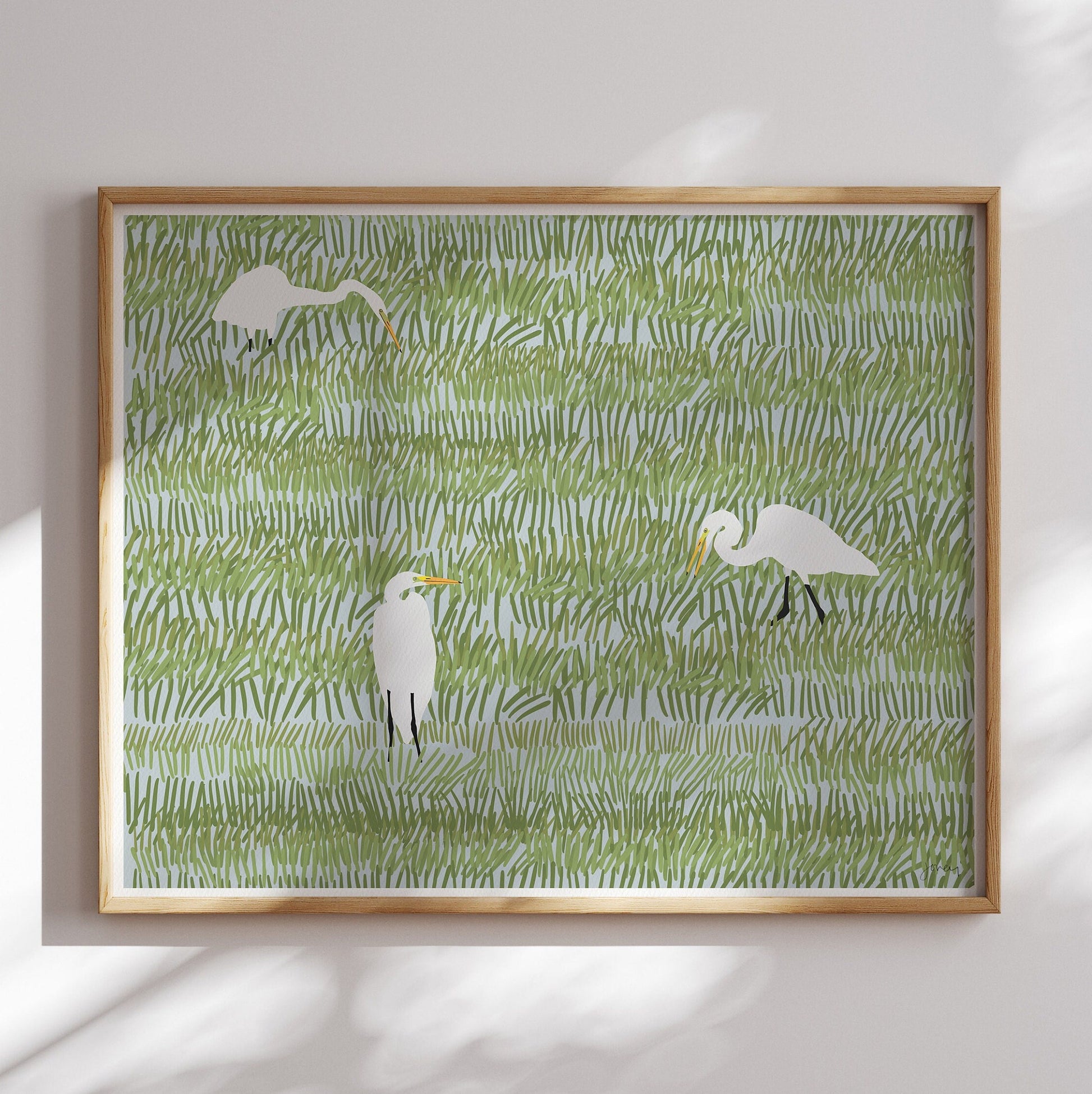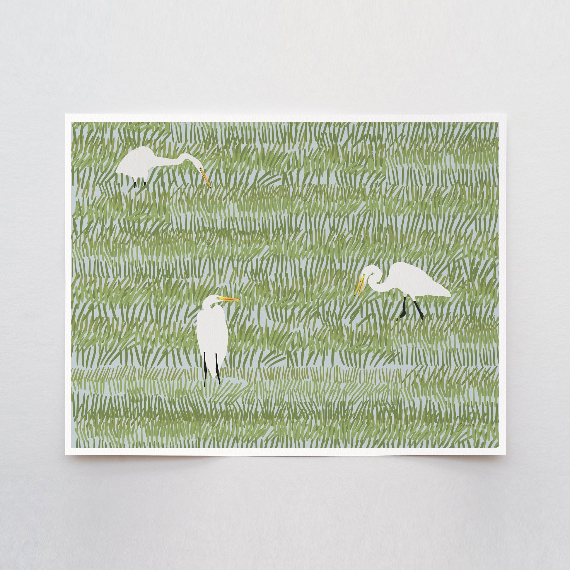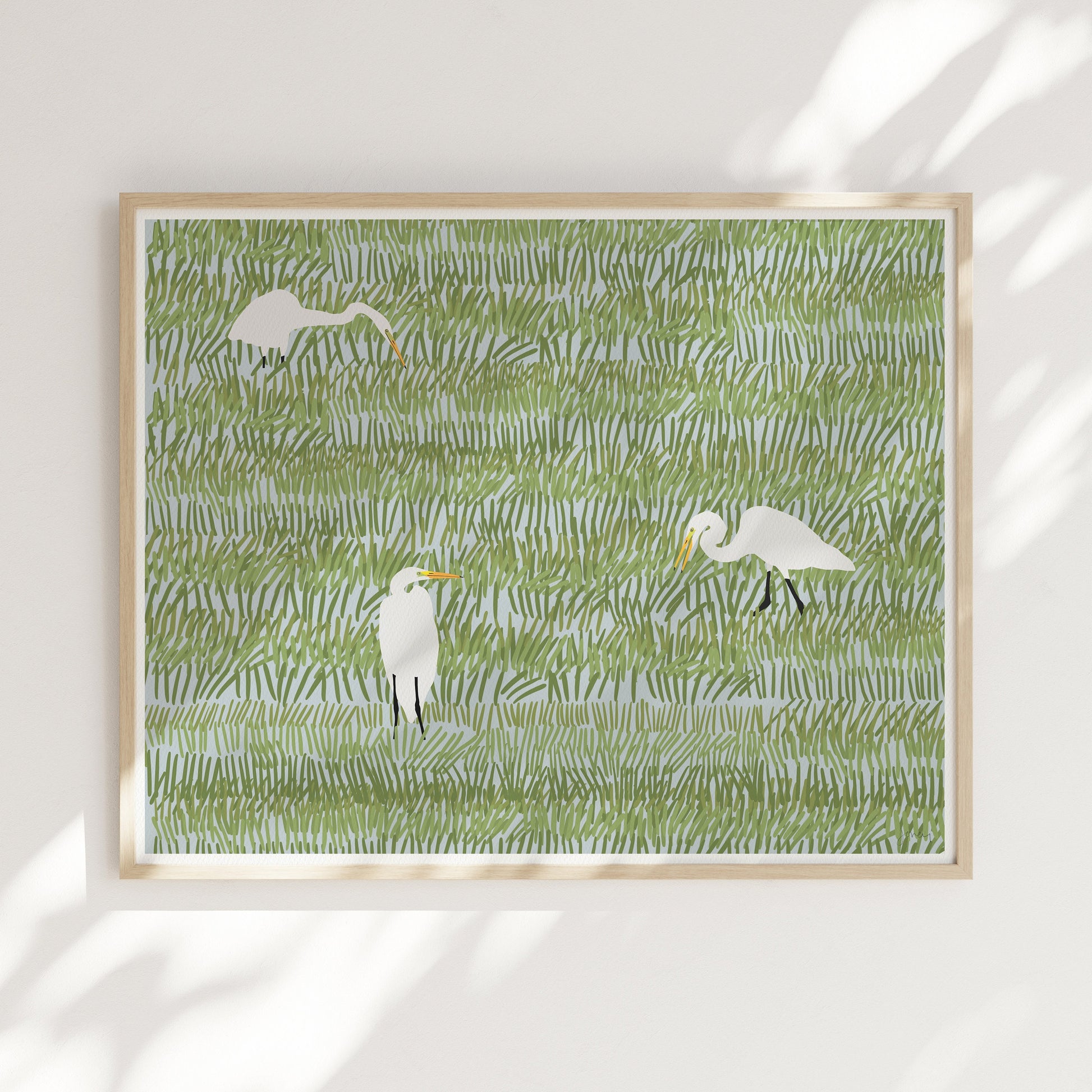 Invite the serene beauty of coastal wetlands into your home with our "Great Egrets" art print, a timeless addition to any art collection.