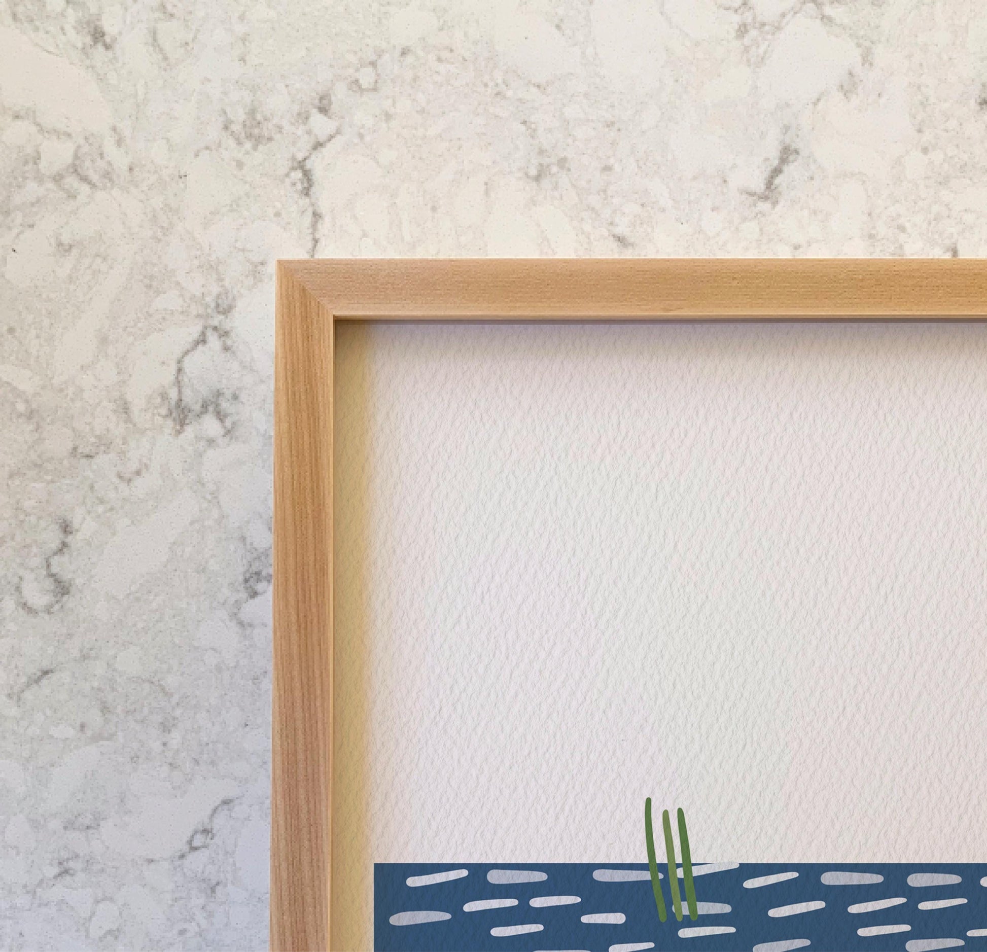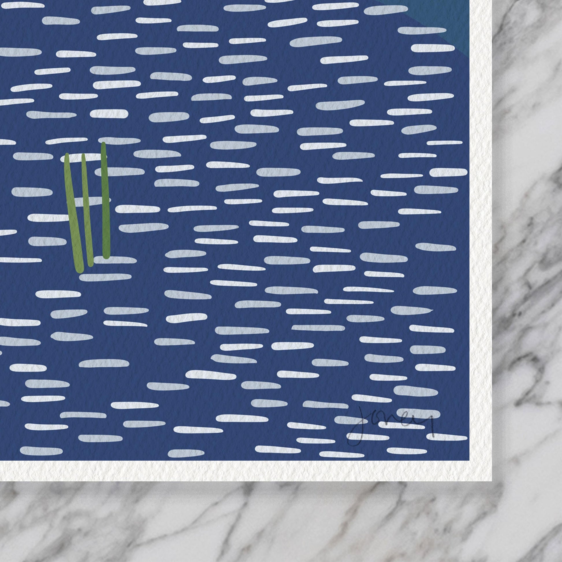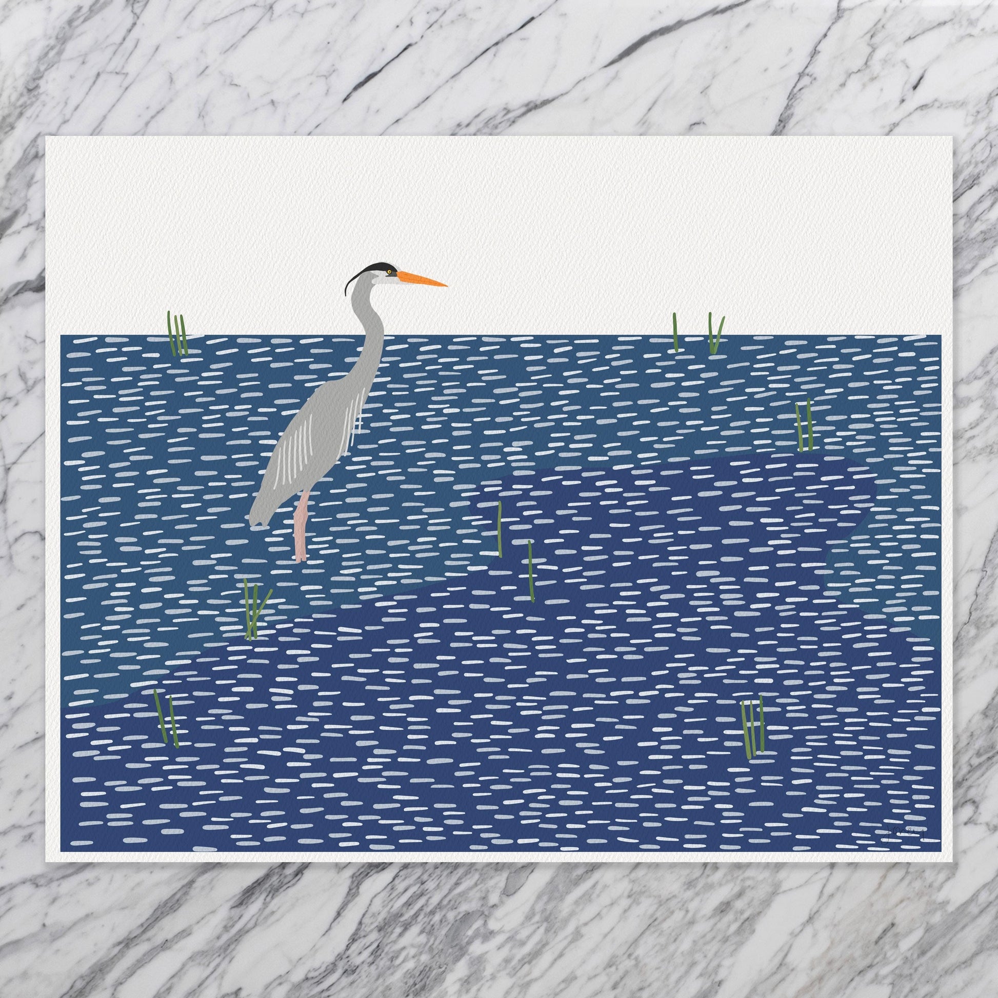 This Heron art print captures the serene beauty of coastal wildlife, featuring a graceful blue heron standing tall against windy water. Perfect as minimalist coastal wall art, this signed art print by Jorey Hurley brings calm and elegance to any space while celebrating nature’s quiet strength. Printed with archival pigment inks on museum quality print paper, this artwork ensures long-lasting color and detail.