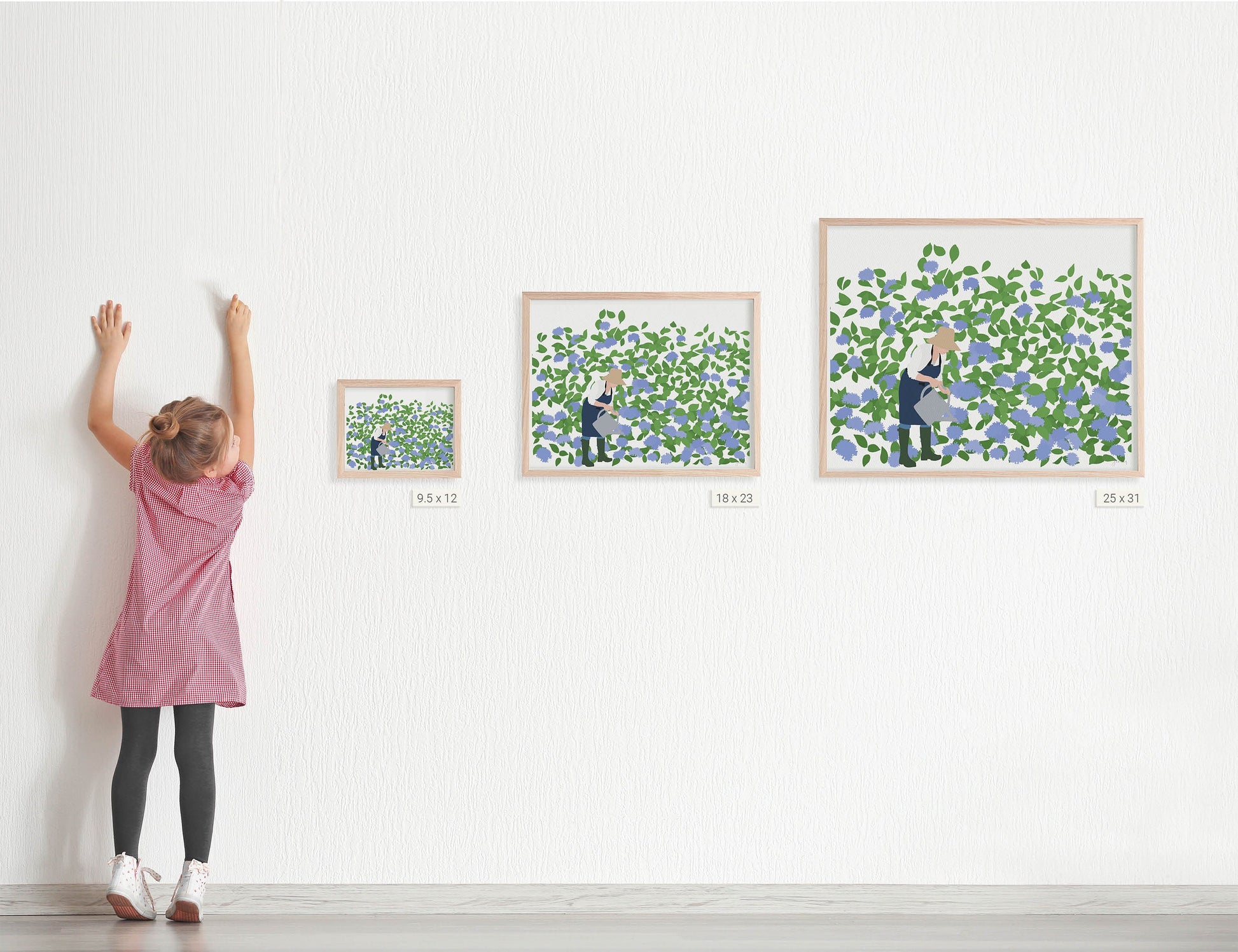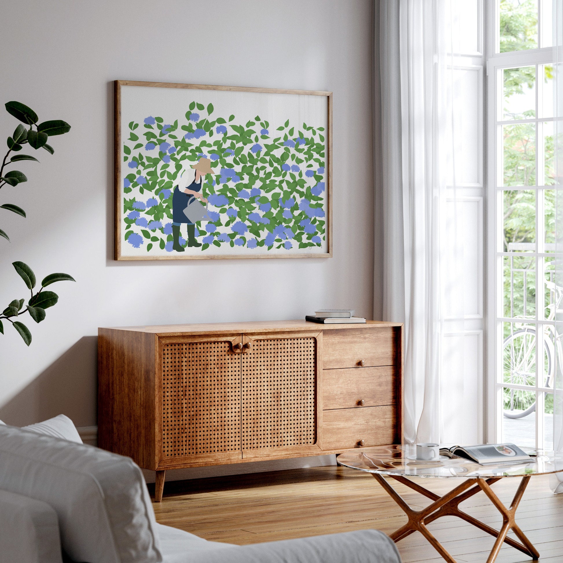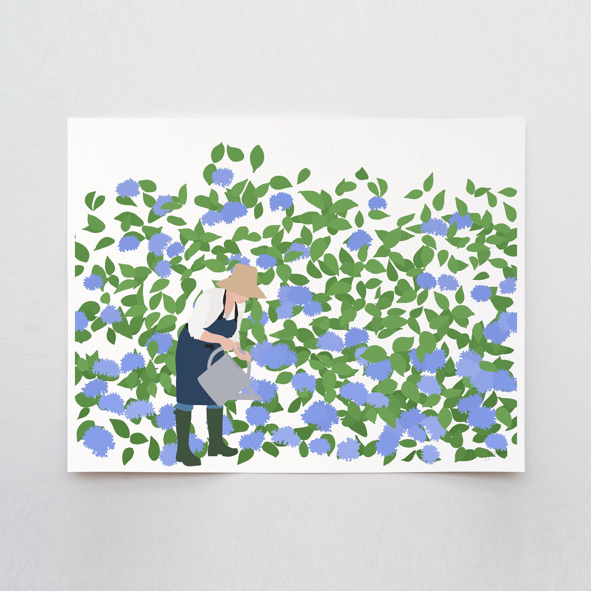 Infuse your space with the beauty of a blossoming garden through the "Watering Hydrangeas Art Print." Ideal for garden lovers and anyone looking to bring the tranquility of nature indoors. Perfect Mother's Day Gift.