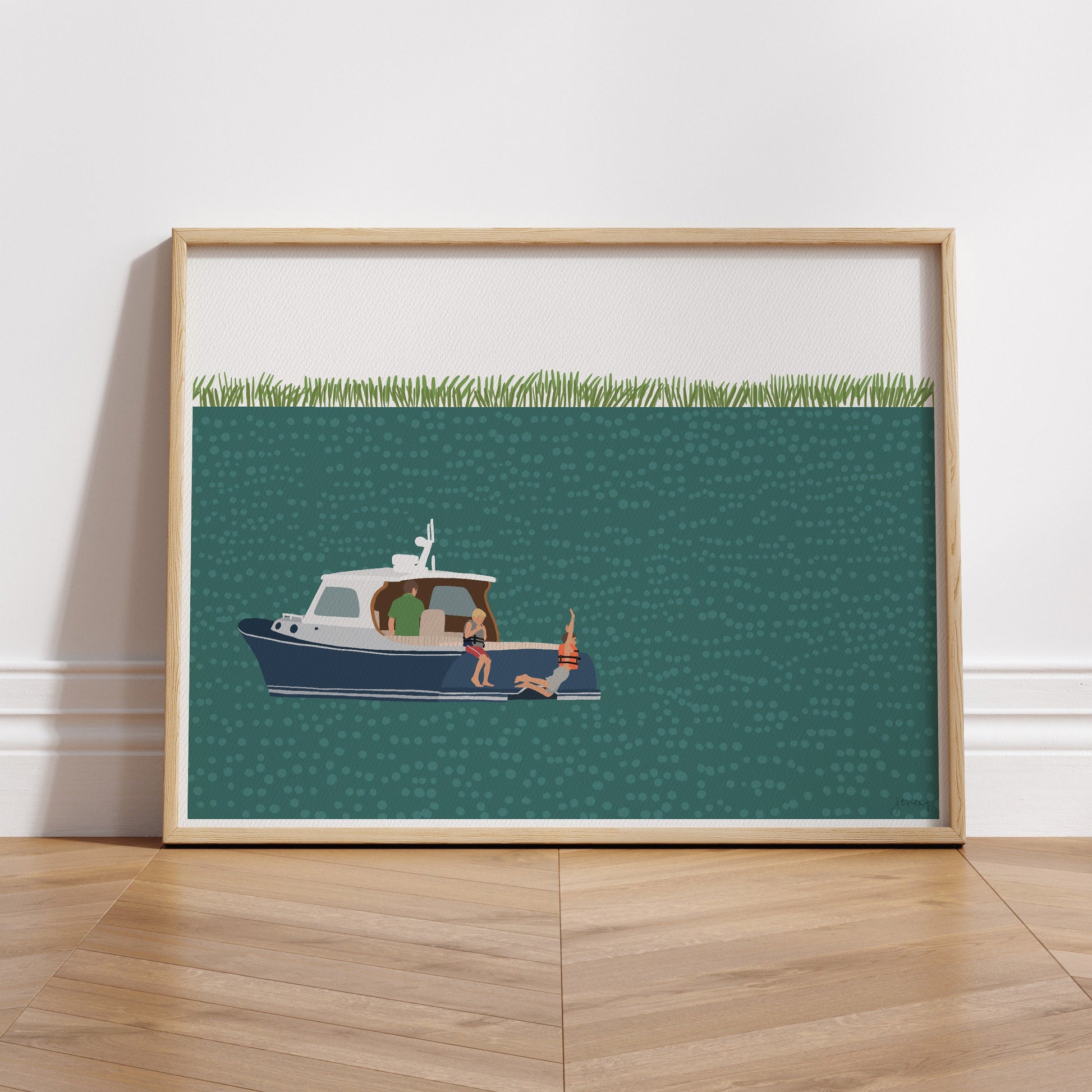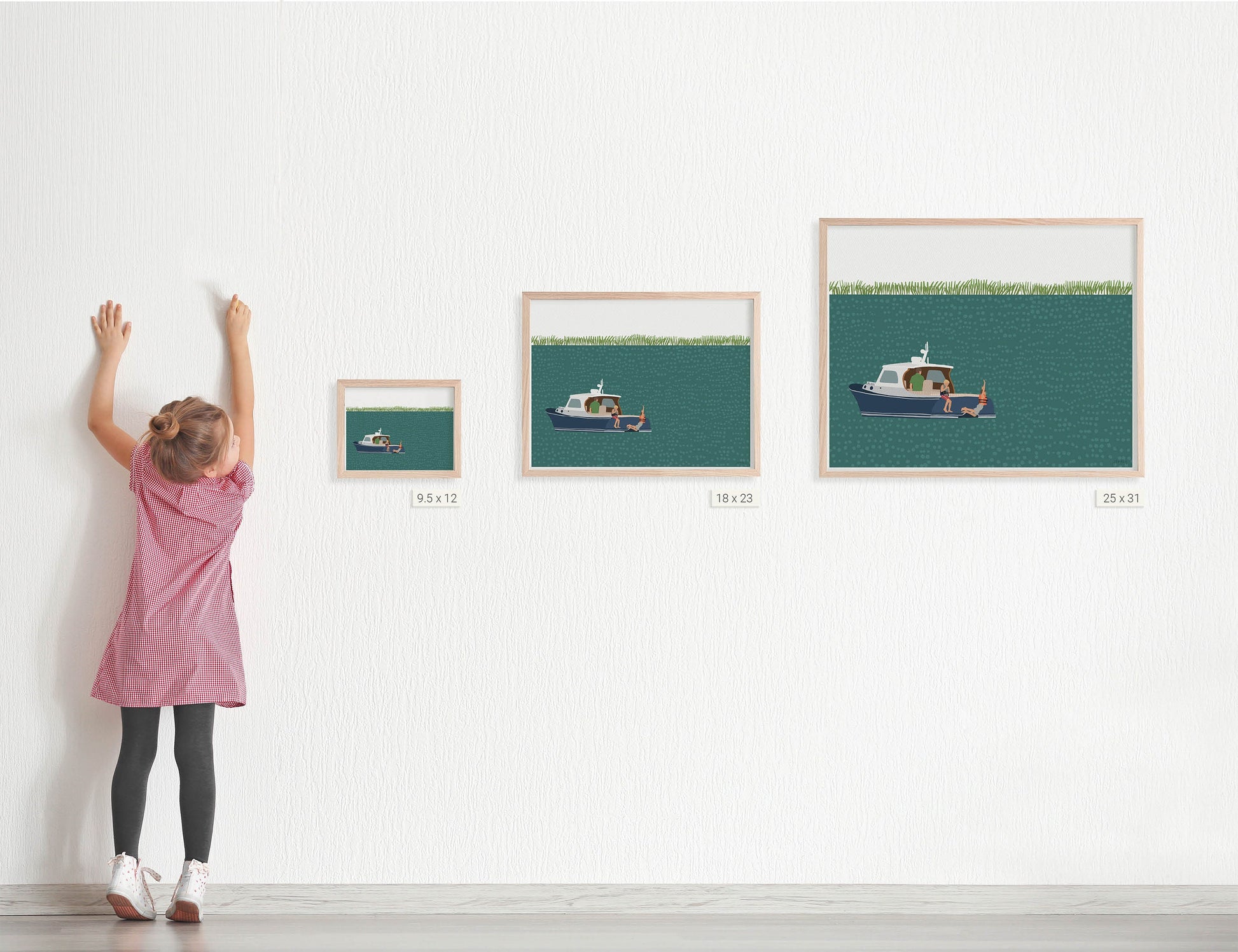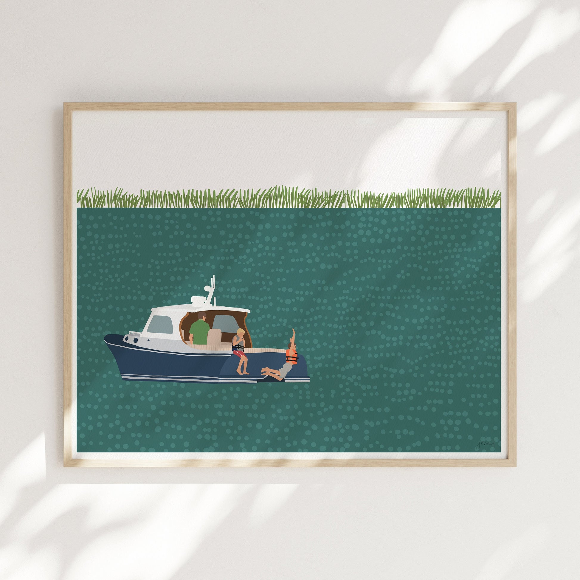 Remind yourself of a family swim day with this art print. This joyful piece captures the essence of family fun as they leap off their boat into the refreshing waters, creating memories that last a lifetime.
