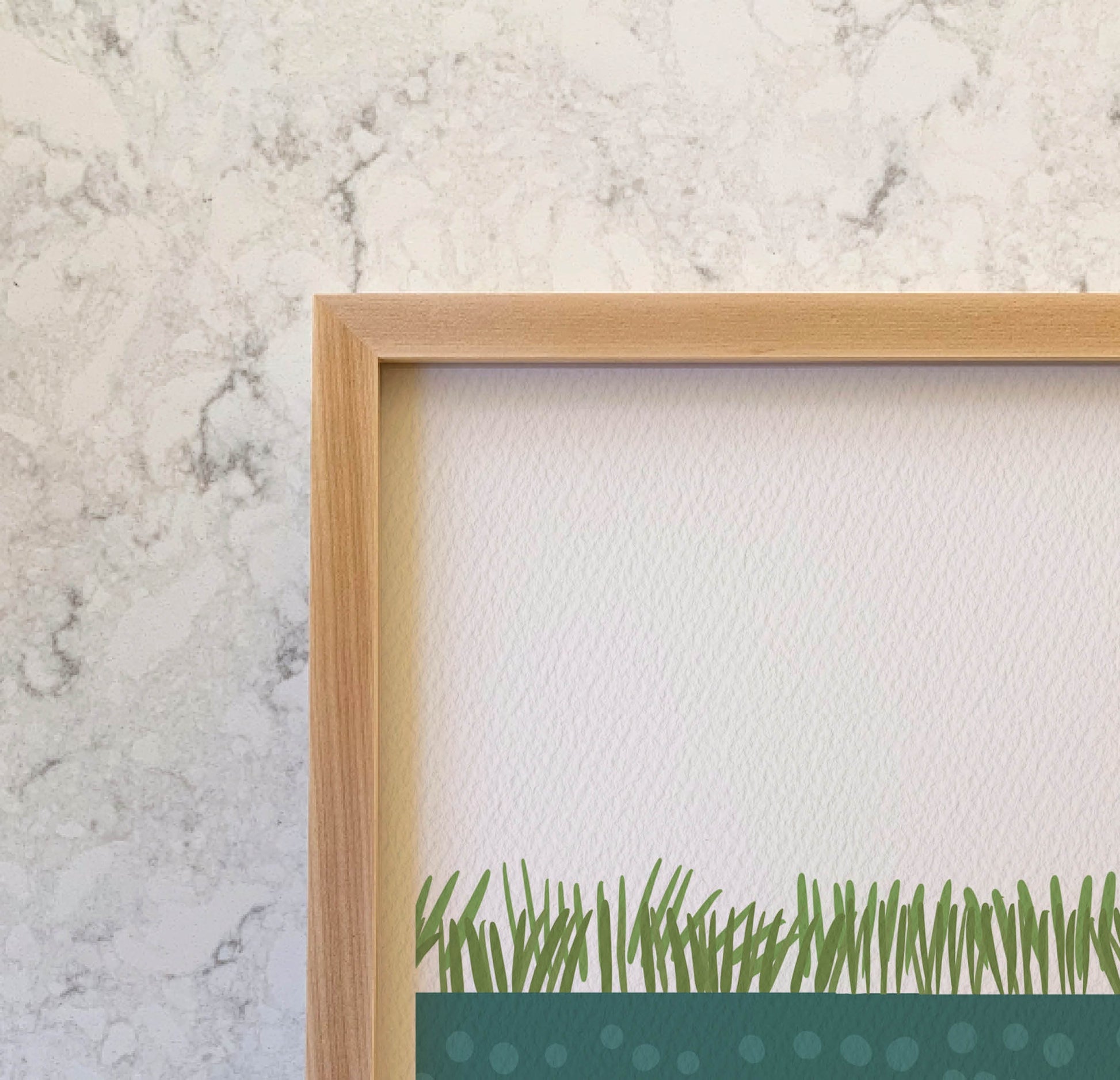 Choose between framed or unframed options. Our solid maple frames offer a sophisticated, ready-to-hang presentation that complements the artwork's charm. Alternatively, opt for unframed prints, available in standard sizes (8"x10" and 16"x20"), allowing you to choose your own frame. Custom sizes are available upon request.