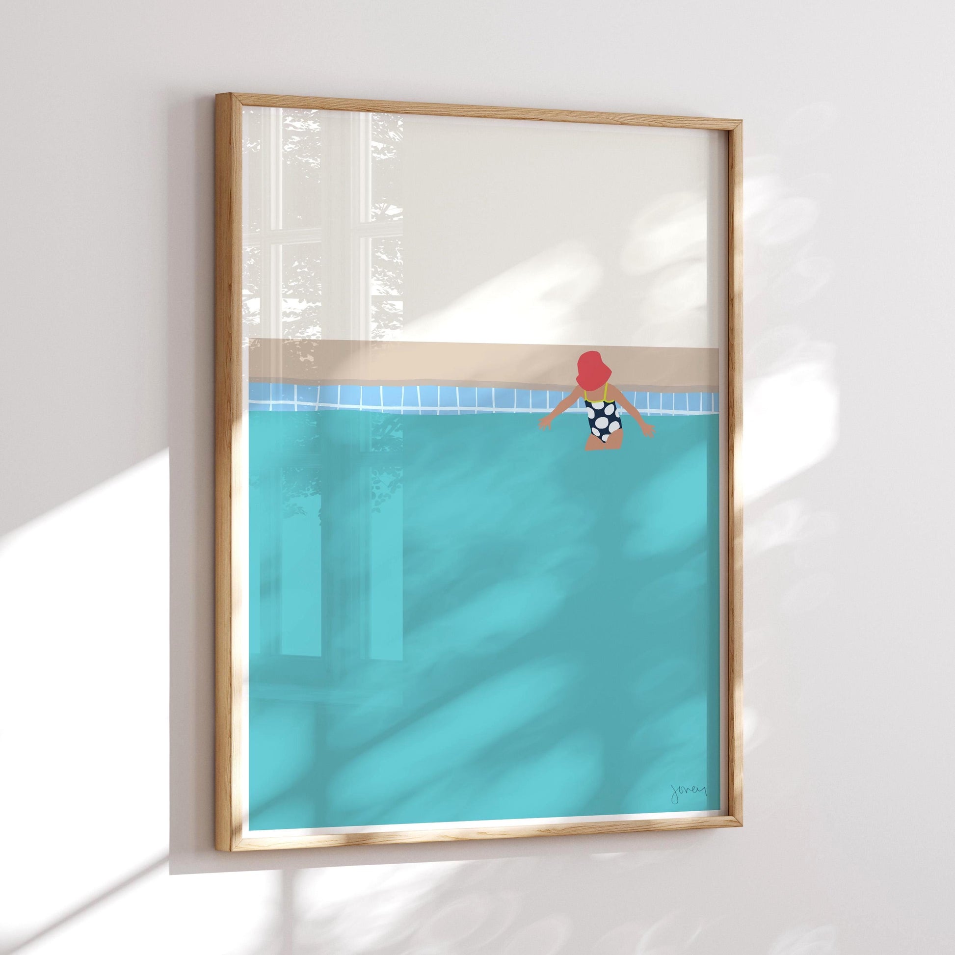 Delight in childhood summers with this "Kid in Sunhat Art Print." This artwork captures the essence of carefree days spent at our local outdoor pool in California, where our kids learned to love the water.