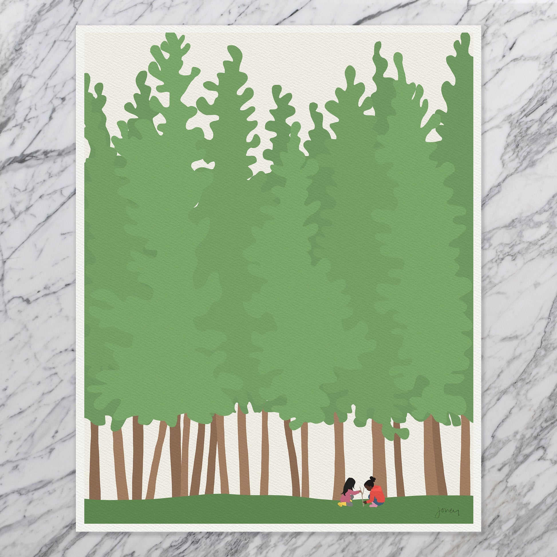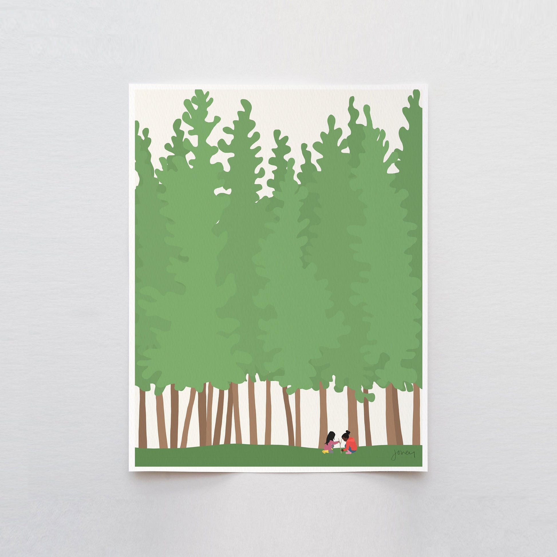 Step into your favorite memory in nature with my "Kids Playing in the Woods" Art Print. Inspired by the curiosity and imagination of kids playing near the Woodline near my old home in the Presidio of San Francisco.