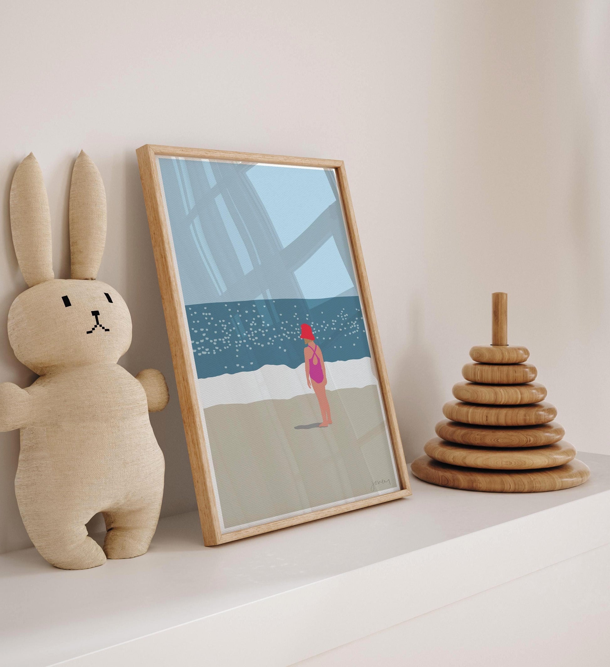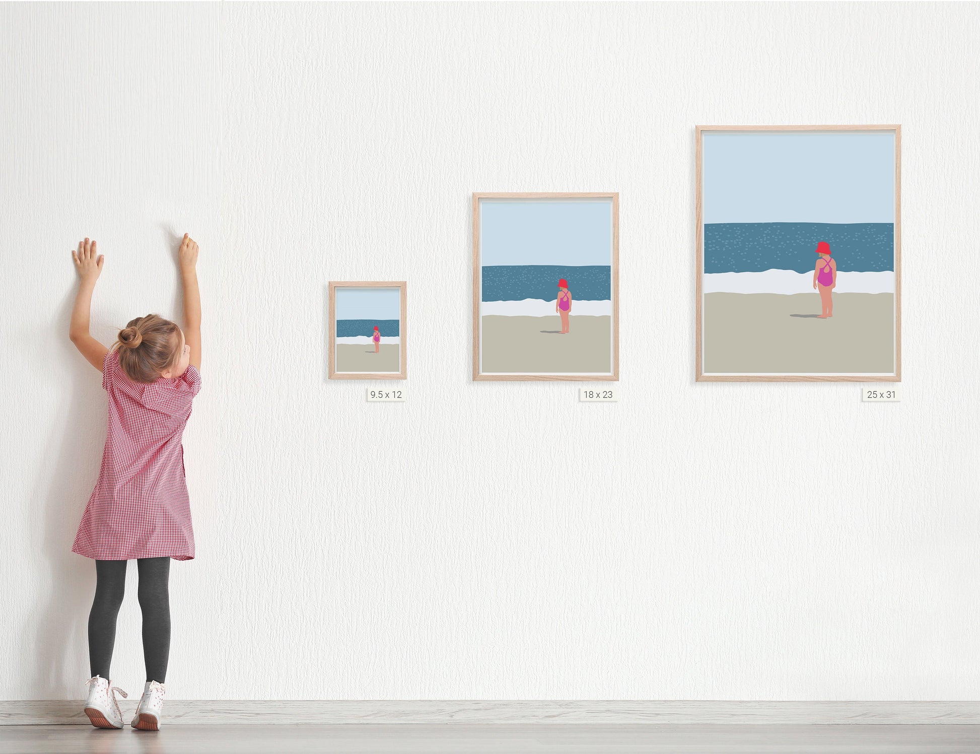 Invite the joyous spirit of 'Little Girl in Sunhat on Beach' into your space, adding a touch of coastal delight and reminiscence of carefree days by the shore.