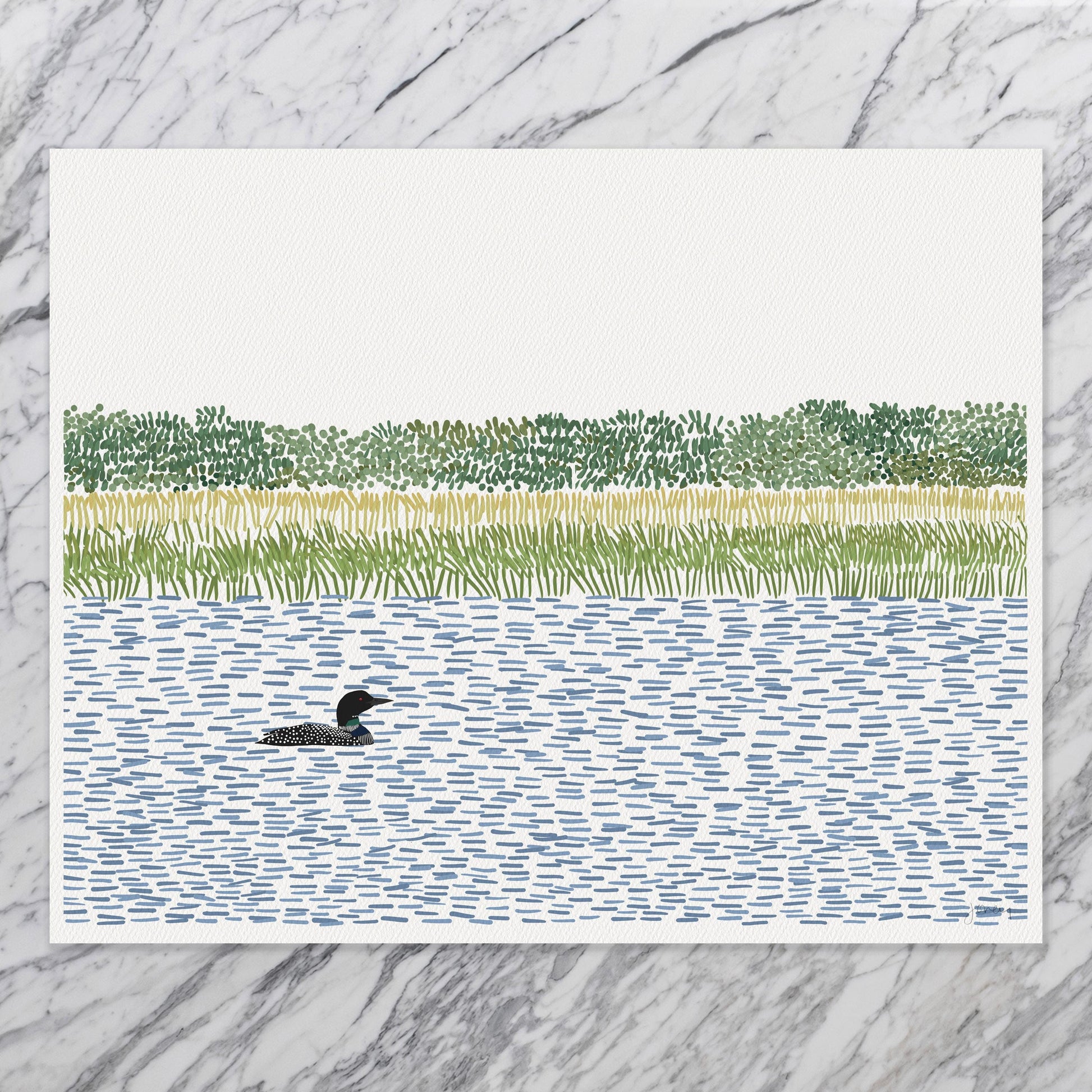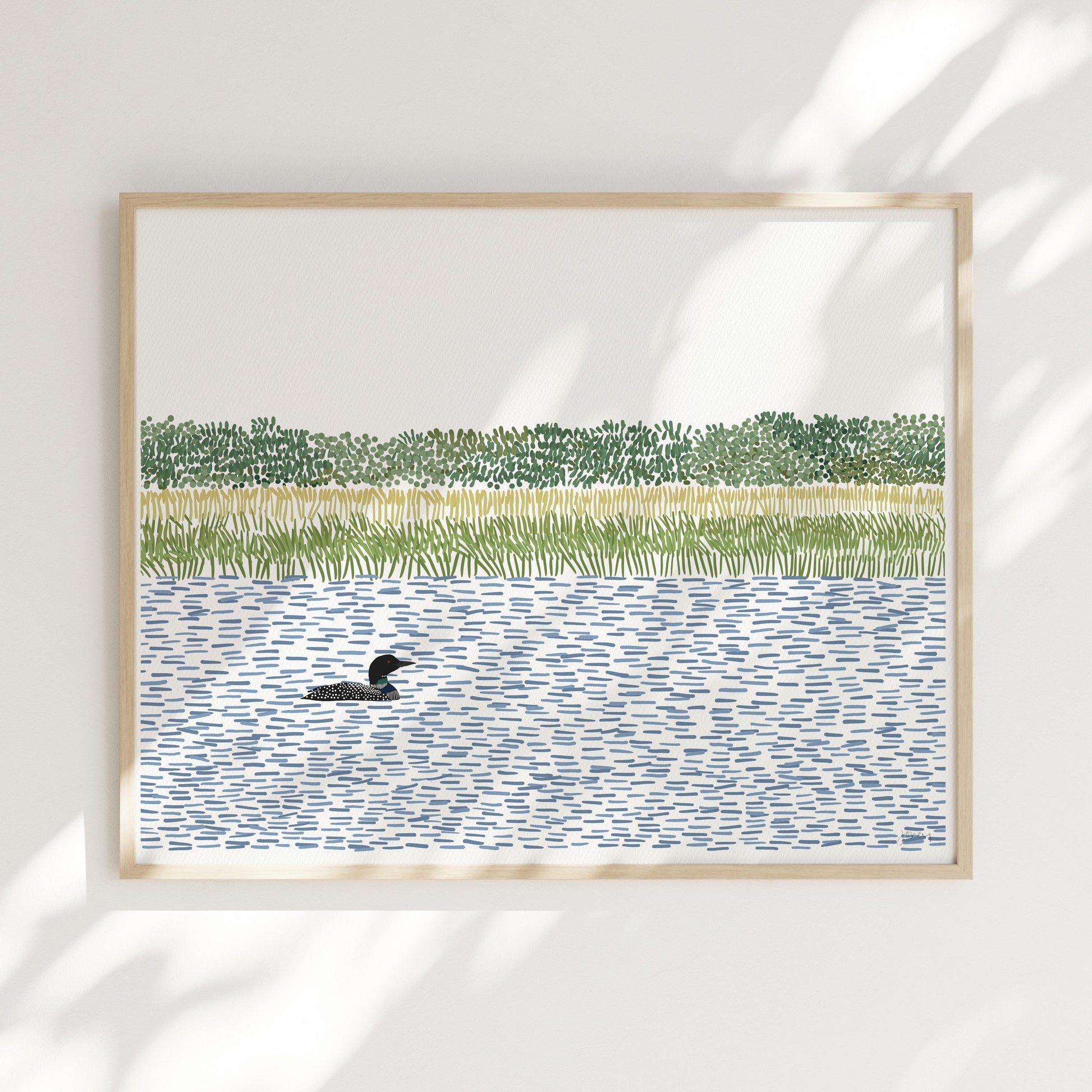 Bring the calm and quiet of river life into your home with my “Loon on a River” art print. This minimalist design features a solitary loon gliding peacefully across gentle waters, capturing the beauty and stillness of nature in a clean, modern style.