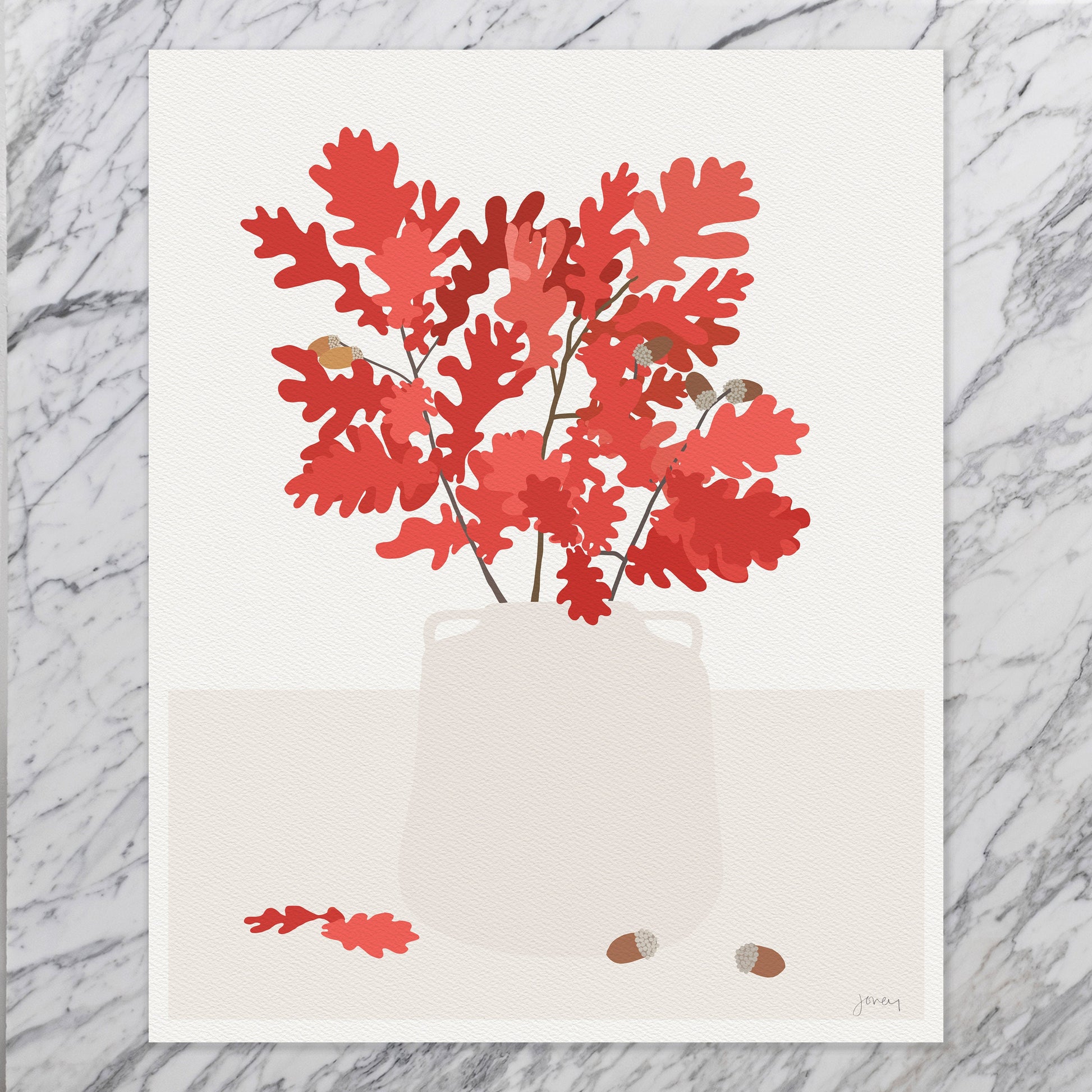 Capture the enchanting New England fall with my Oak Leaves in Vase Abstract Still Life Art Print. Inspired by the beauty of our local autumn foliage, this artwork celebrates the rich colors of oak leaves in their splendid seasonal transformation.