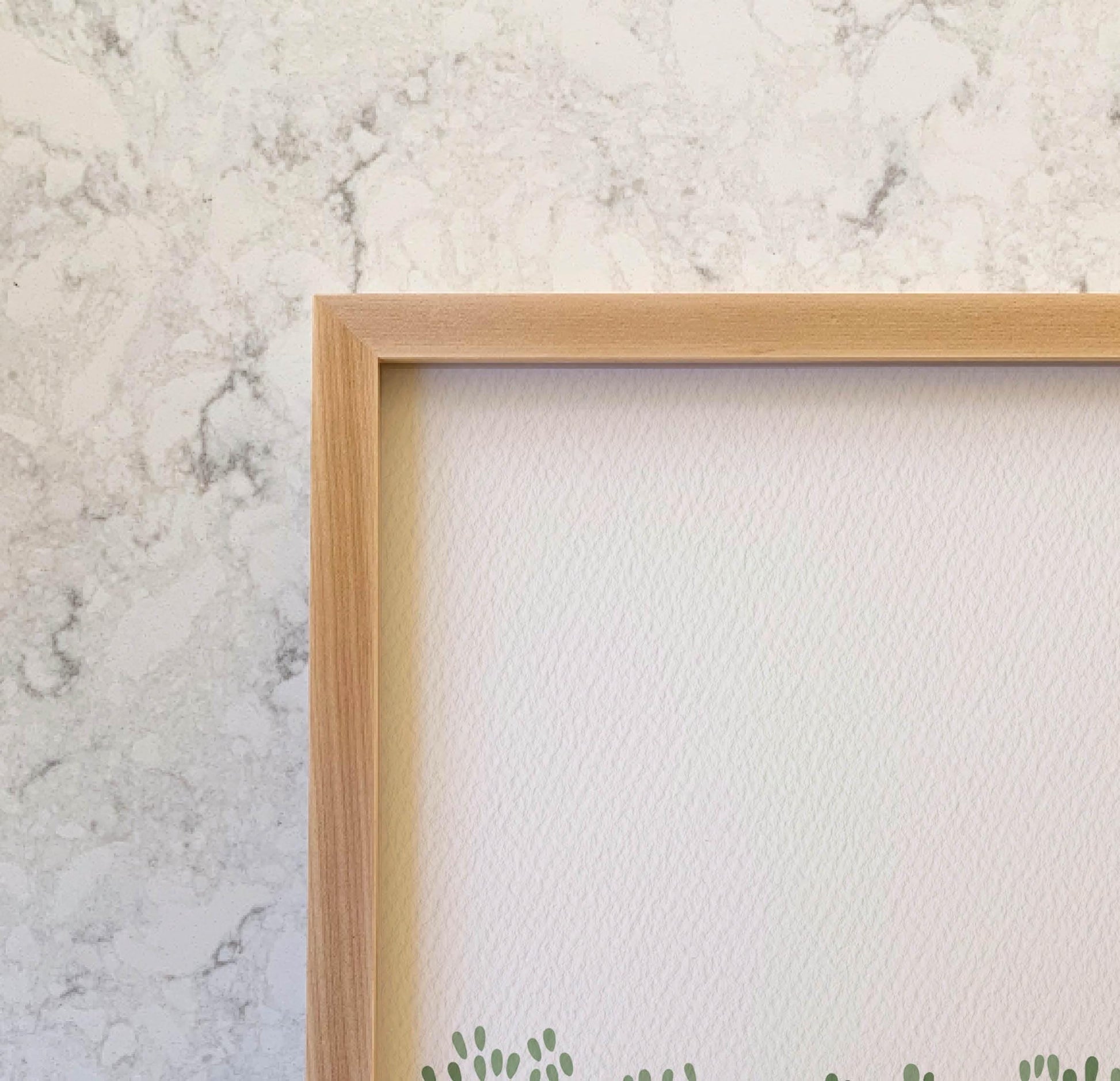 Choose between unframed or framed options. Our sustainably sourced solid maple frames arrive ready to hang and perfectly complement the artwork. Unframed prints are available in standard sizes, allowing you the flexibility to choose a frame that fits your style. Custom sizing is available upon request.