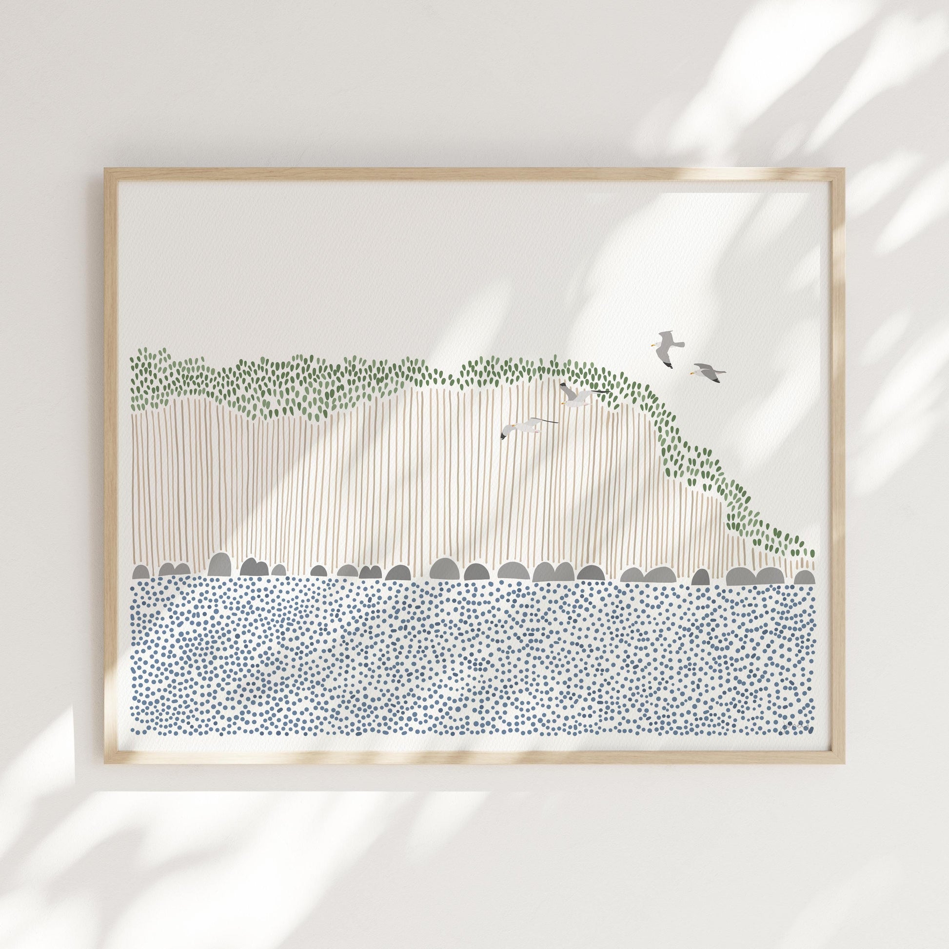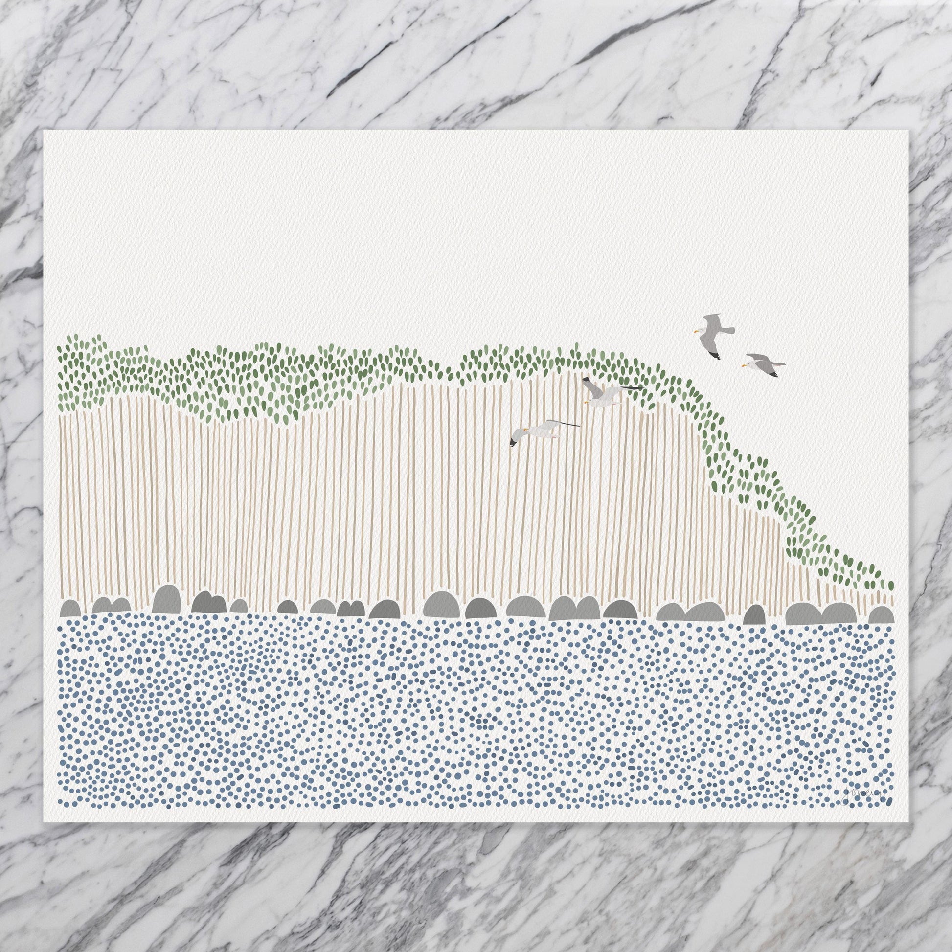 Capture the beauty of land and ocean with my “Ocean Cliffs” art print - featuring seagulls soaring gracefully above an abstract landscape where waves and coastline meet. Perfect for those who love the ocean and appreciate the tranquil elegance of coastal landscapes.