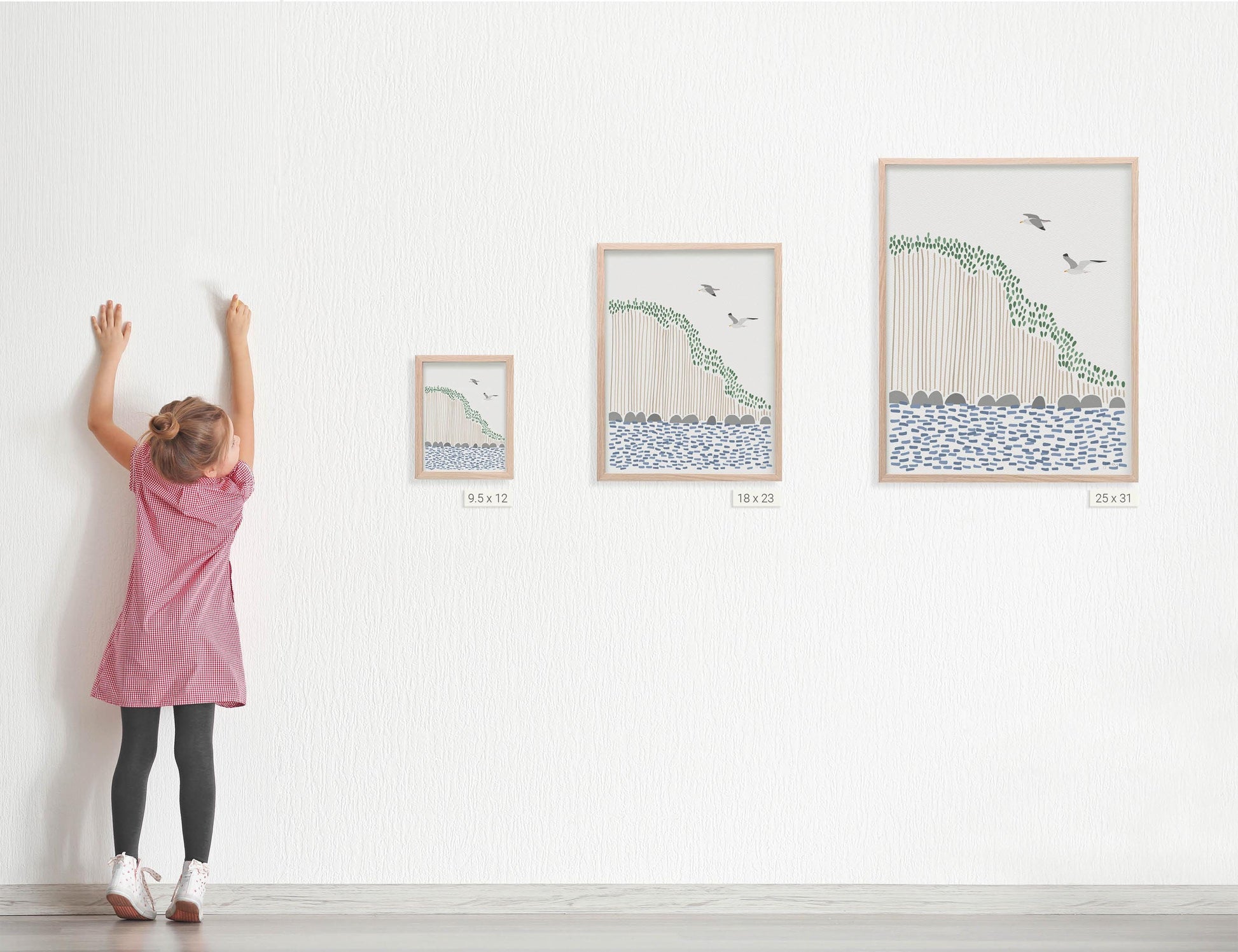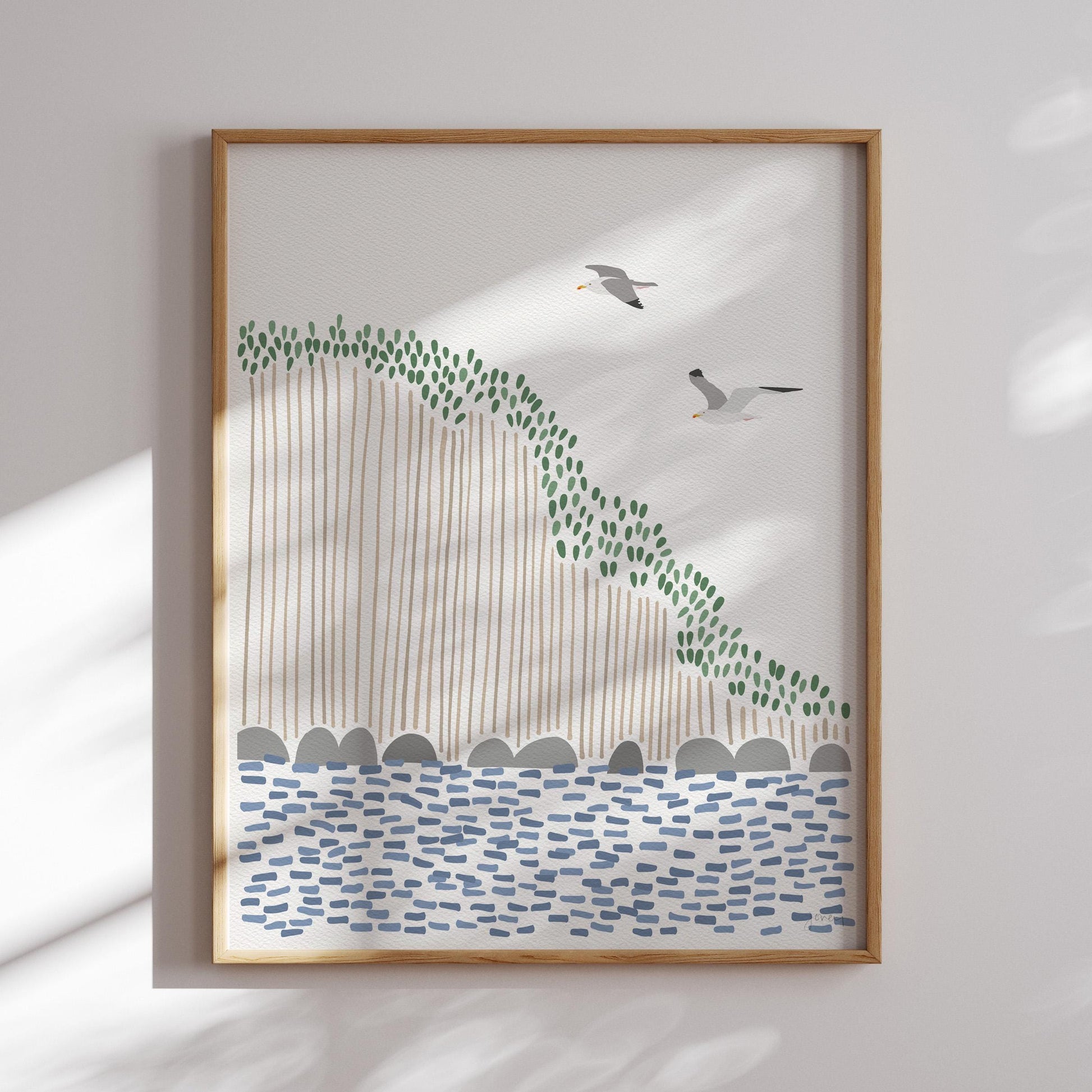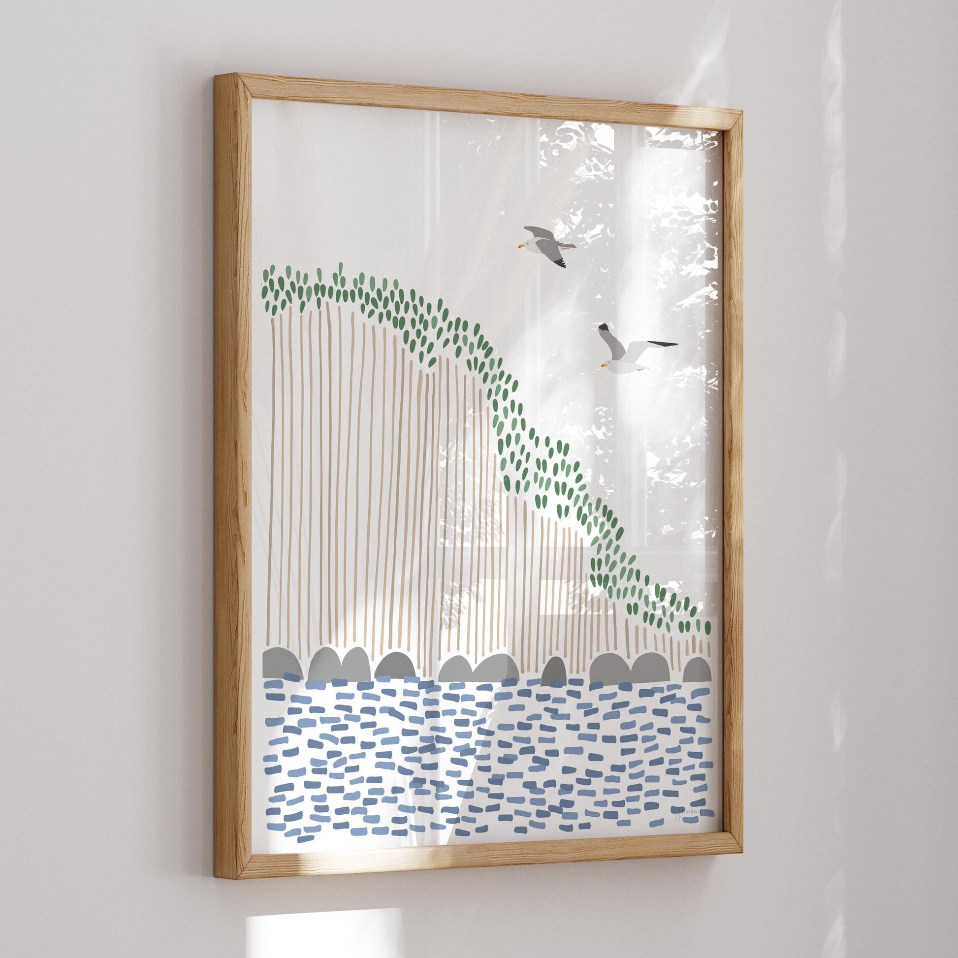 Capture the beauty of land and ocean with my “Ocean Cliffside” art print - featuring seagulls soaring gracefully above an abstract landscape where waves and coastline meet. Perfect for those who love the ocean and appreciate the tranquil elegance of coastal landscapes.