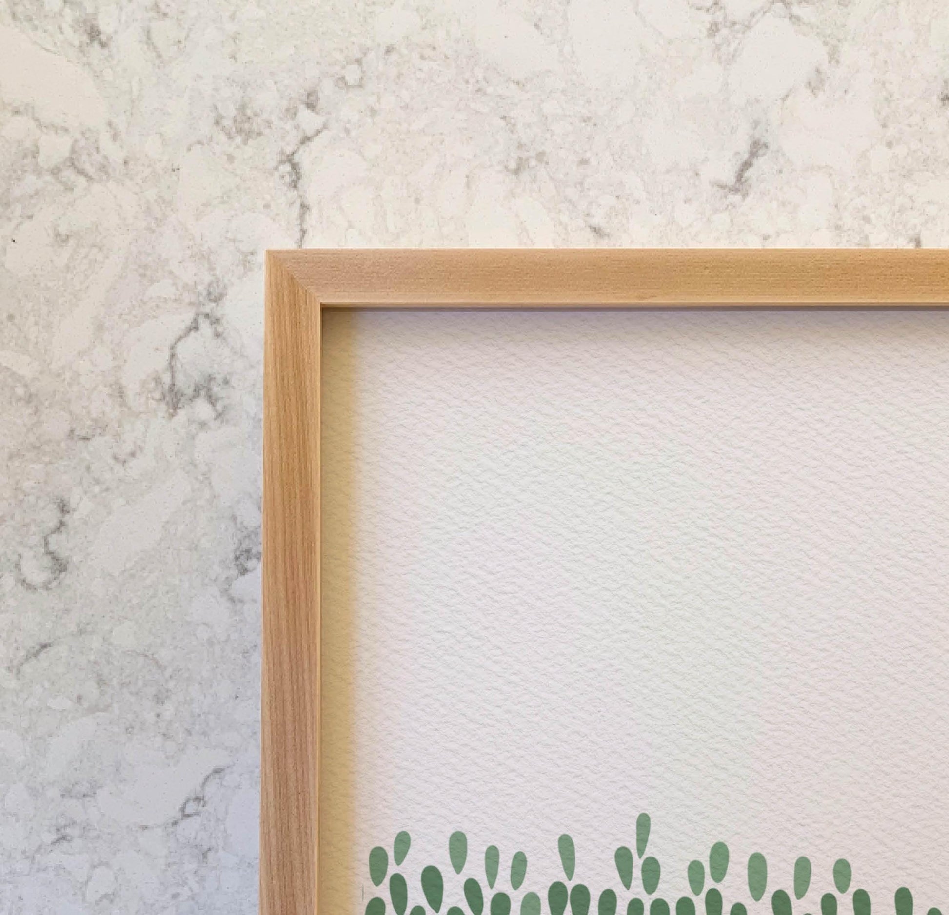 Choose between unframed or framed options. Our sustainably sourced solid maple frames arrive ready to hang and perfectly complement the artwork. Unframed prints are available in standard sizes, allowing you the flexibility to choose a frame that fits your style. Custom sizing is available upon request.