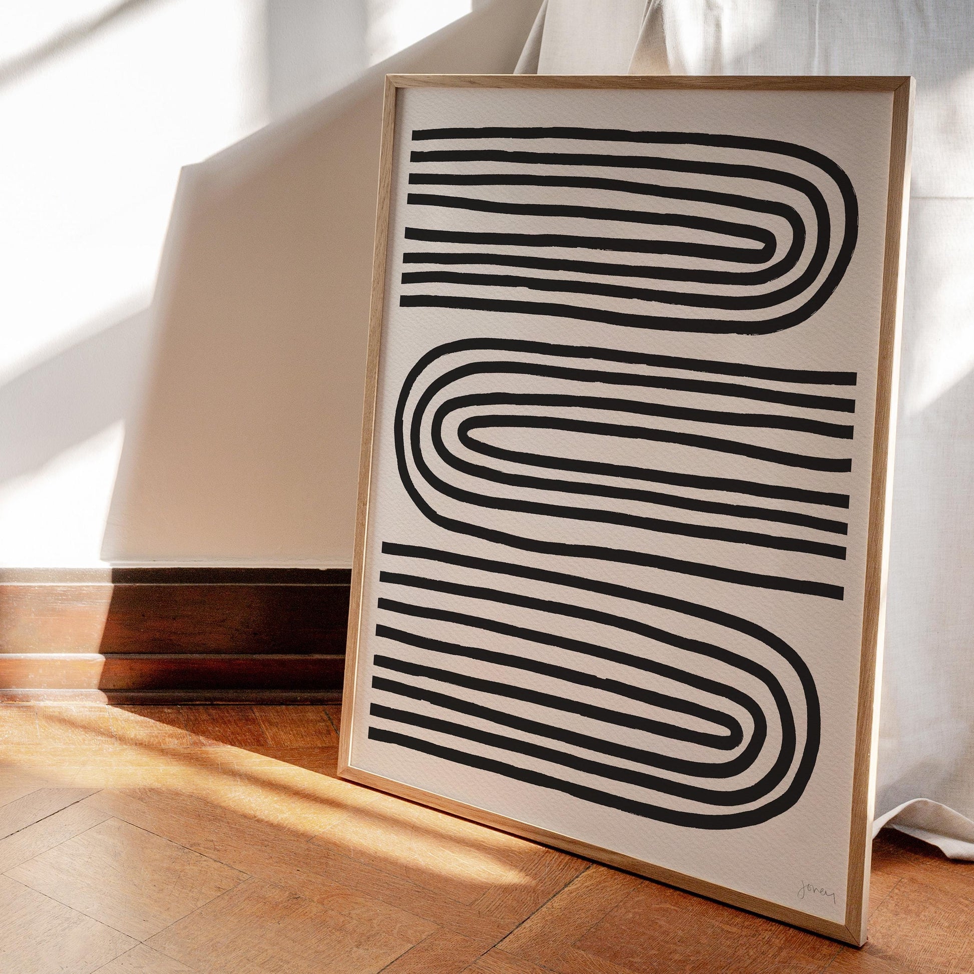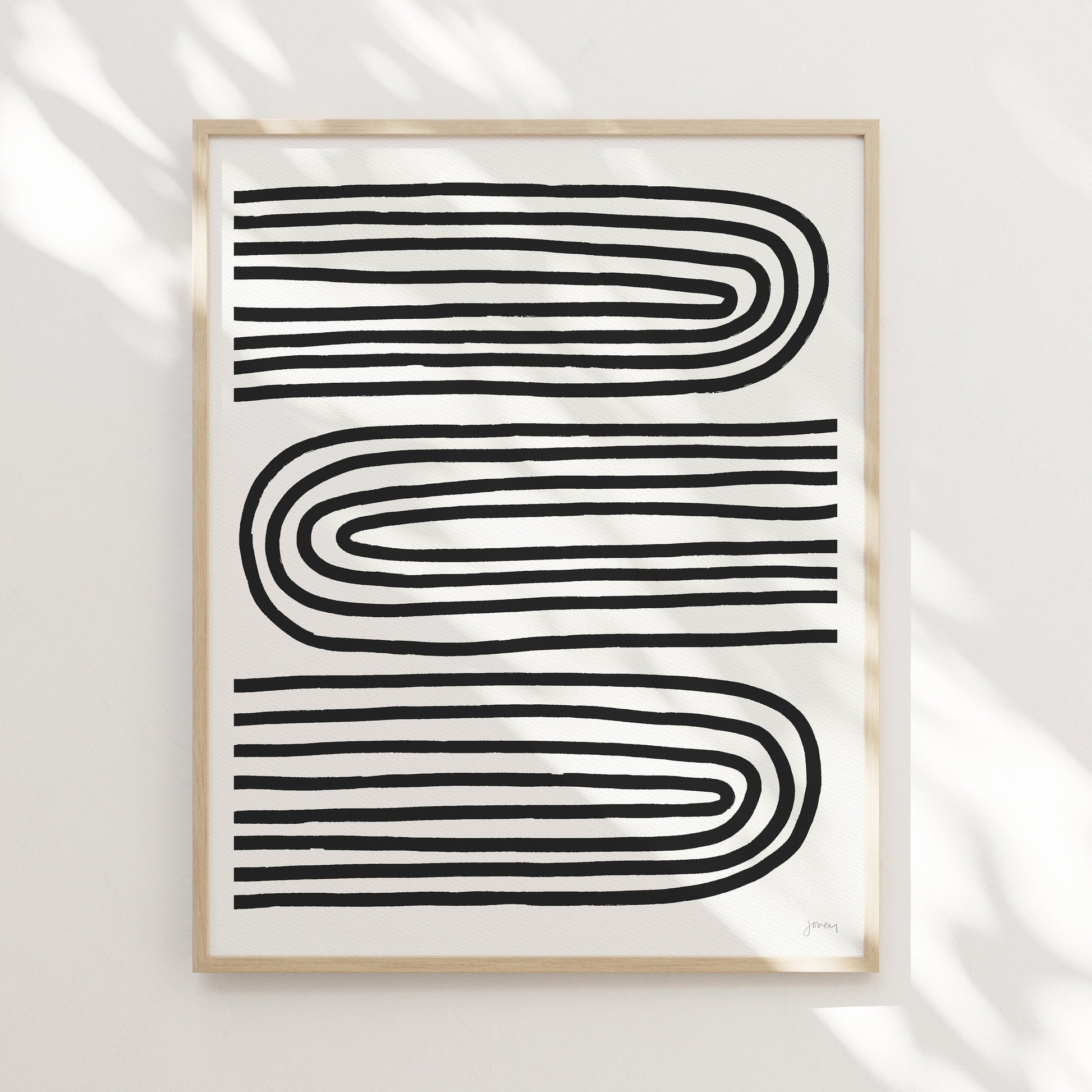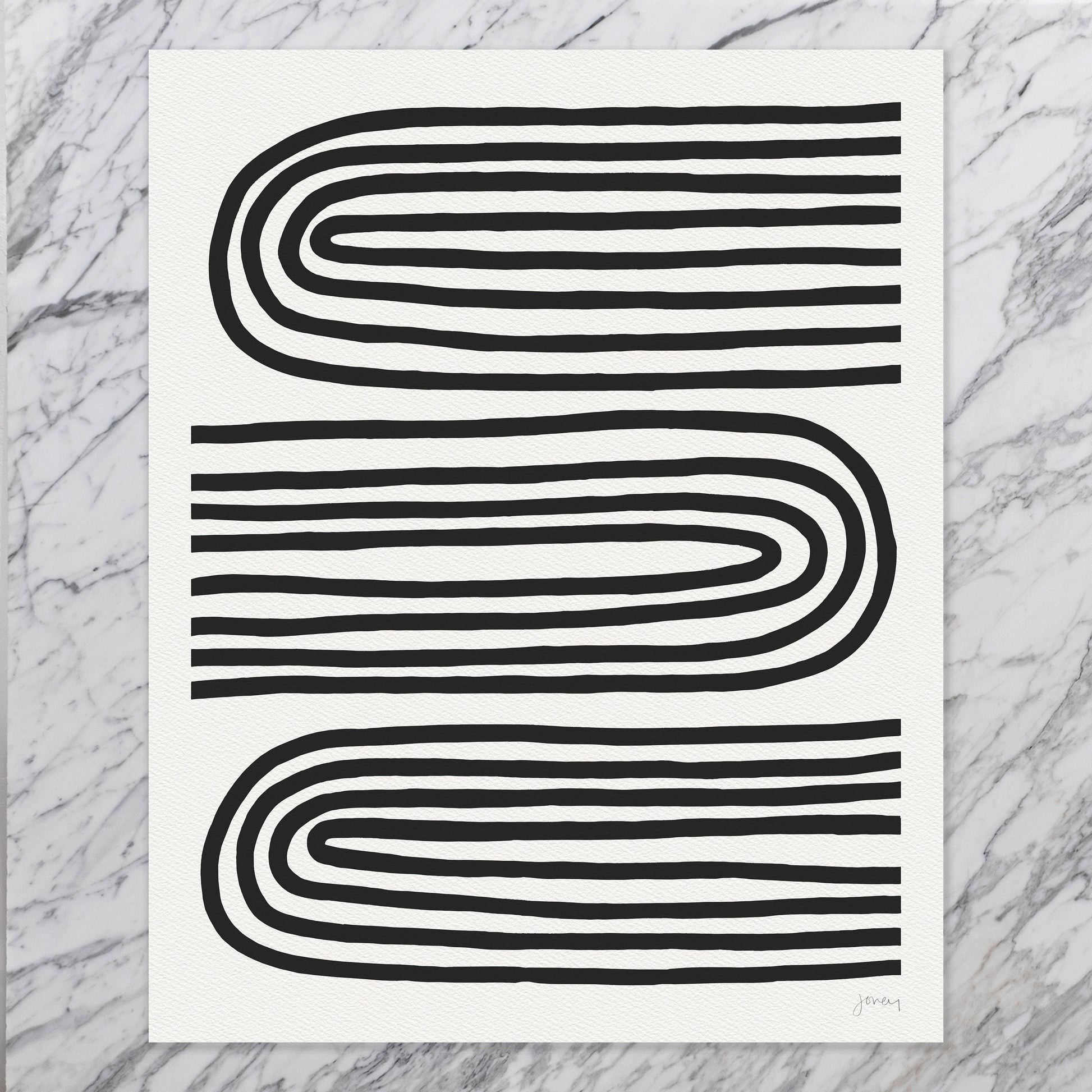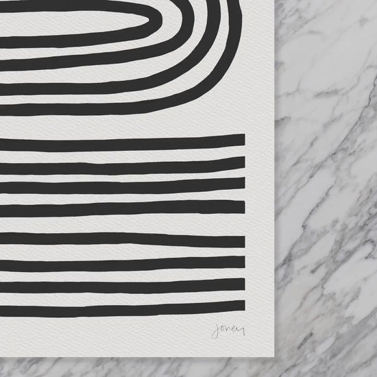 Explore the interplay of bold black and white stripes and flowing curves in my " Oxbow Abstract" art print.