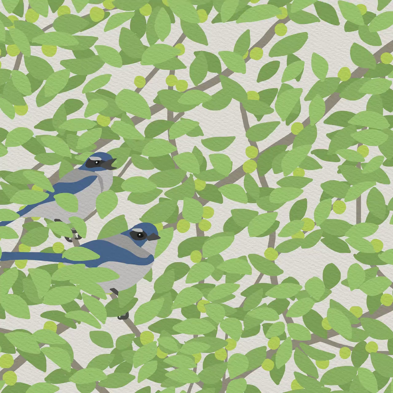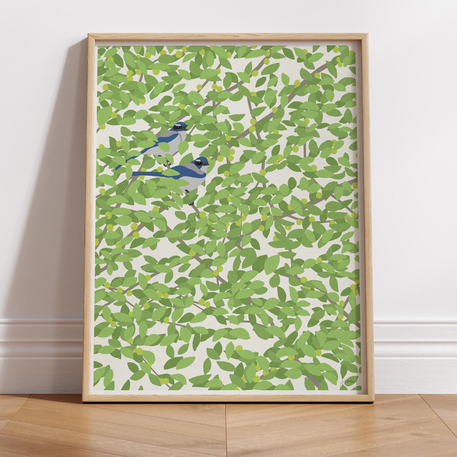 Delve into the world of nature with my 'Pair of Blue Jays' art print. This colorful piece celebrates the beauty of two blue jays, capturing their vibrant hues and graceful presence against a serene backdrop of the plum tree that sat outside our old house in the Presidio of San Francisco.