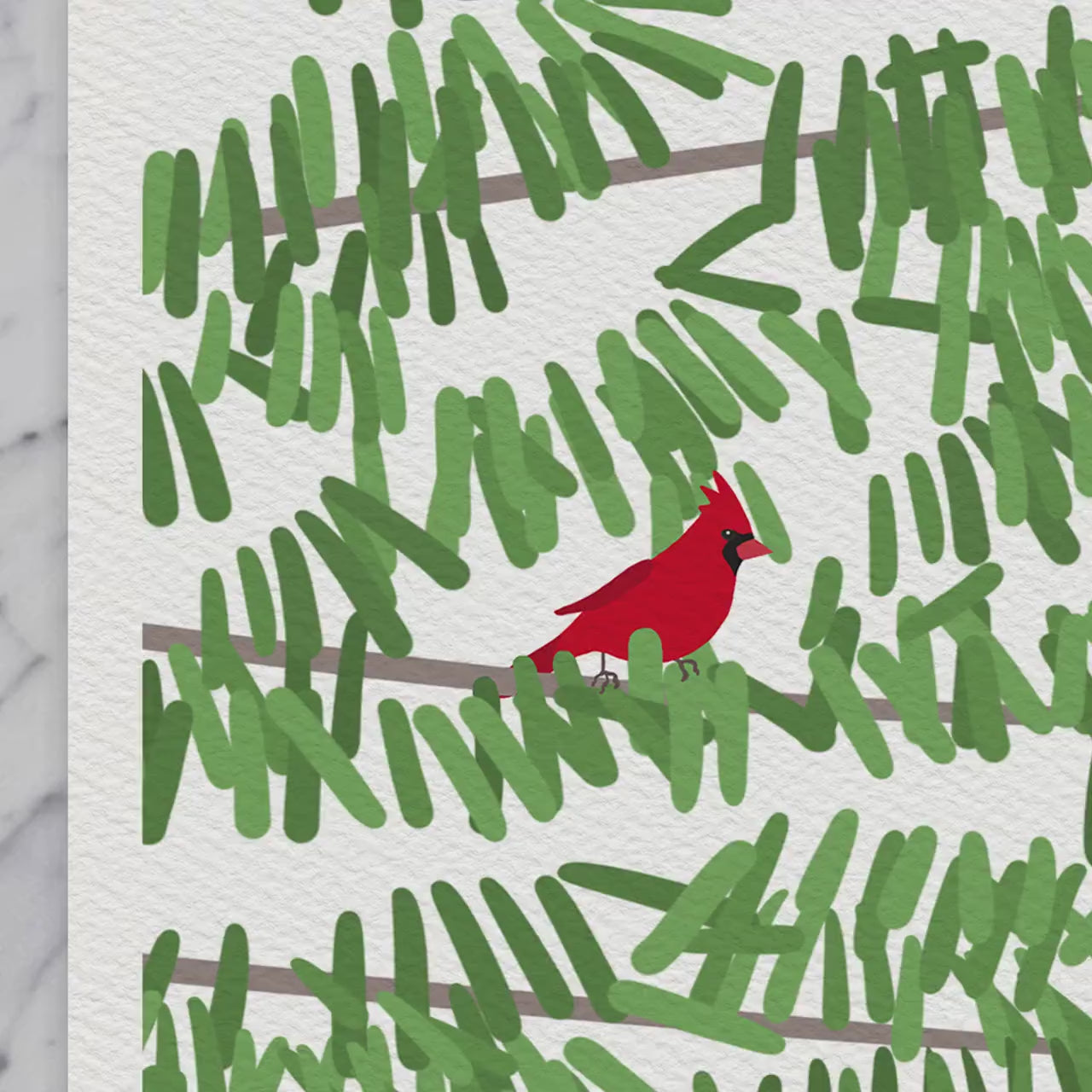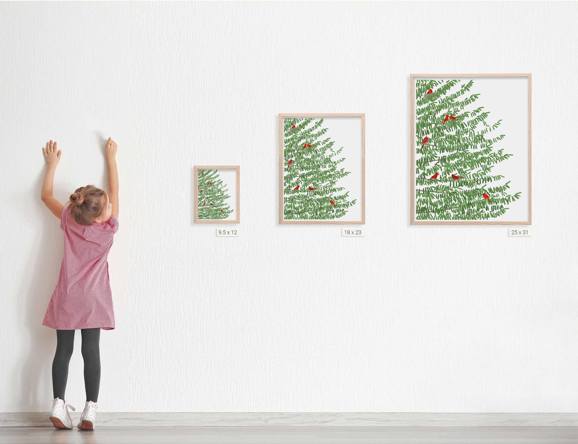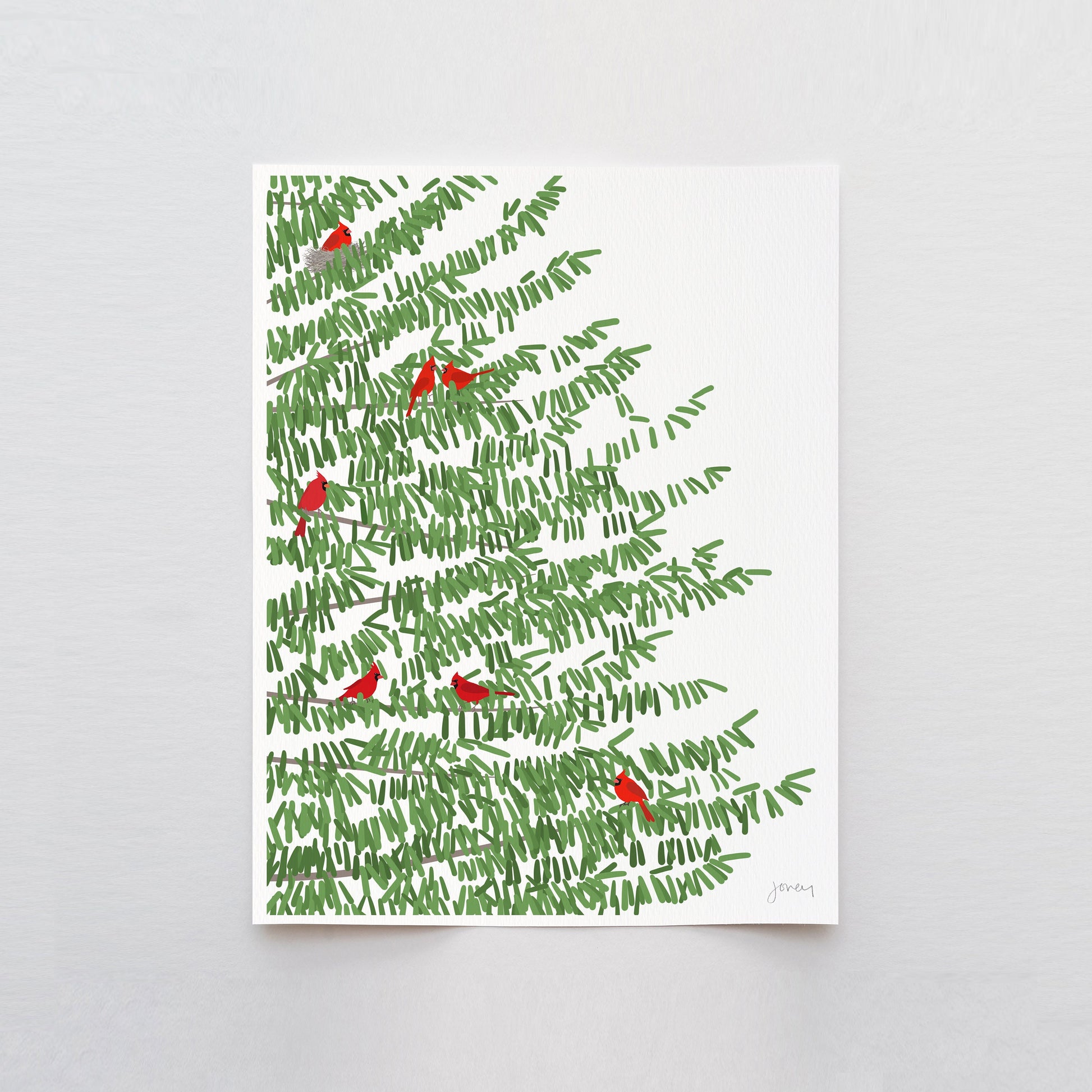 Bring the serene beauty of nature into your home with our "Pine Tree Print with Red Cardinal Birds" art print, a perfect addition to any wall.