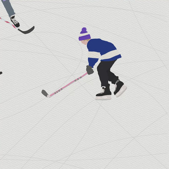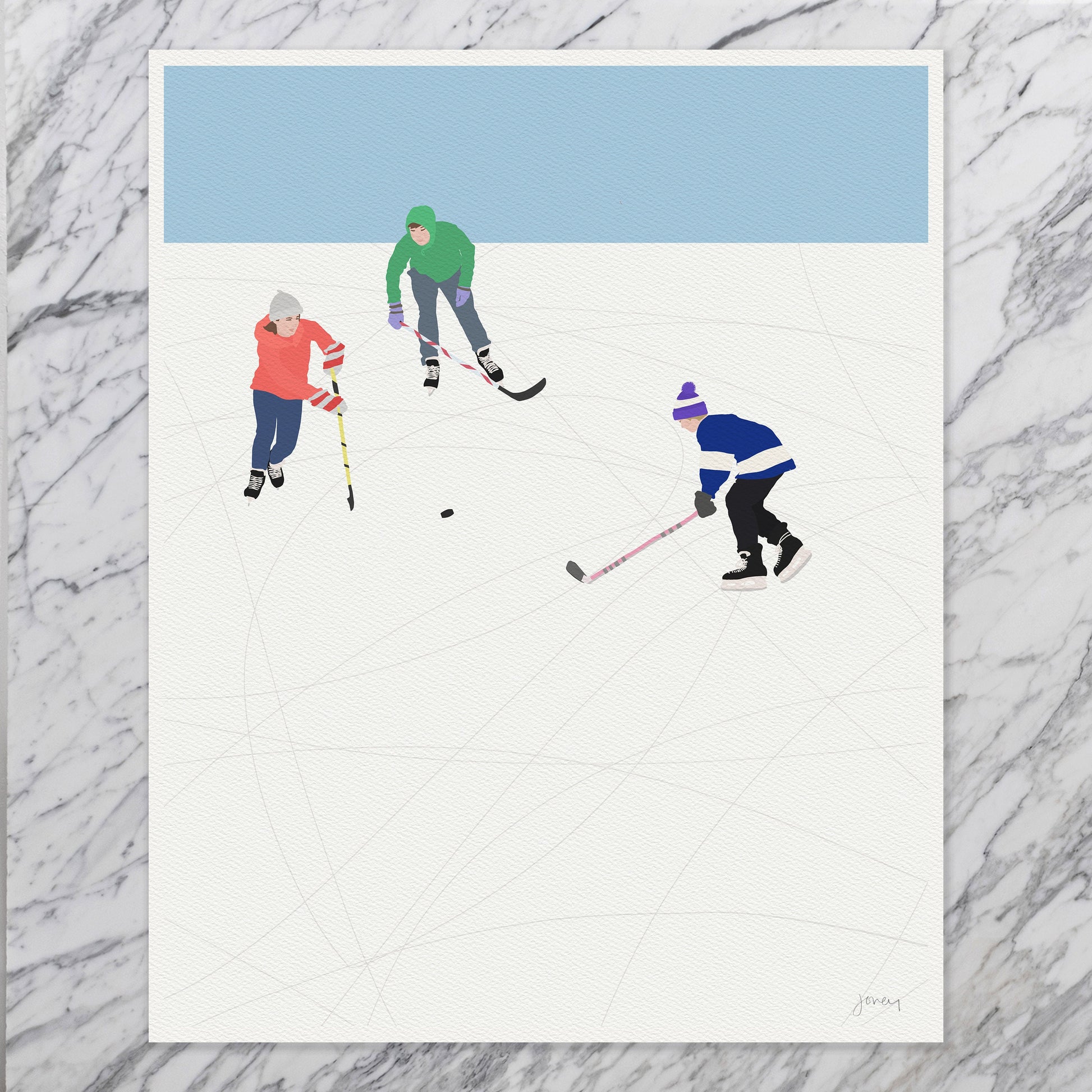 Capture the magic of winter with this Pond Hockey Art Print. Inspired by my kids' first attempts at skating on the ice pond near our New England home, this artwork brings the joy and exhilaration of outdoor winter activities to any space.