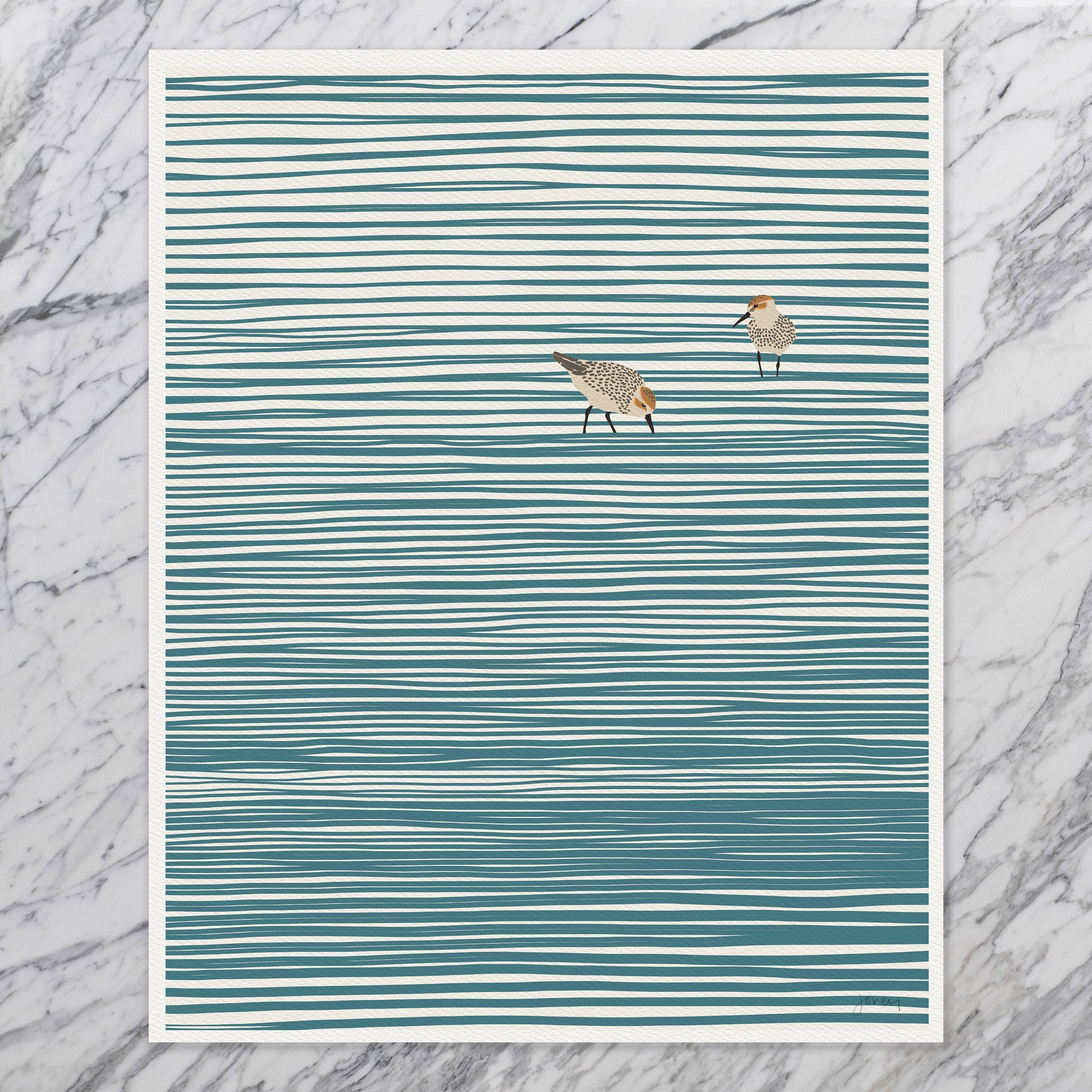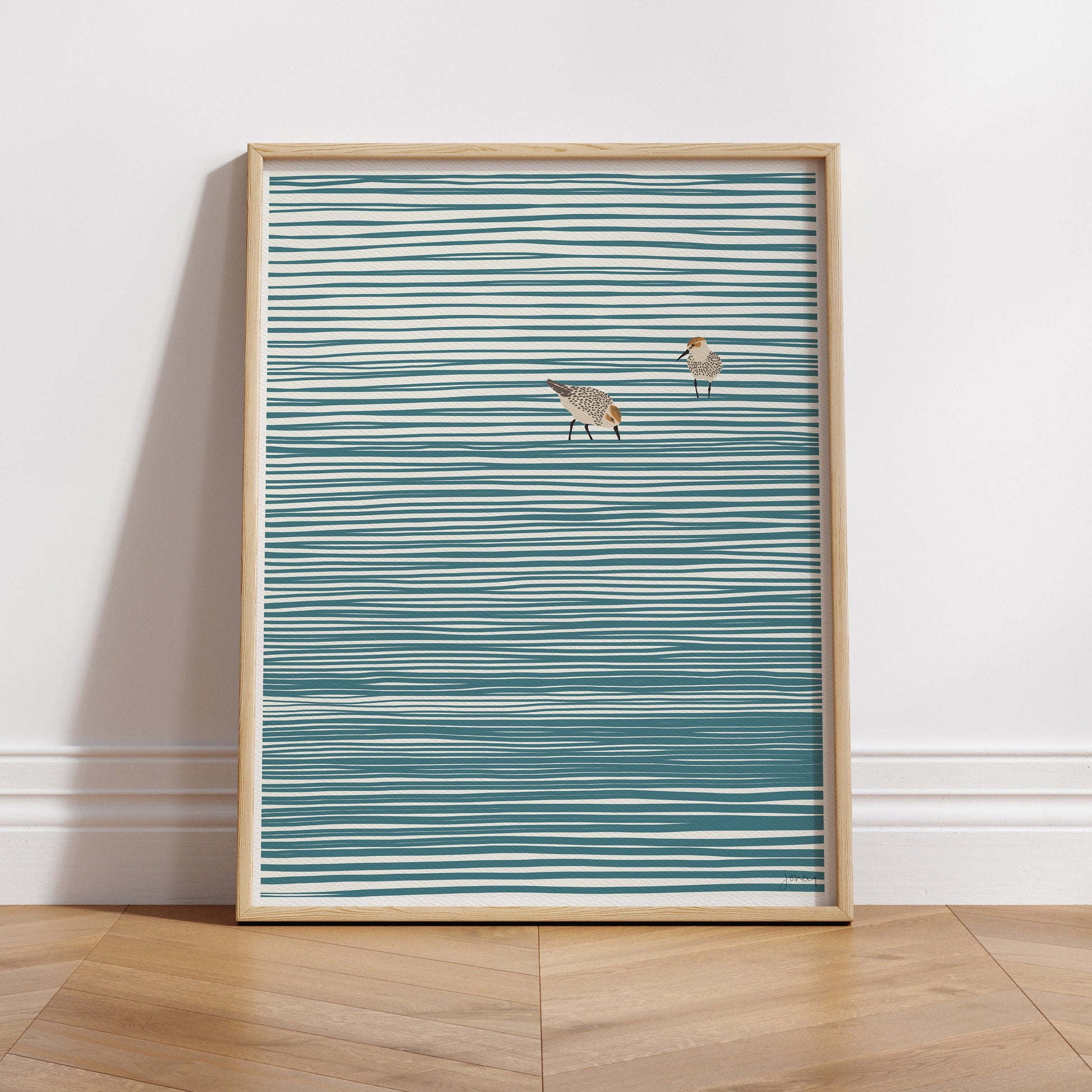 Bring the serene beauty of coastal life into your home with our 'Sandpipers' art print. This delightful piece captures the charm of these coastal birds in a moment of peaceful seaside exploration.