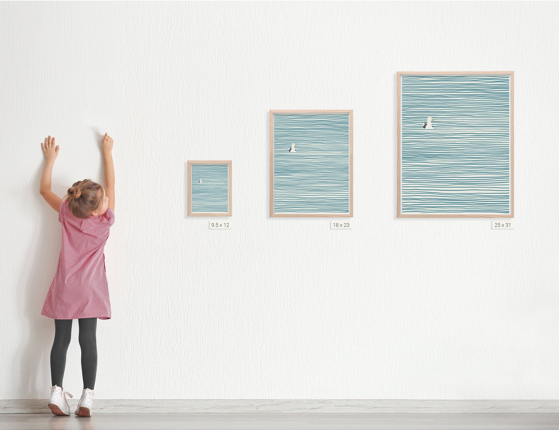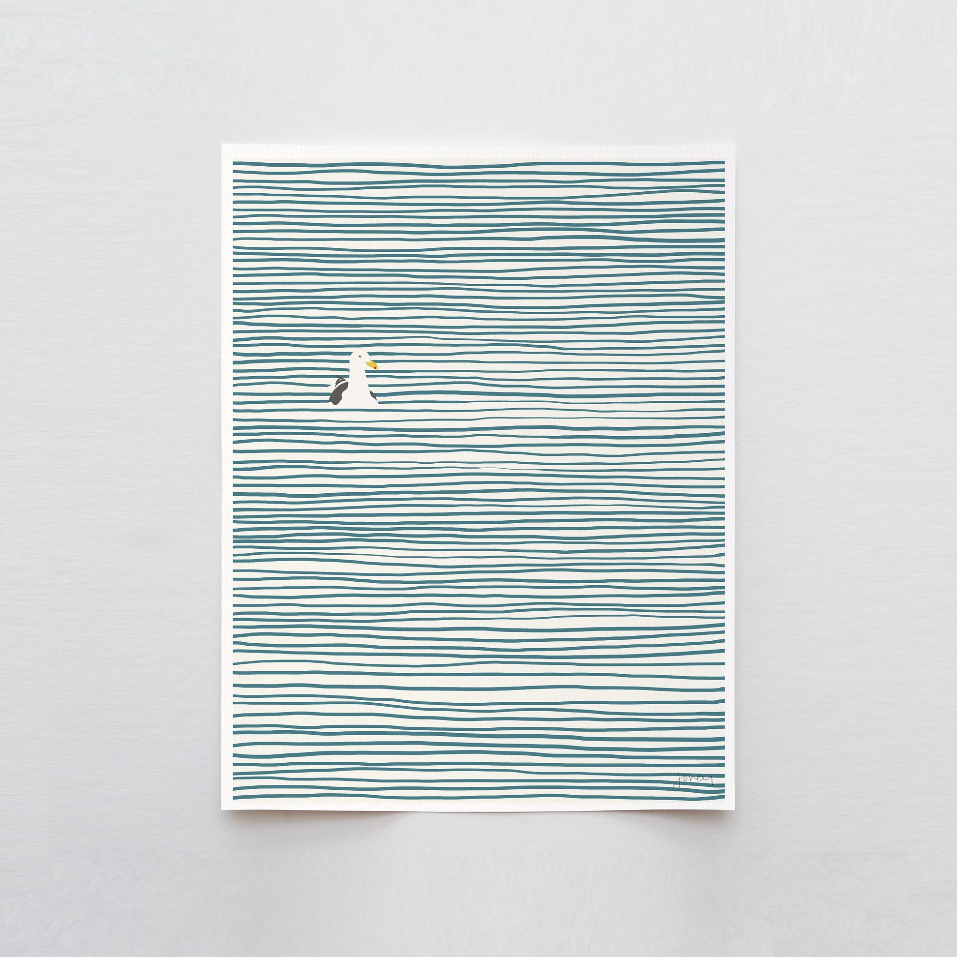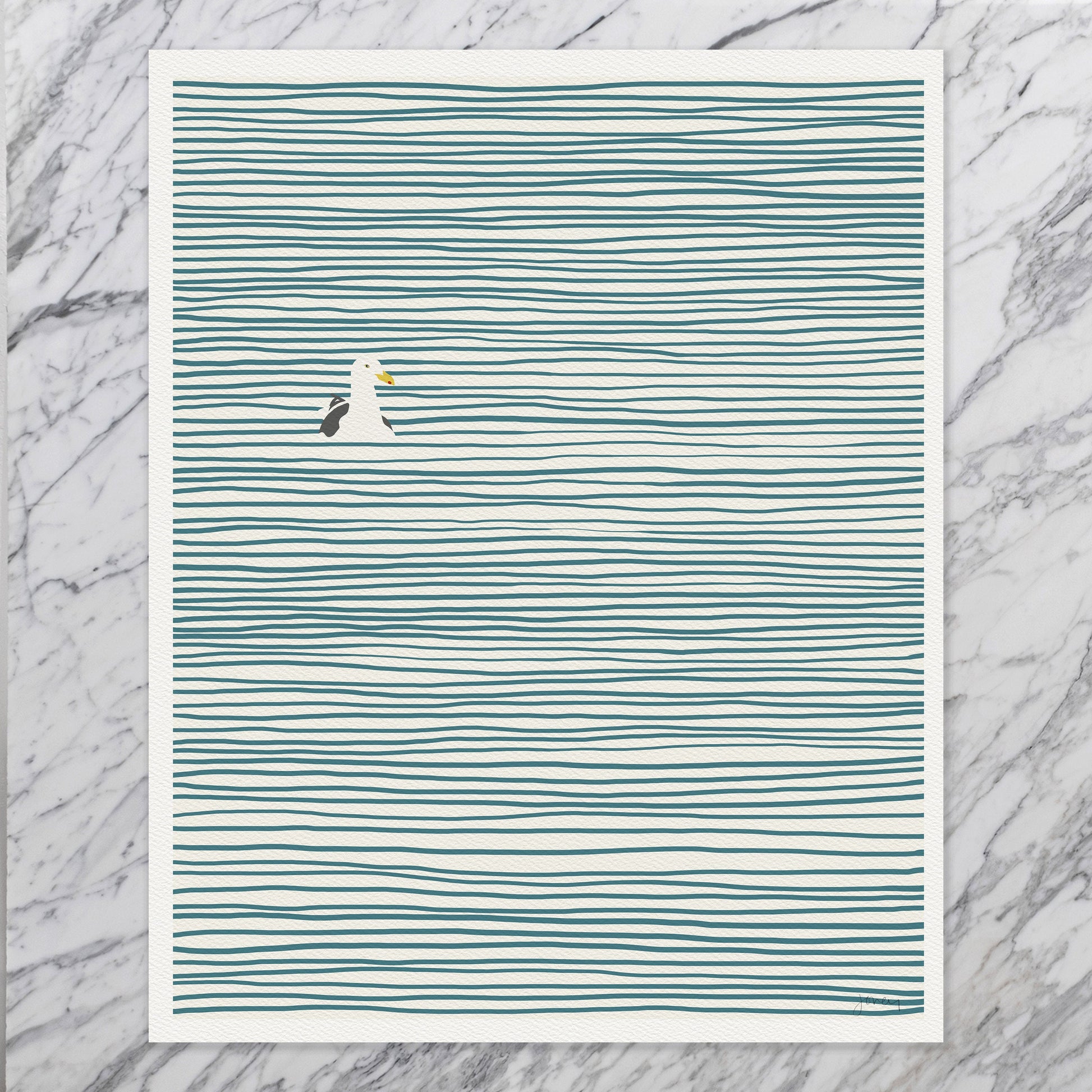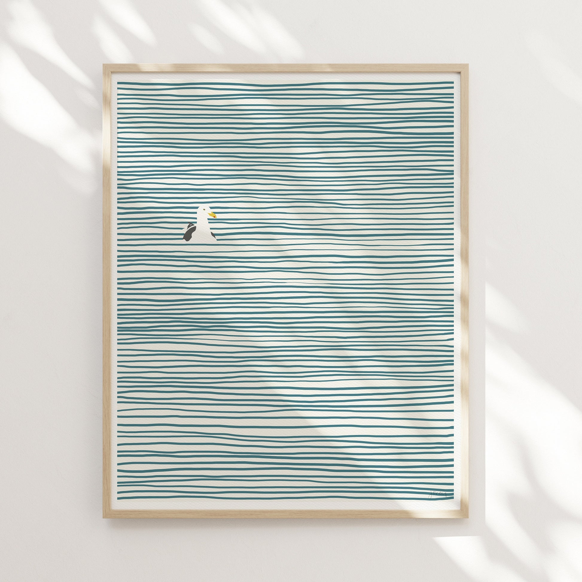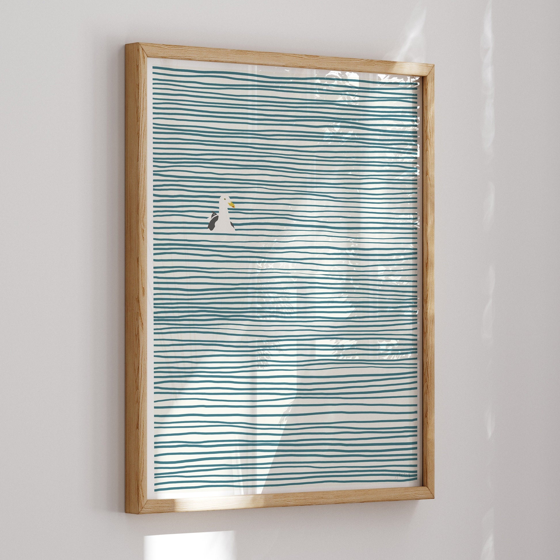 Bring the calming presence of seagulls and coastal waters to your living space with this Seagull on Striped Water Art Print. Perfect for beach lovers, or those seeking to create a waterside ambiance in their home.