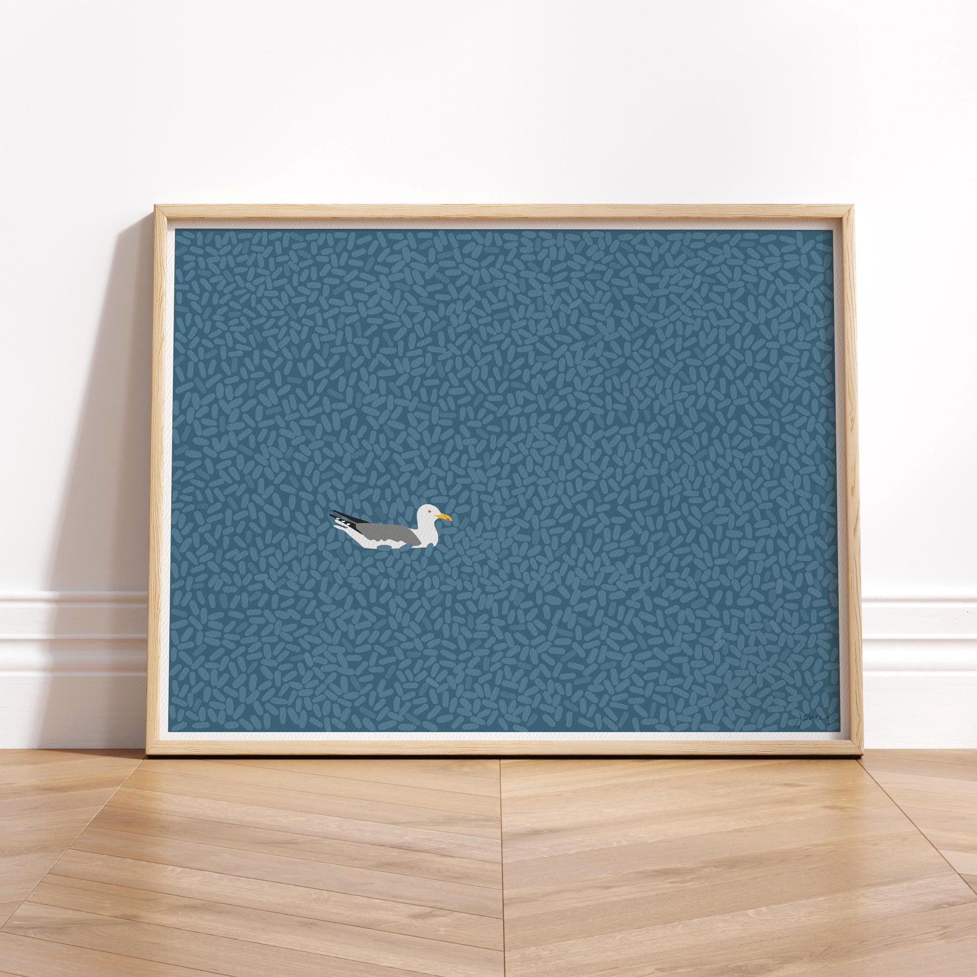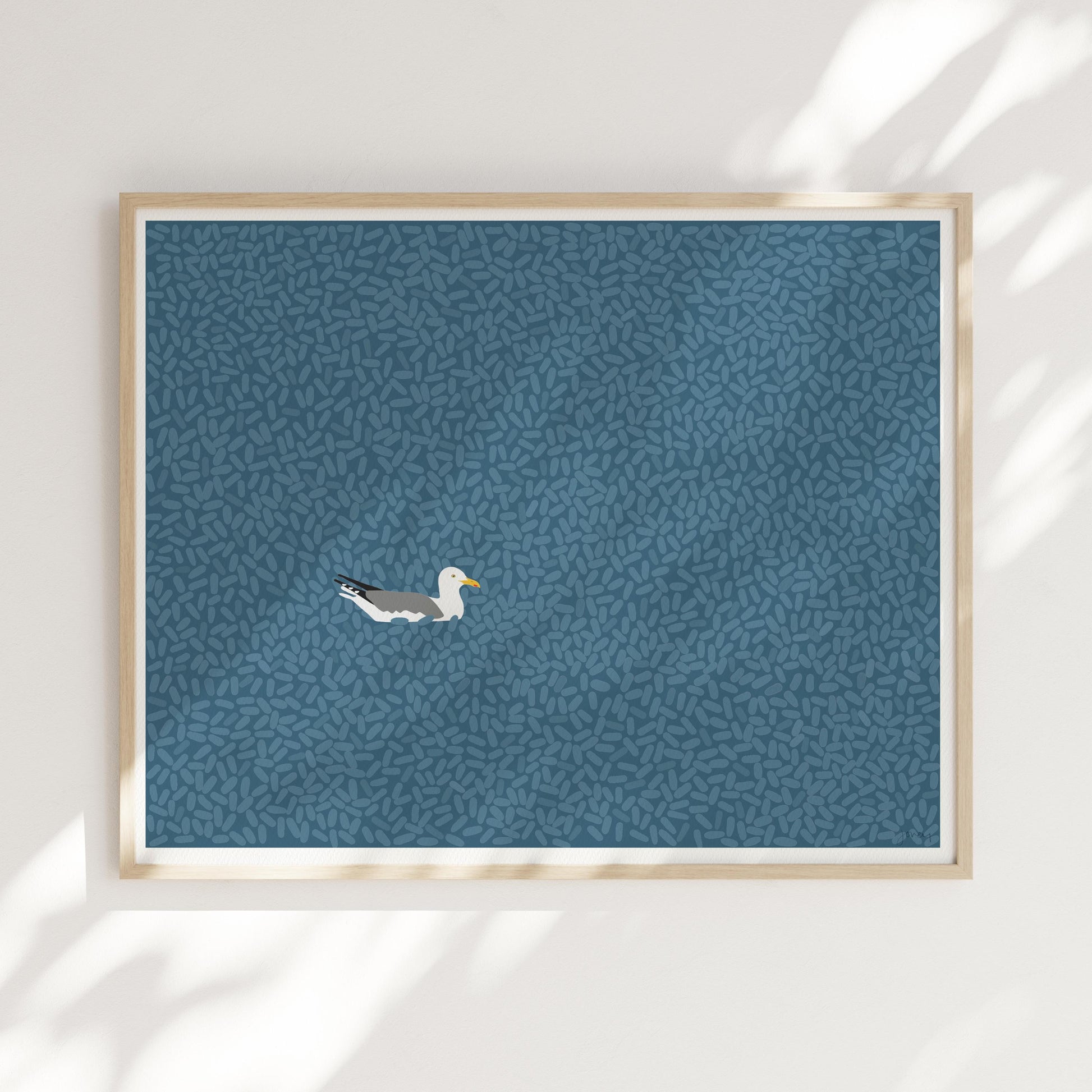 Capture a moment of coastal serenity with my art print of a seagull floating in a sea of windy water. Inspired by the tranquil beauty of a day at the beach, this artwork brings the calming sights and sounds of a day at the beach into your home.