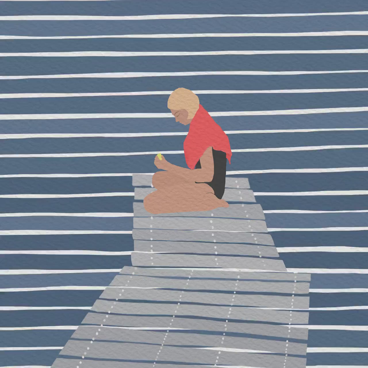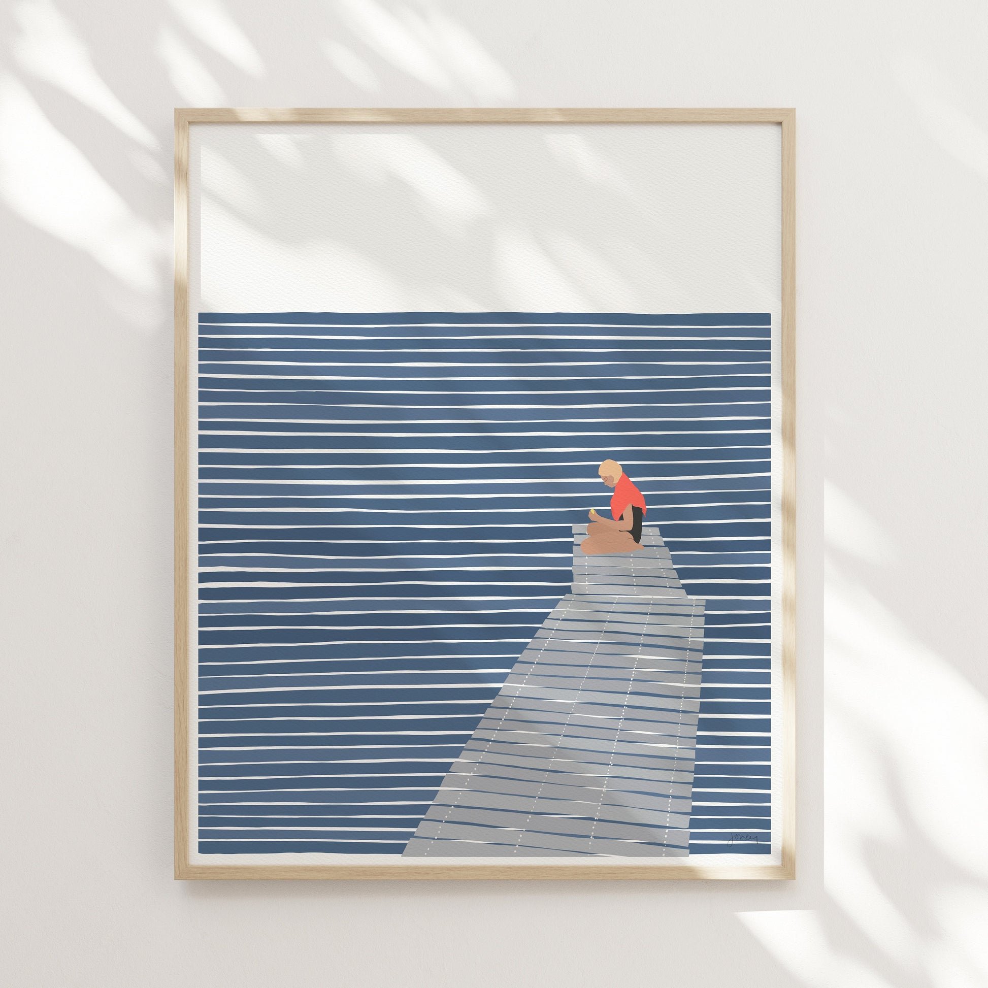 Capture the essence of serene waterside moments with this enchanting art print of a girl sitting on a dock. Inspired by our family's cherished annual visit to the lakes of New Hampshire, this piece beautifully encapsulates the tranquility of a girl lost in her thoughts on a peaceful dock.
