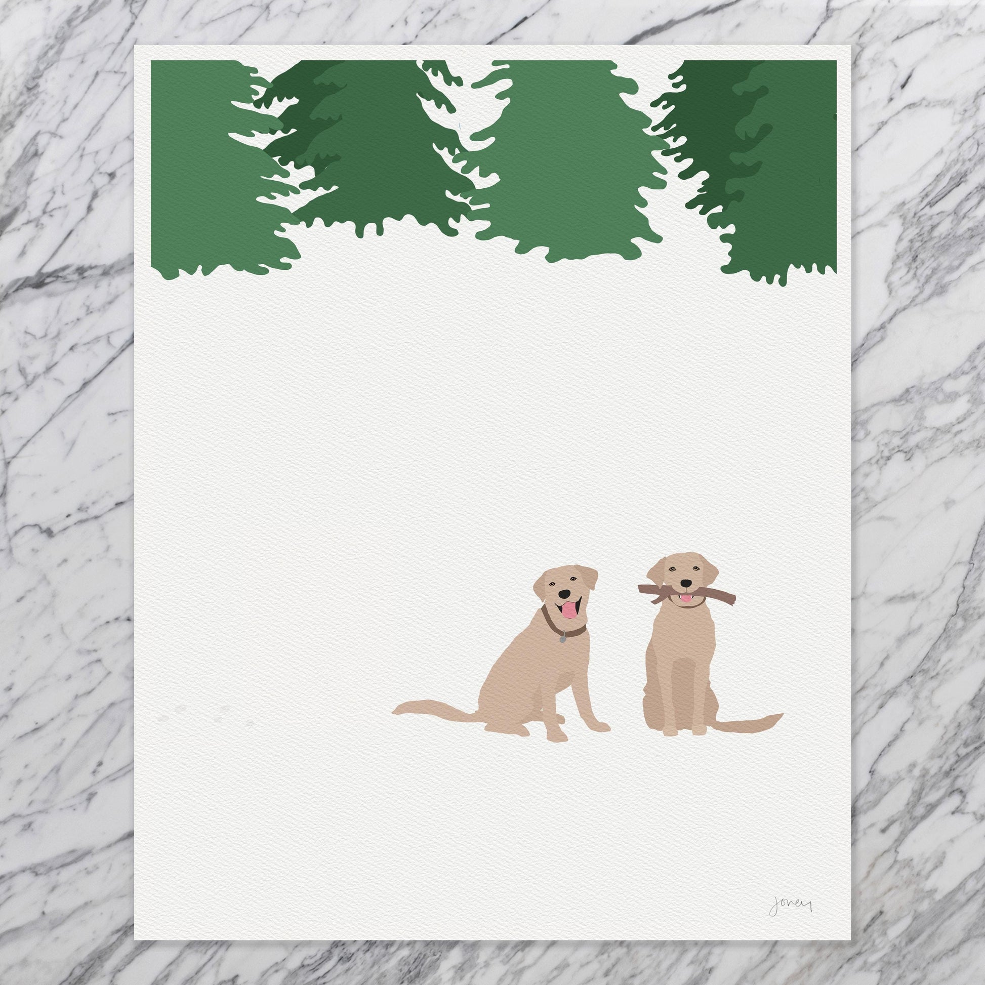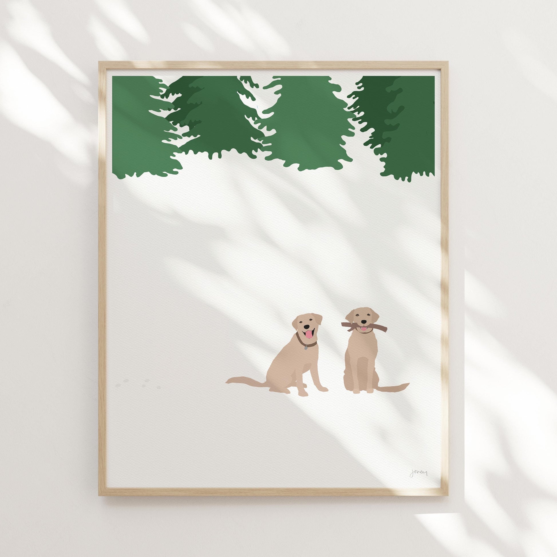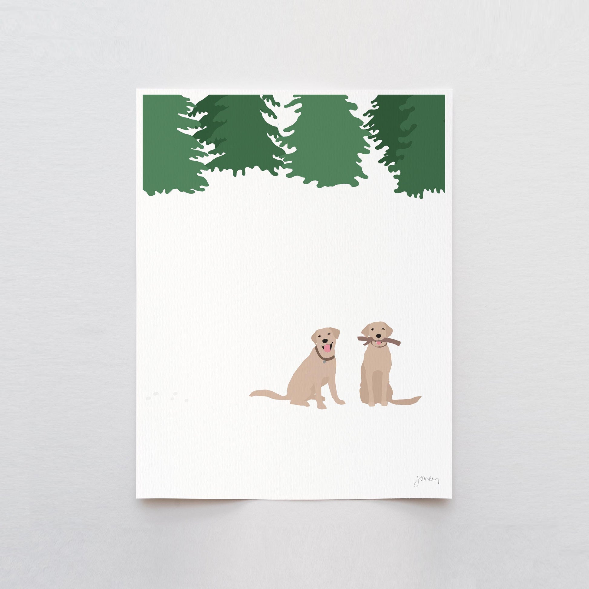 Enter a winter wonderland with this "Snowy Labradors Art Print." Inspired by the sight of our beloved dog frolicking in the backyard during her first New England winter, this artwork brings a touch of snowy charm to any space.