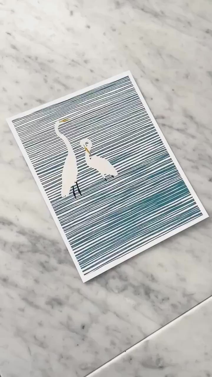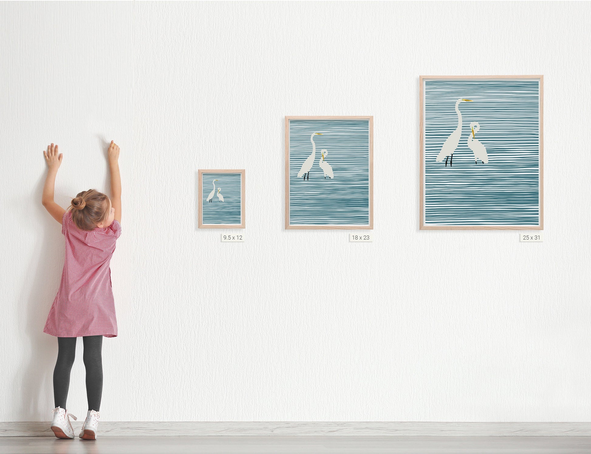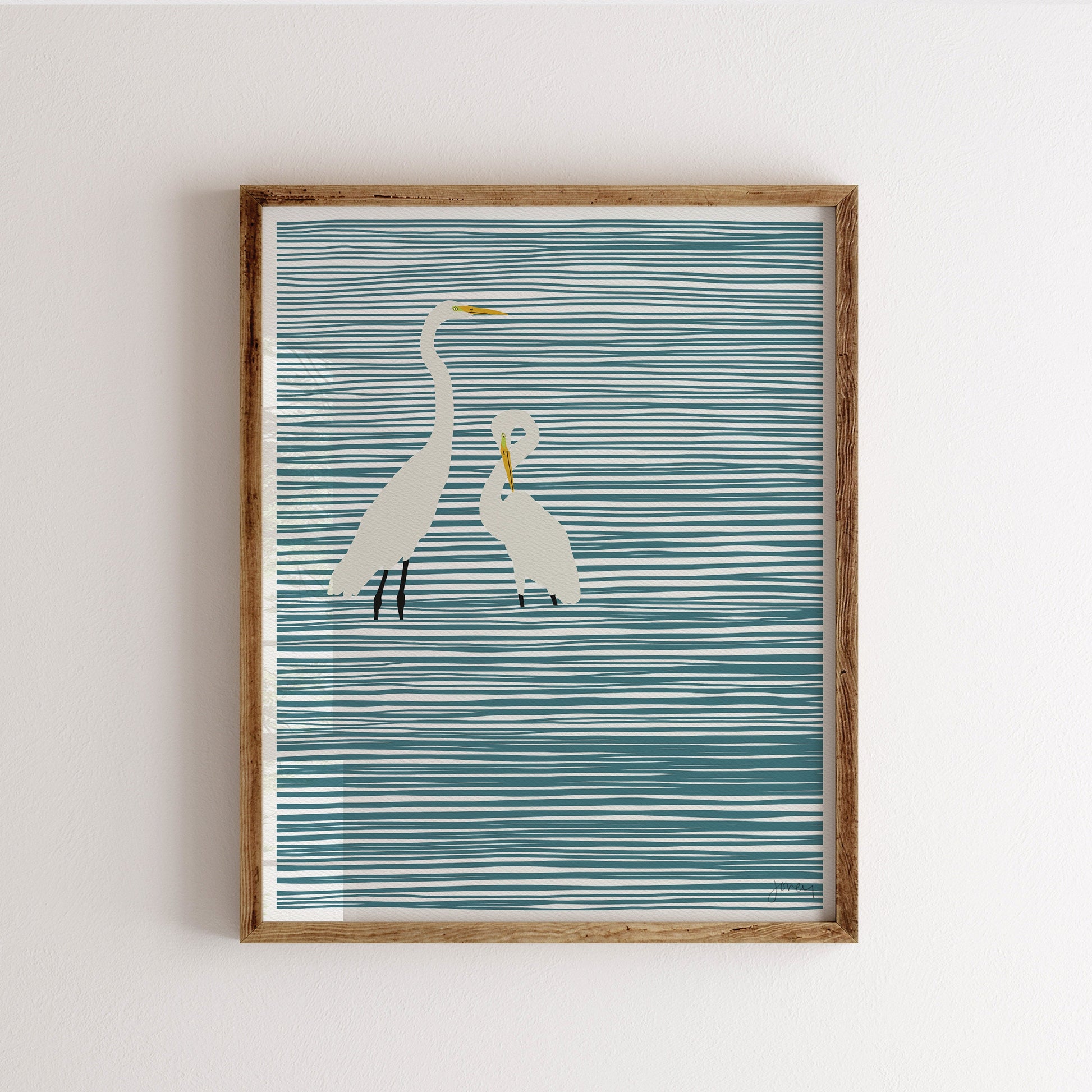 Bring coast into your home with our 'Striped Water with Egrets' art print, a timeless addition to any art collection.