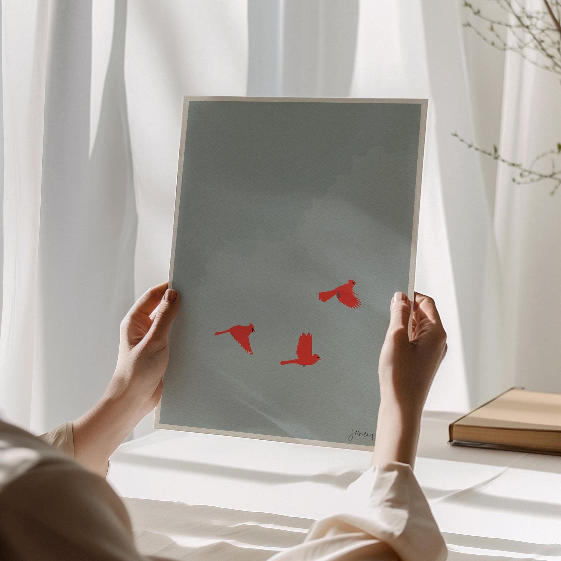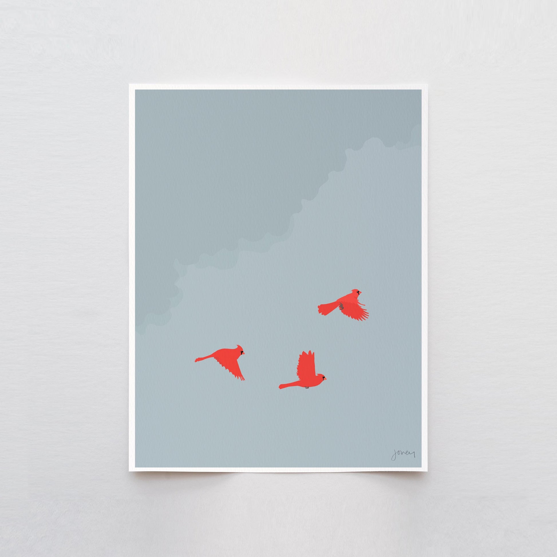 Bring joy to your space with red cardinals soaring into the clouds in my "Three Cardinals" art print. Inspired by the graceful presence of cardinals perched in the branches of our birch tree.
