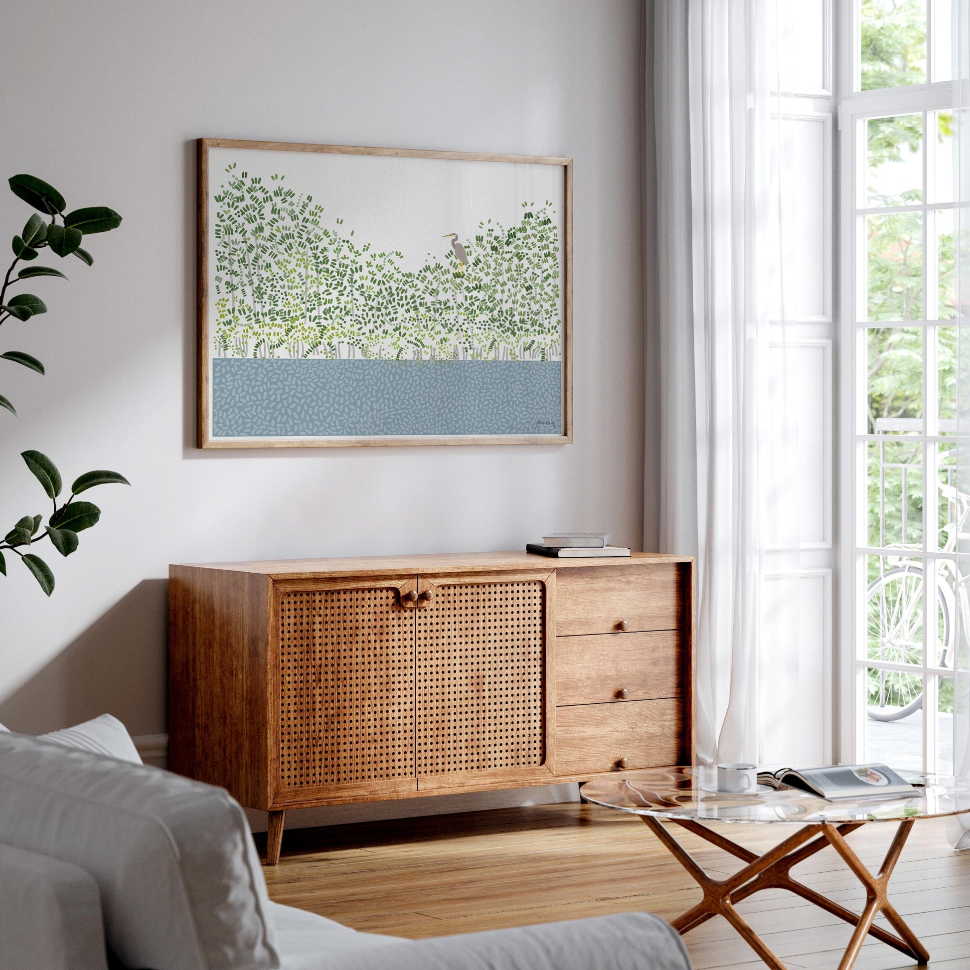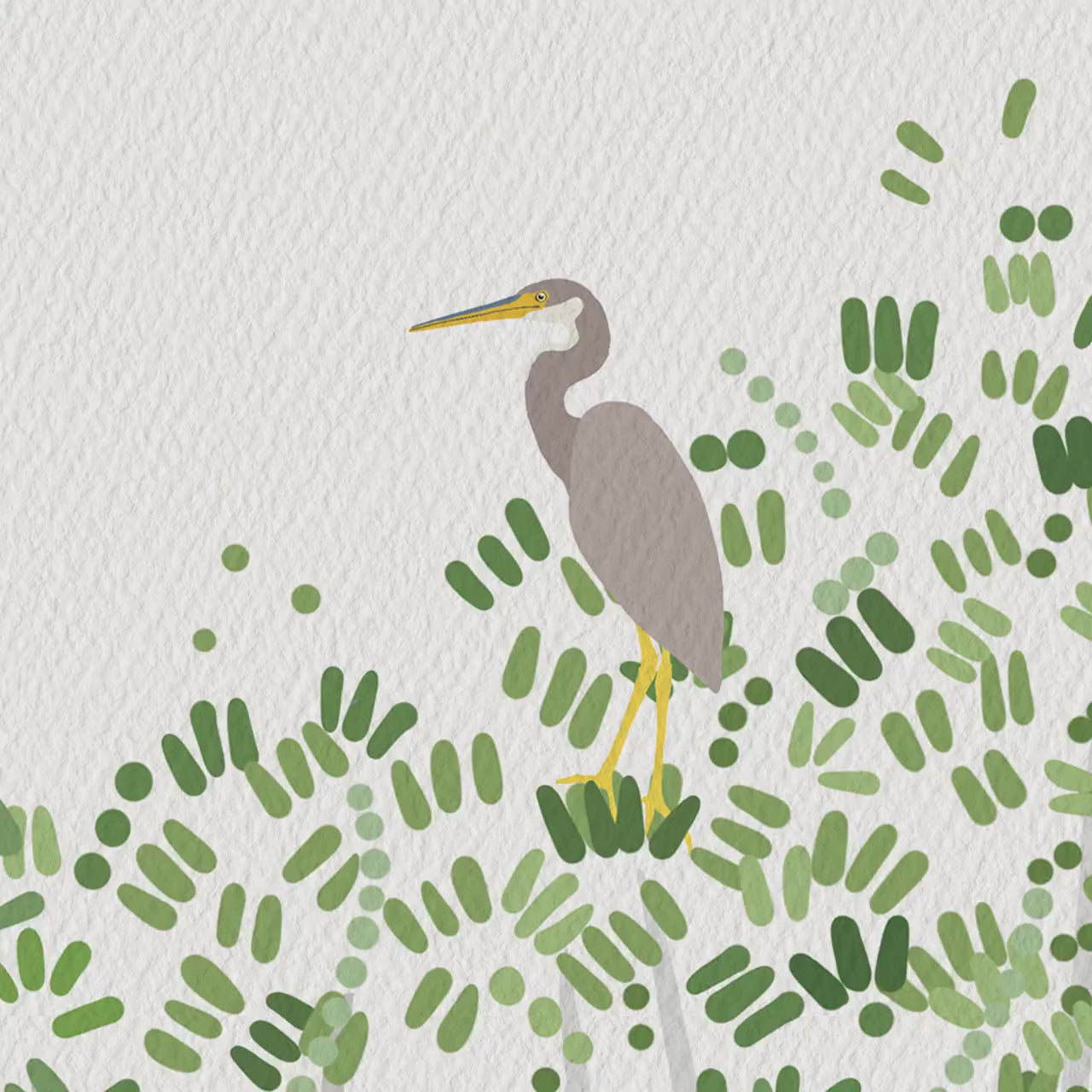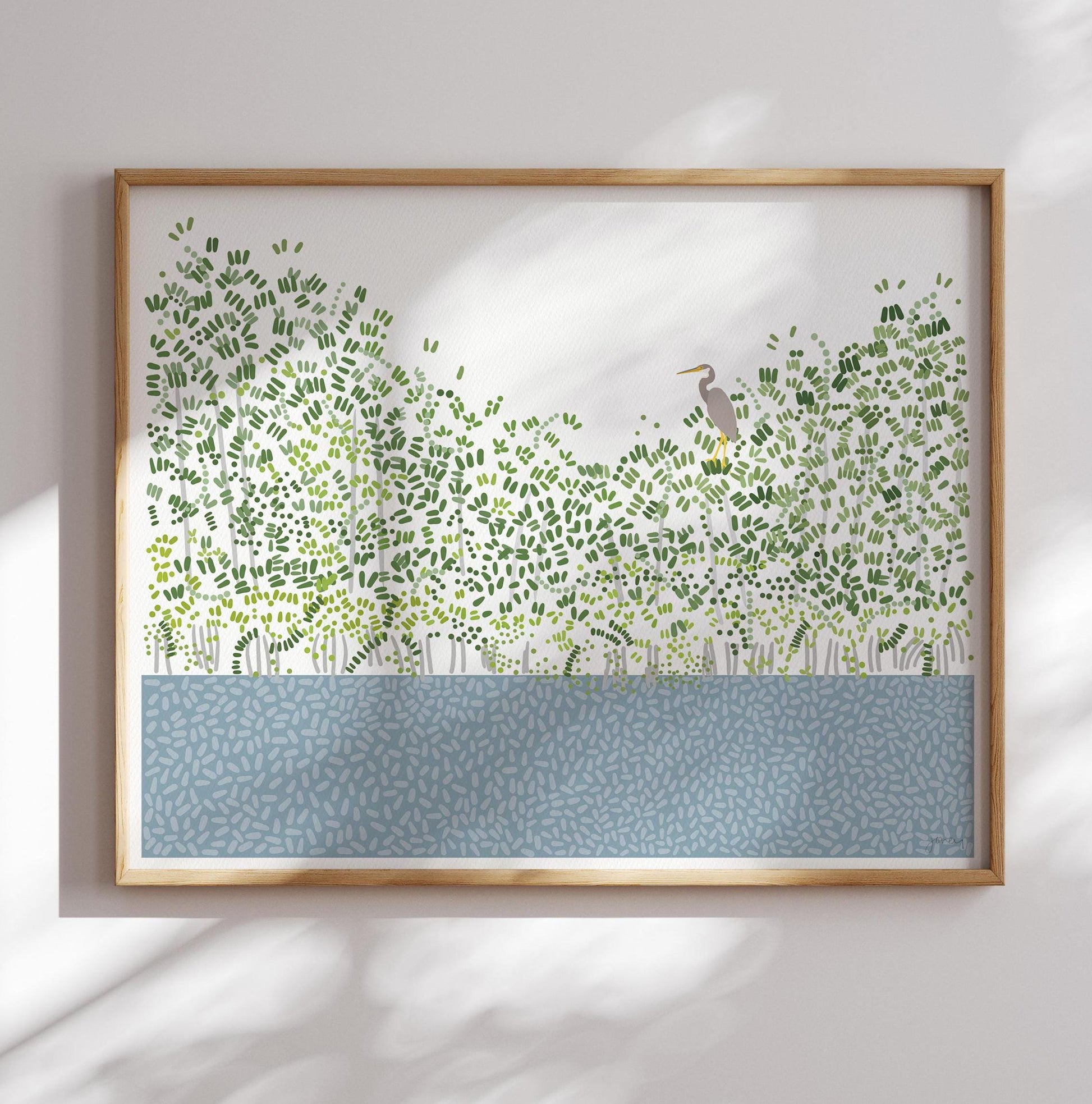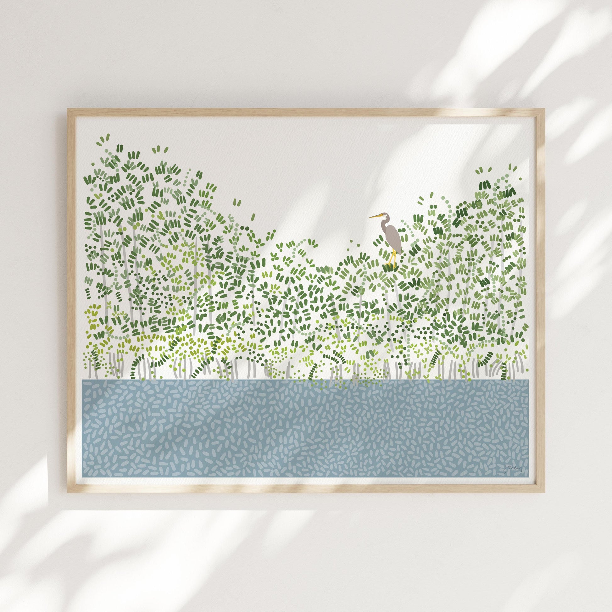 Printed on high-quality archival paper, this art print abstractly depicts the heron amidst the tranquil mangrove. The intricate details and serene palette bring to life the stillness and harmony of the environment. Each print is thoughtfully created, signed, and printed by me, ensuring its authenticity and adding a personal touch.