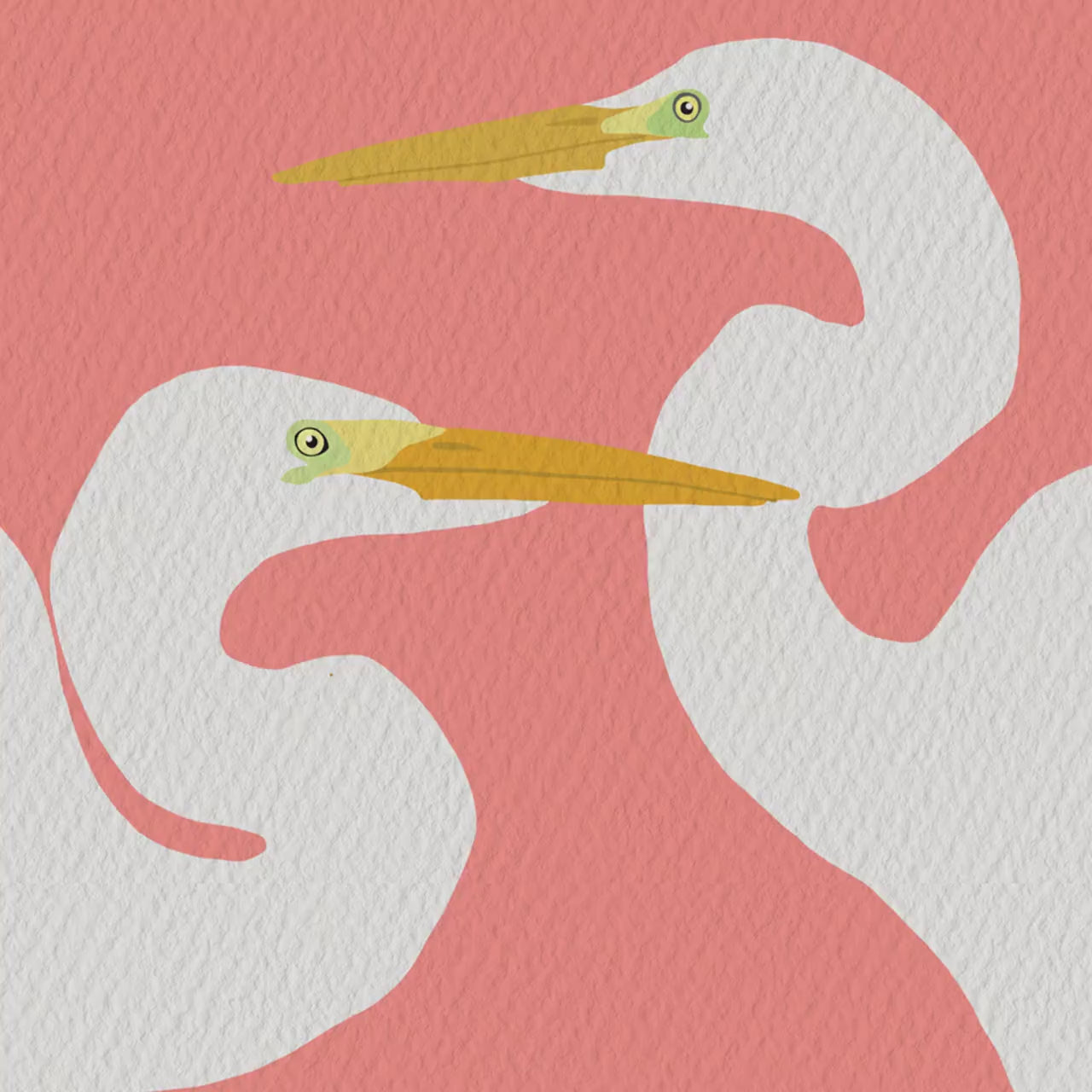 This coastal bird artwork captures two egrets standing in quiet stillness, their presence calm and focused. With a soft, restrained color palette and a balanced, modern composition, the piece reflects the peaceful experience of observing birds in their natural habitat. There’s very little happening — and that’s the point. It’s about attention, patience, and the beauty of restraint.