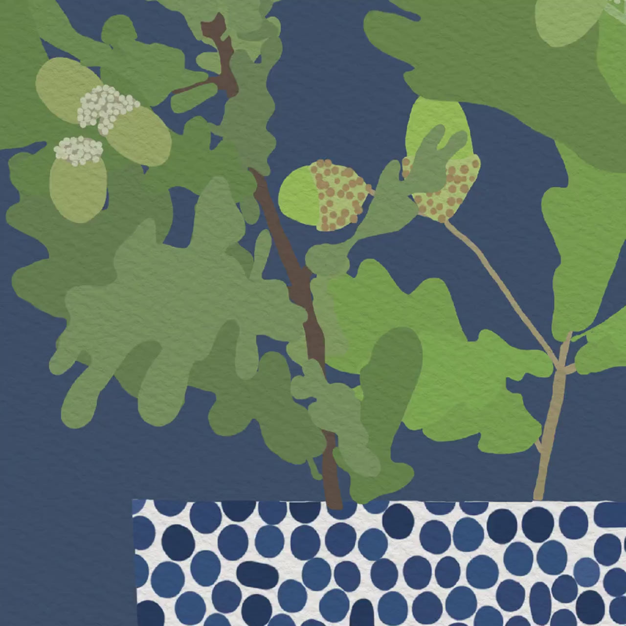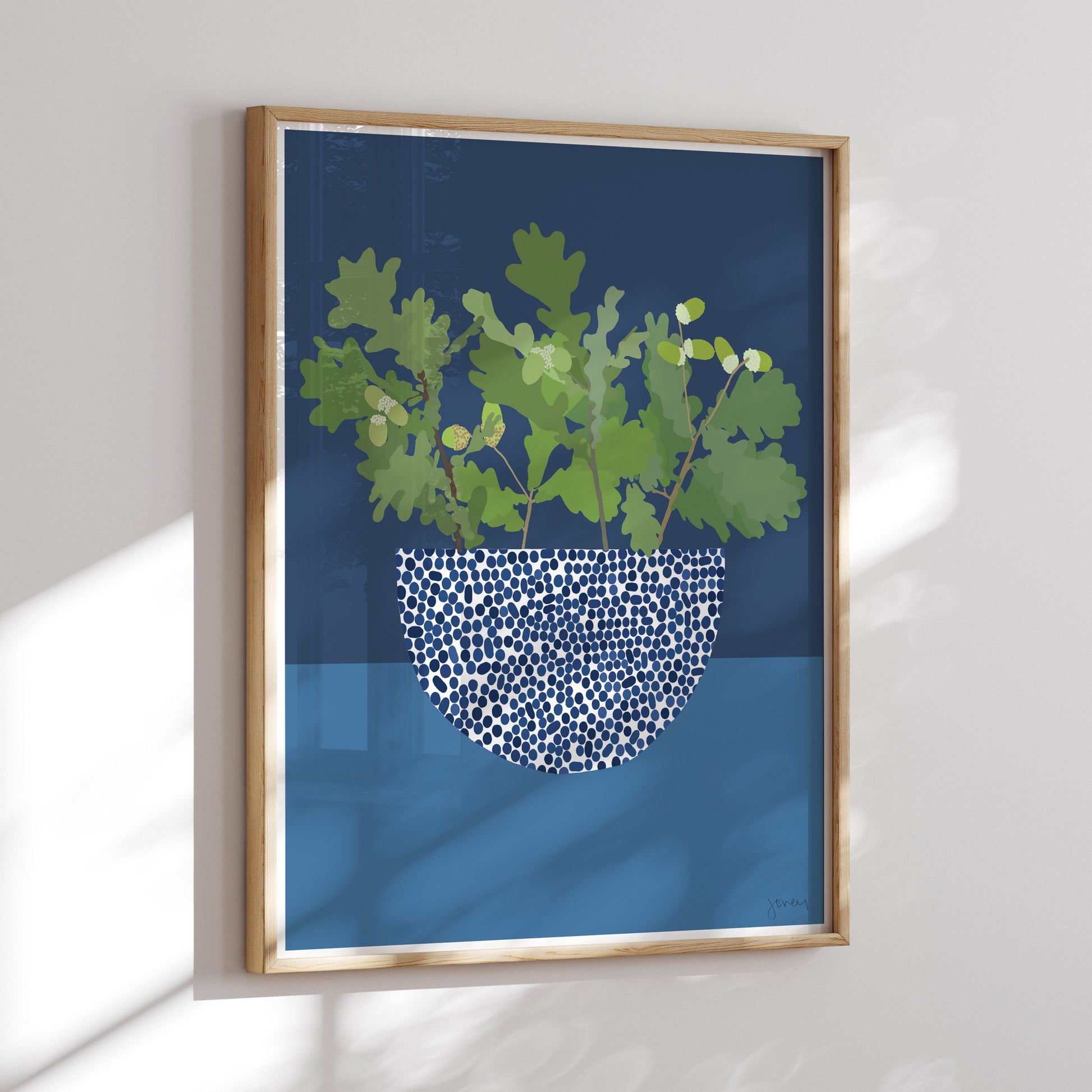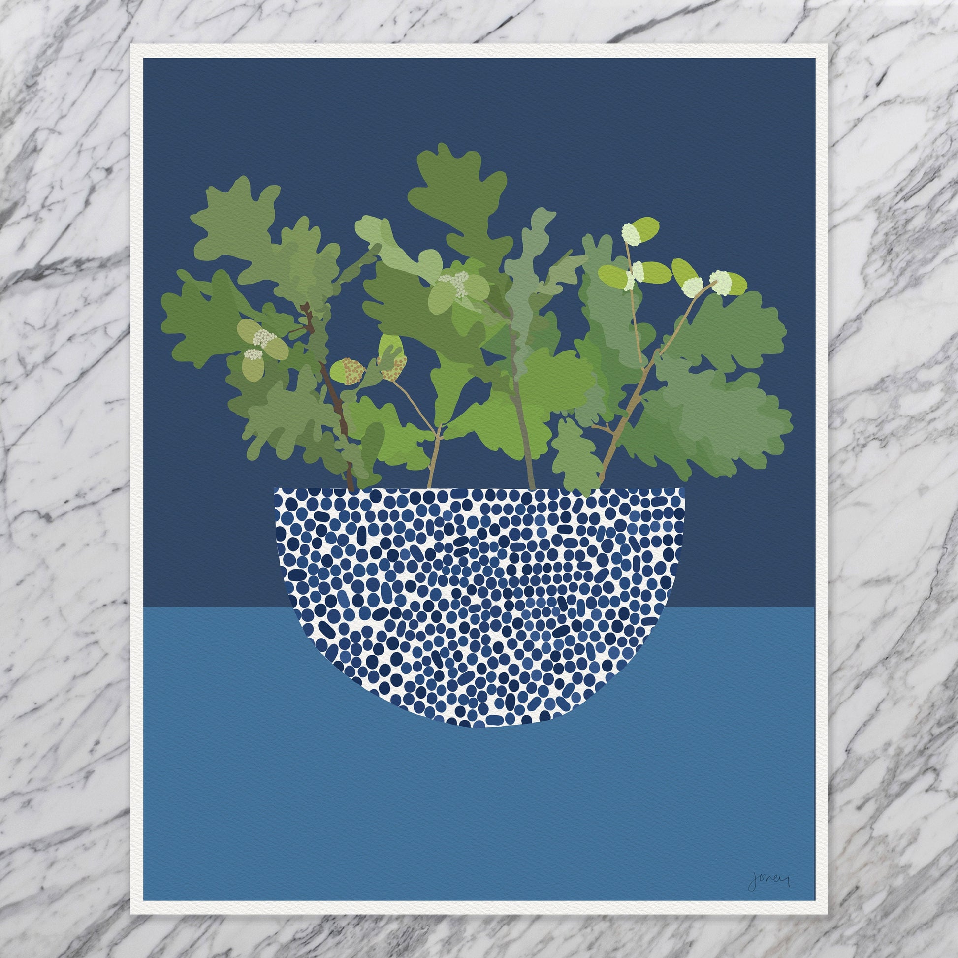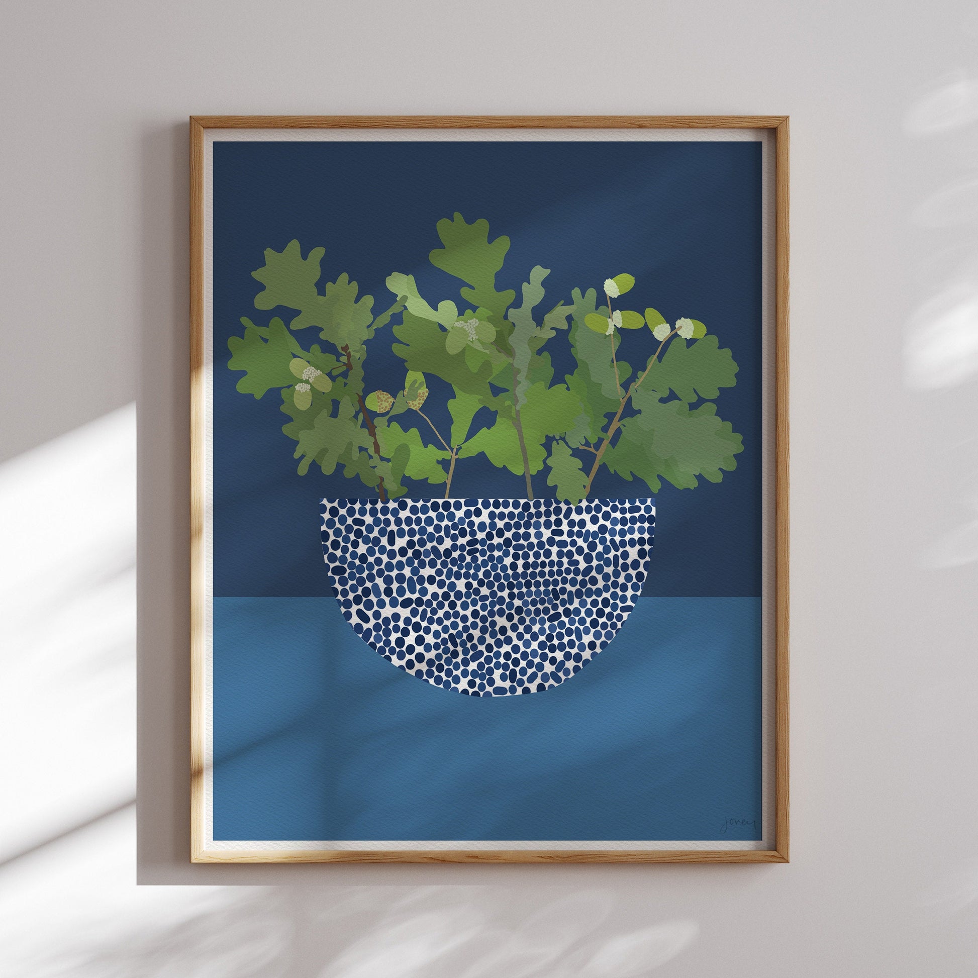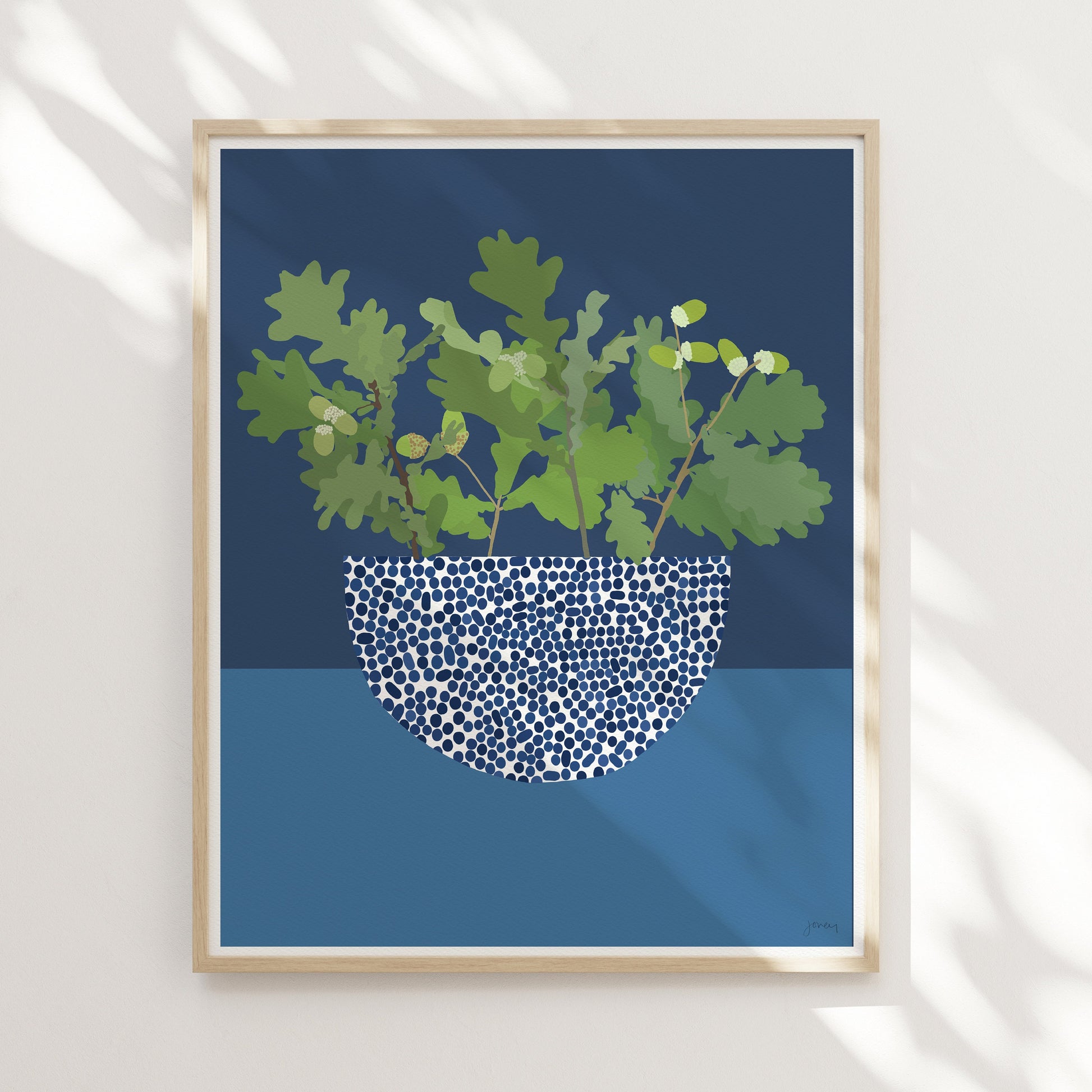 Bring a touch of nature into your space with my "Valley Oak Branches Art Print." In a nod to the timeless traditions of still life painting, this print captures the shapes and colors of oak branches in an abstract polka dot vase.