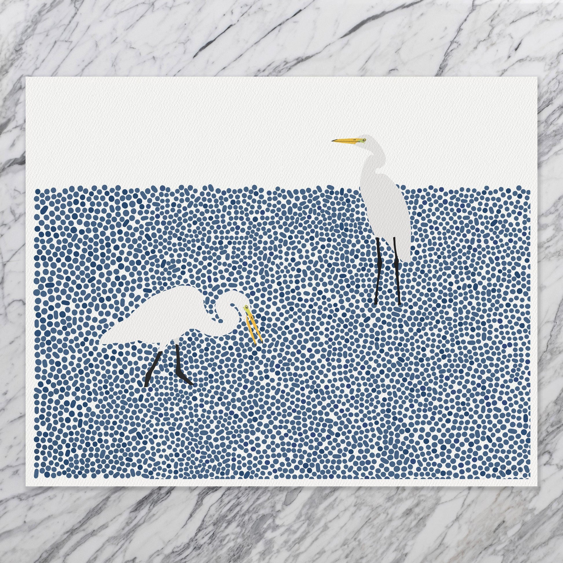 Embark on a peaceful journey into the heart of coastal beauty with my "Wading Egrets Landscape " art print. This abstract piece captures the grace and elegance of a pair of egret exploring their local wetland.