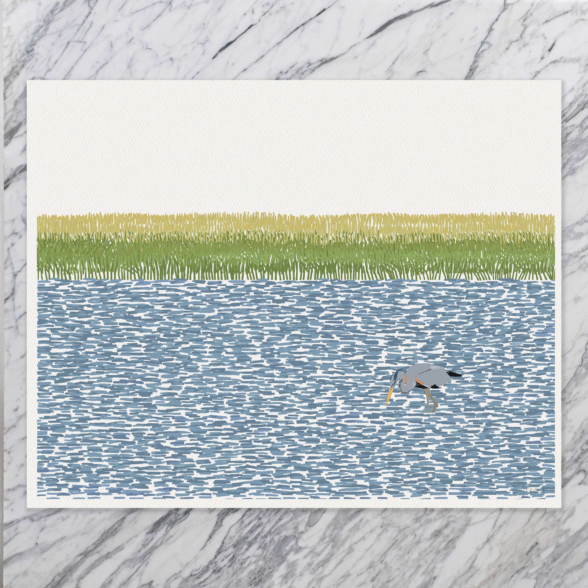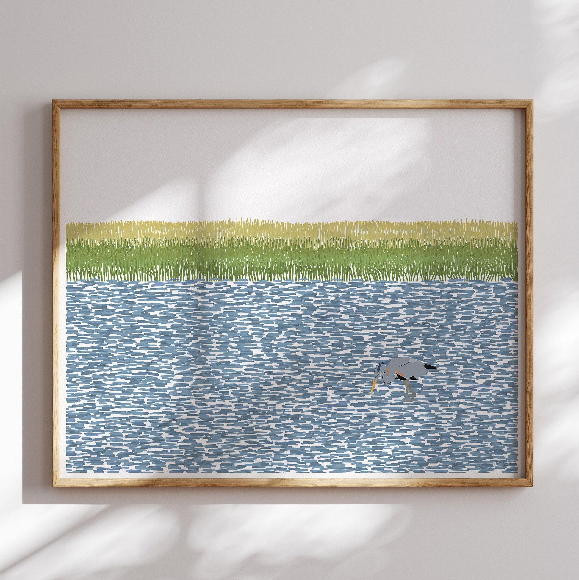 Immerse yourself in the wonderful world of the marsh with this "Great Blue Heron Art Print." Inspired by a boat trip up the Merrimack River in Massachusetts, this artwork captures the elegance and grace of the magnificent great blue heron in its natural habitat.